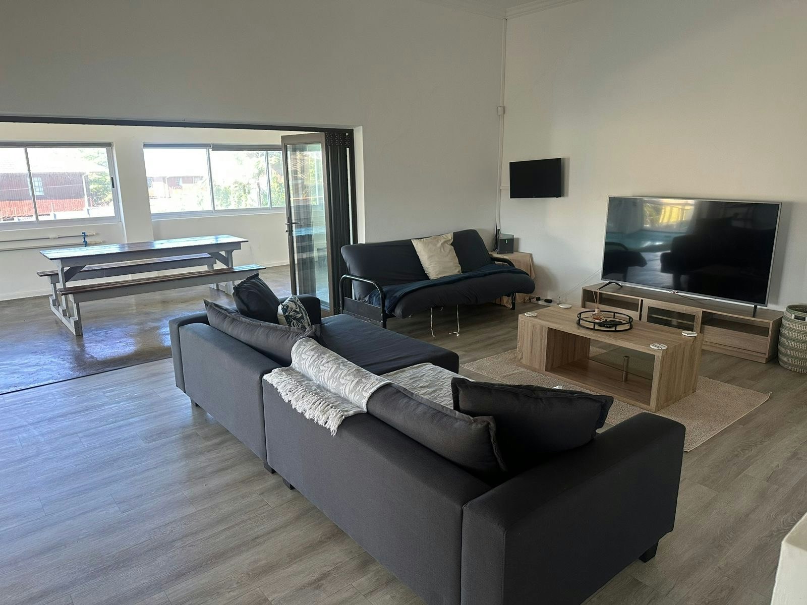 The open-plan living space features a dining table with chairs and a lounge furnished with a comfortable couch and TV. The kitchen is fully equipped with a double-door fridge-freezer, gas stove, oven, and microwave.