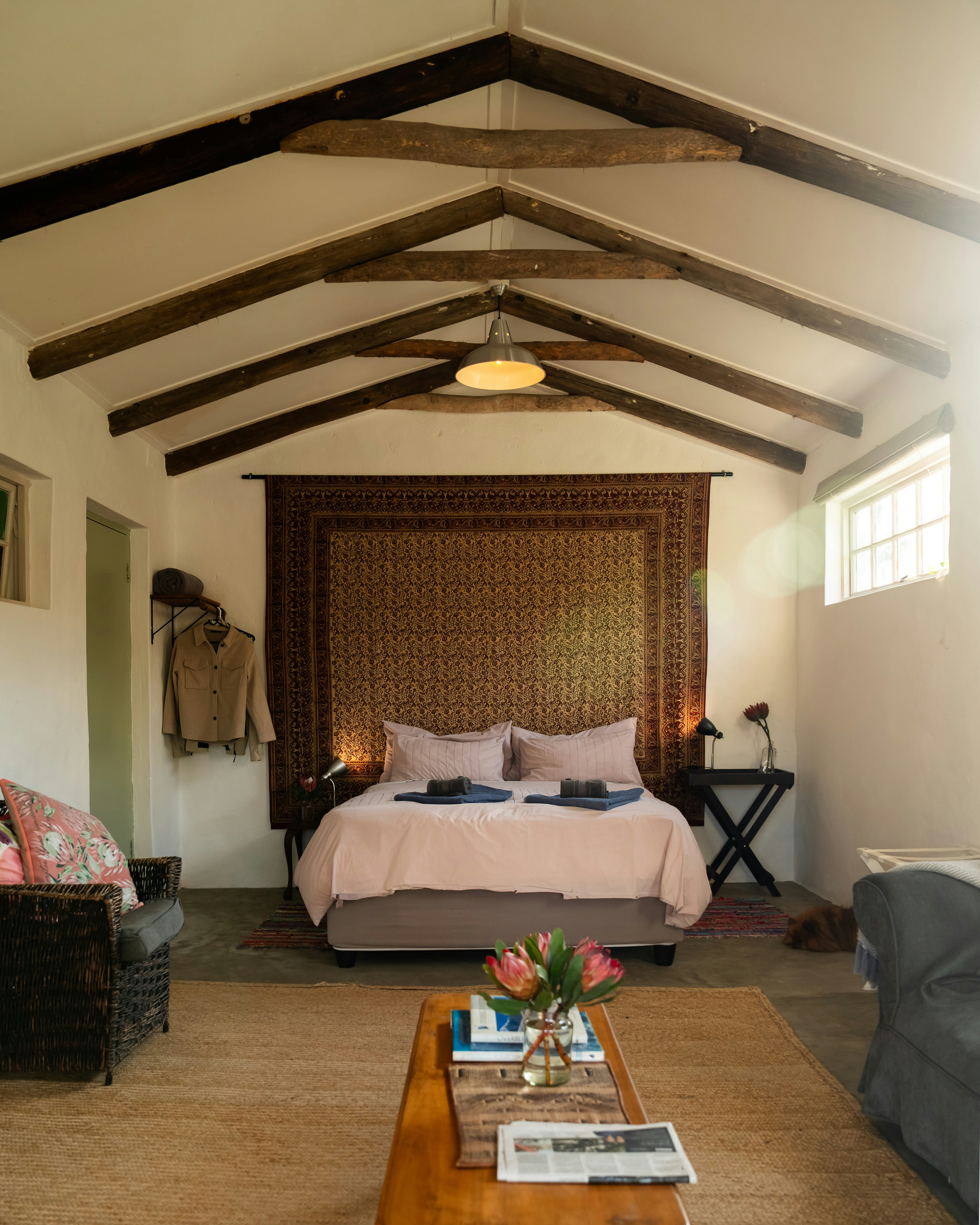 This charming farm cottage is located near the river, with views of the farm and mountains. The unit sleeps 4 guests in 2 bedrooms; the main bedroom has a queen-size bed, and the second room has twin beds which can be converted into a king-size bed. There is 1 shared bathroom with a shower. Each room opens onto a patio and a lovely, large garden. An additional 1 or 2 mattresses can be added on the floor for 1 or 2 children. The unit has a lounge with a fireplace, a kitchenette that contains a fridge and a stove, and a lovely protected courtyard with braai facilities. Pets can be accommodated upon request. The cottage is about 80 m from the river.