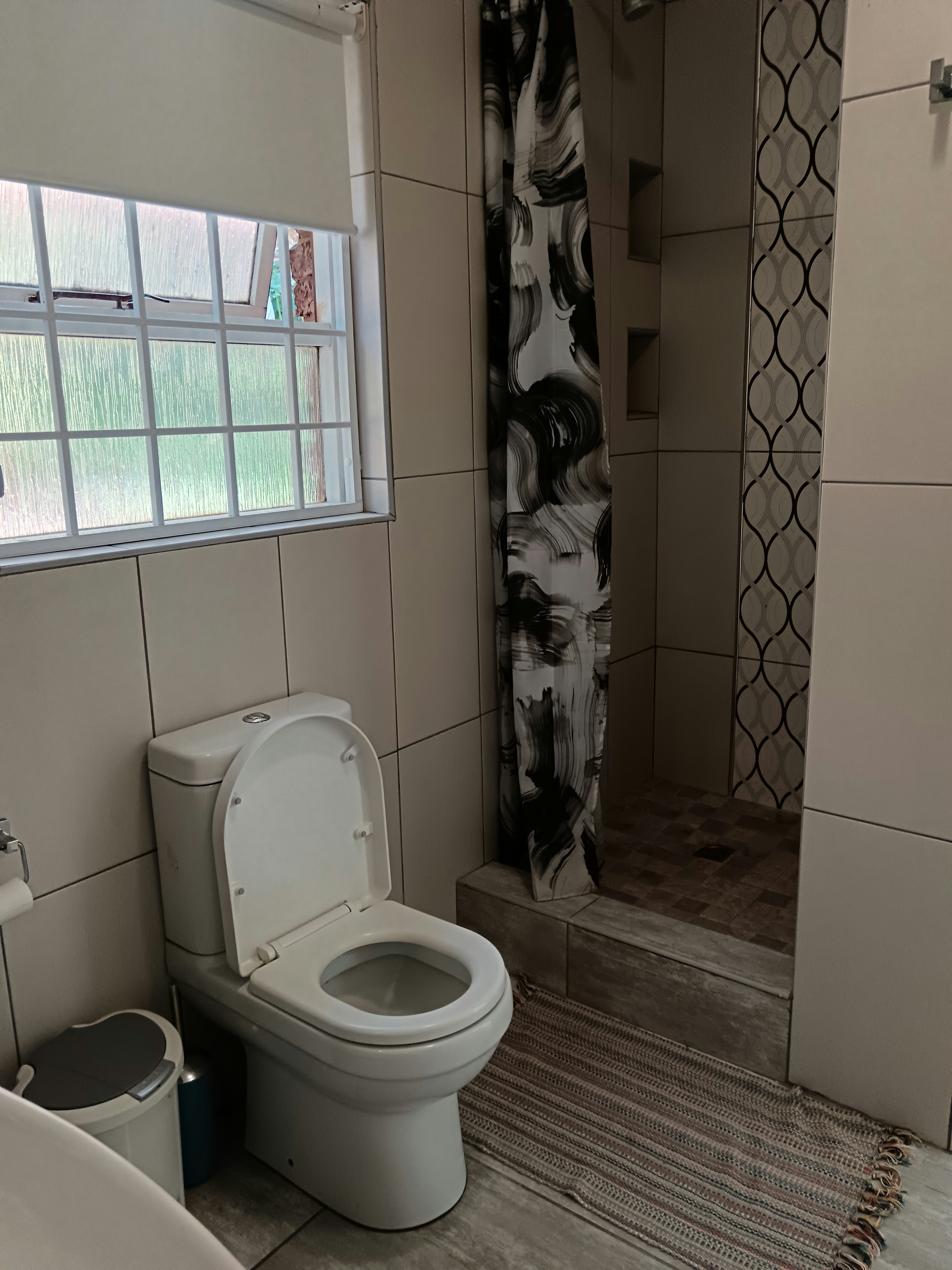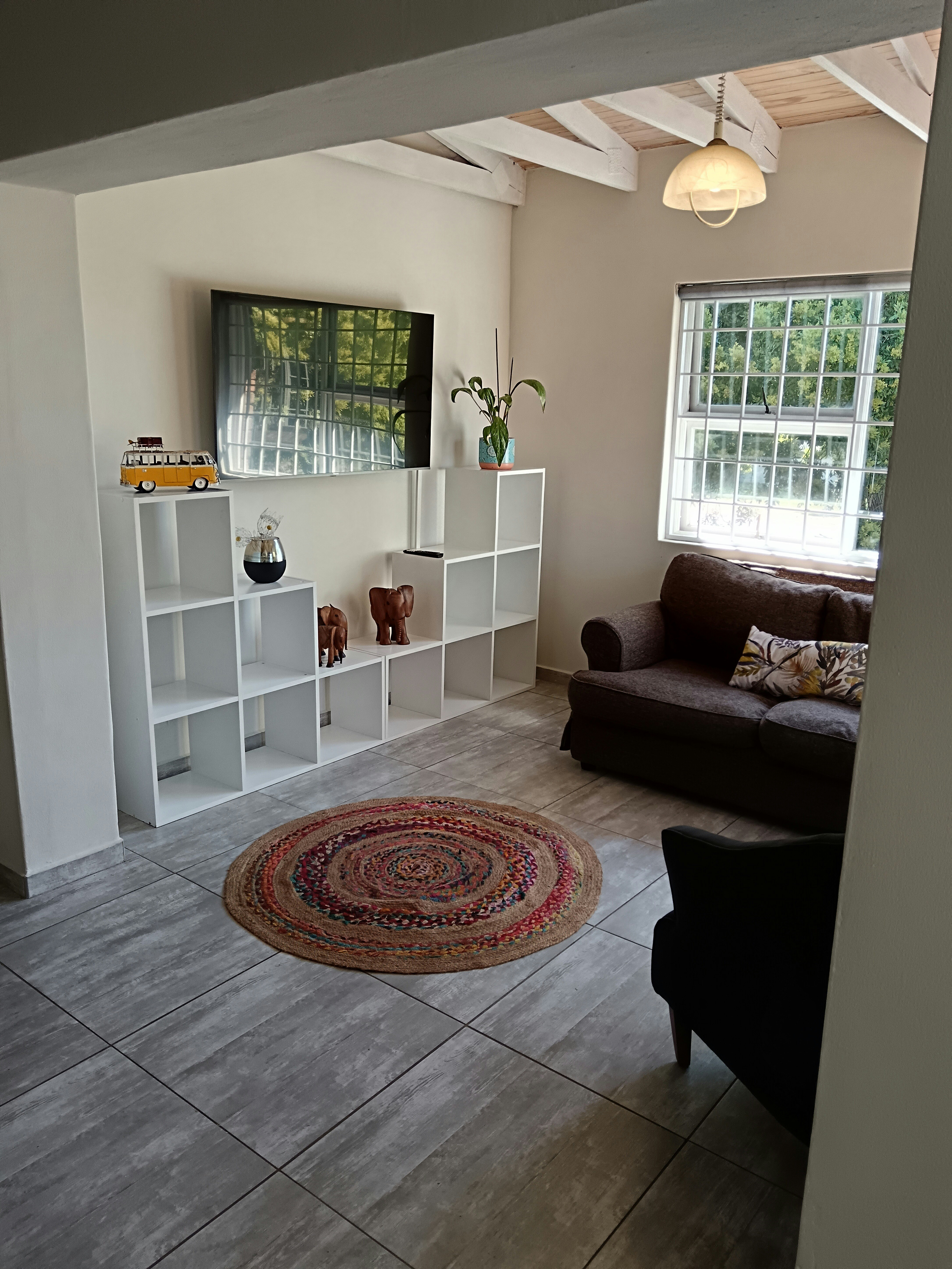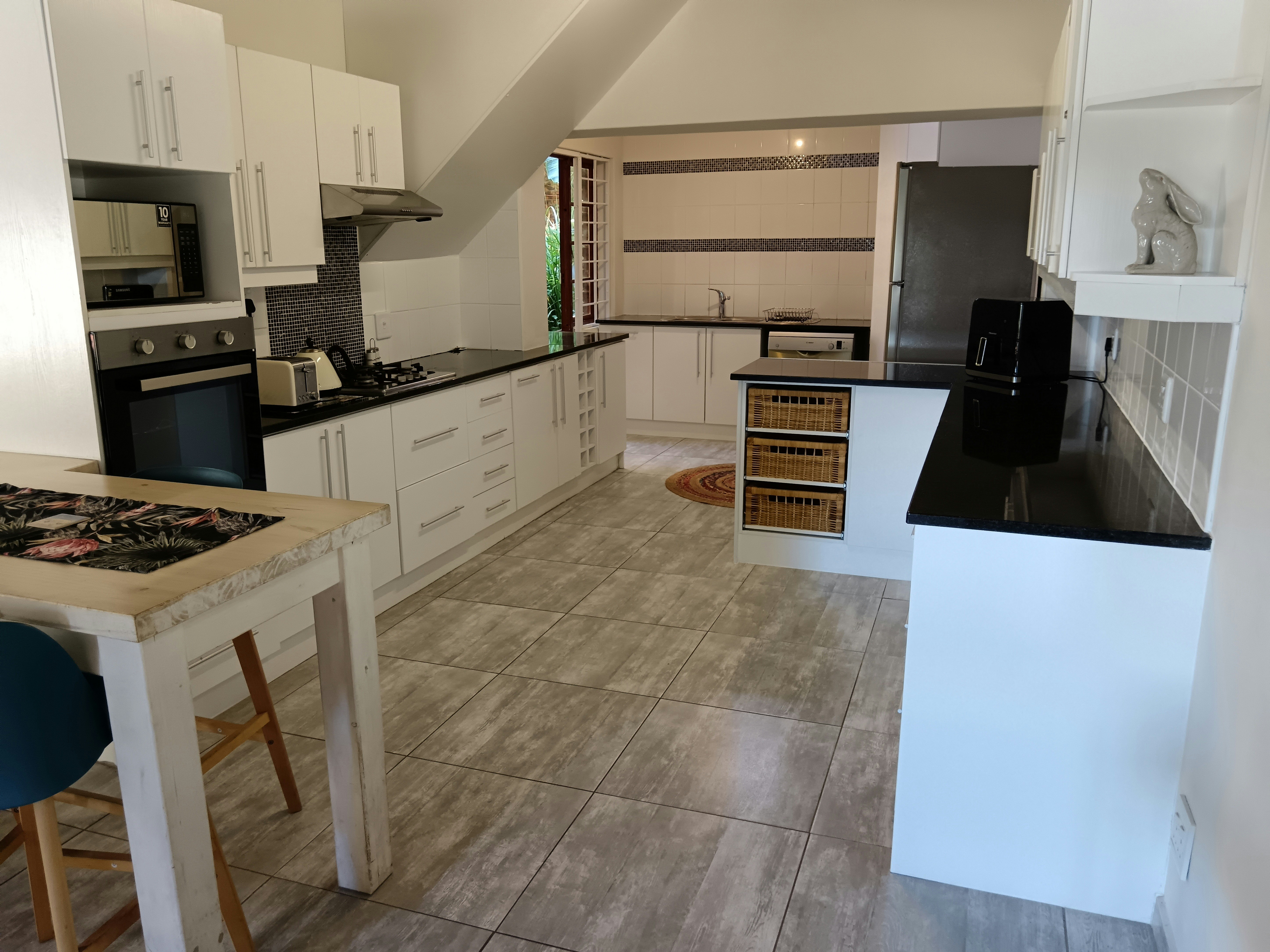 The open-plan living area includes a cosy lounge with comfortable seating, a TV, and a dining table. The fully-equipped kitchen features a fridge-freezer, stove, oven, microwave, dishwasher, and coffee- and tea-making facilities. Outside, guests can unwind on the patio and make use of the braai facilities. Secure on-site parking is available.