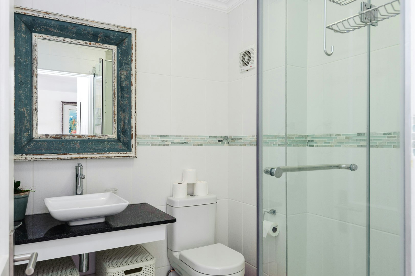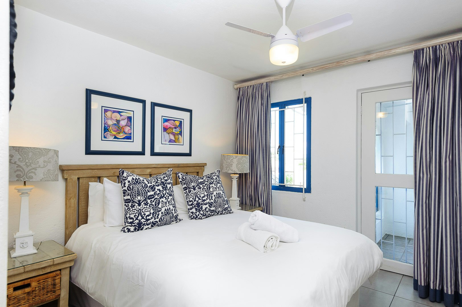 The open plan living area consists of a lounge, dining area, and kitchen. The kitchen is equipped with a fridge/freezer, stove, oven, kettle, toaster, and microwave. A dishwasher, tumble dryer and washing machine are available for guests. The lounge is furnished with a comfortable lounge suite and a TV with DSTV Now. Free Wi-Fi is also available. The lounge opens onto a patio with a charcoal braai. There is an inverter in the apartment that can power everything except the geyser, stove and oven. There is a single lockup garage and limited unallocated guest parking. The complex is secure and has a remote-controlled gate.