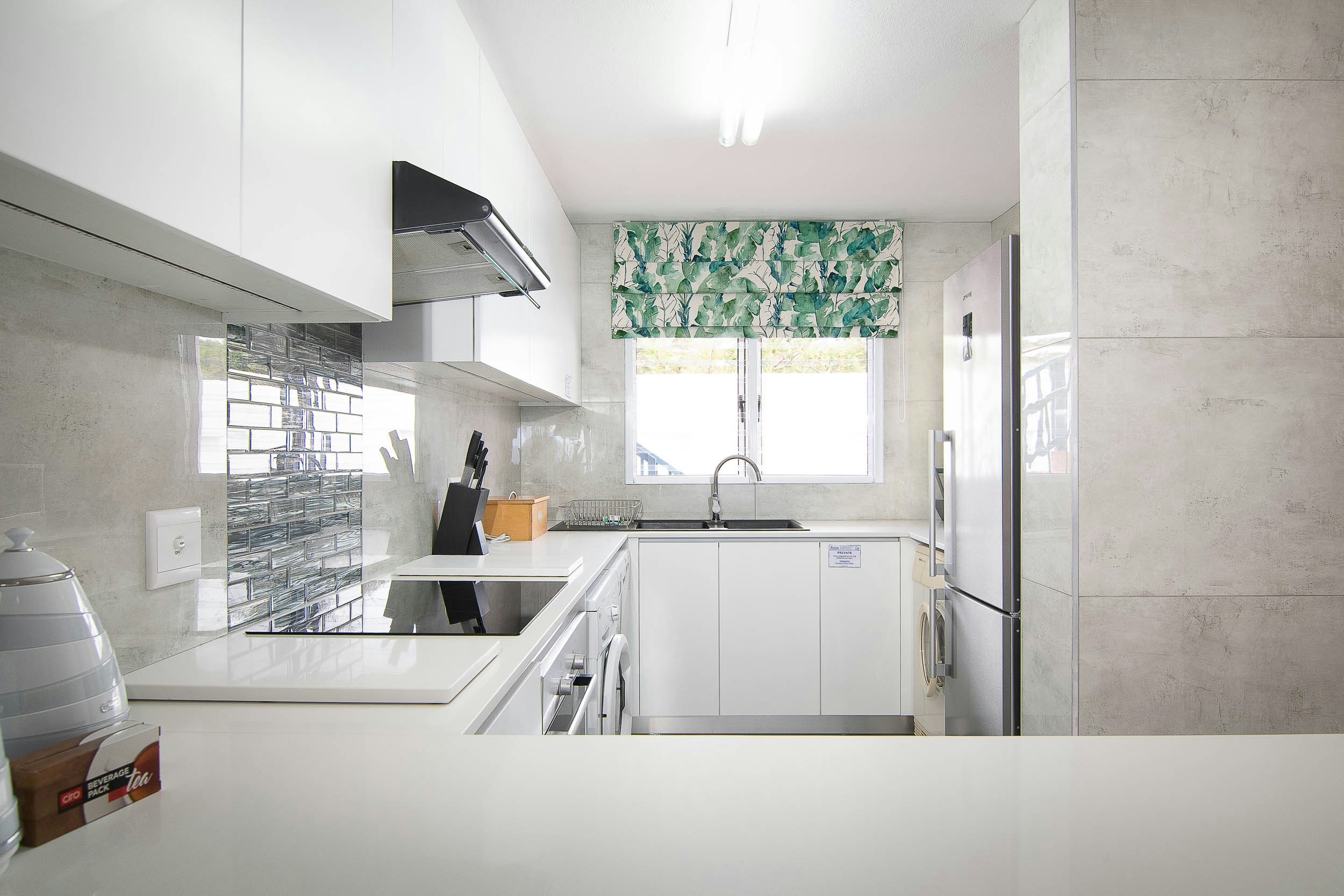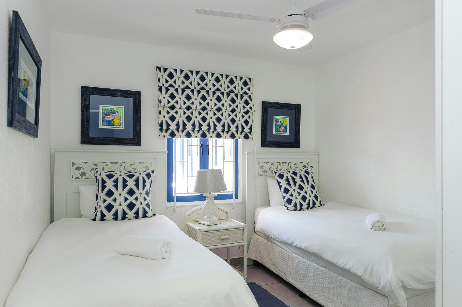 This 1st floor apartment can accommodate 4 people and comprises 2 bedrooms and 2 bathrooms. The main bedroom is furnished with a queen-size bed, ceiling fan and opens on the balcony. The en-suite bathroom is fitted with a toilet, basin, bath, and shower. The second room is furnished with 2 single beds and a ceiling fan. The guest bathroom is fitted with a toilet, basin, and shower.