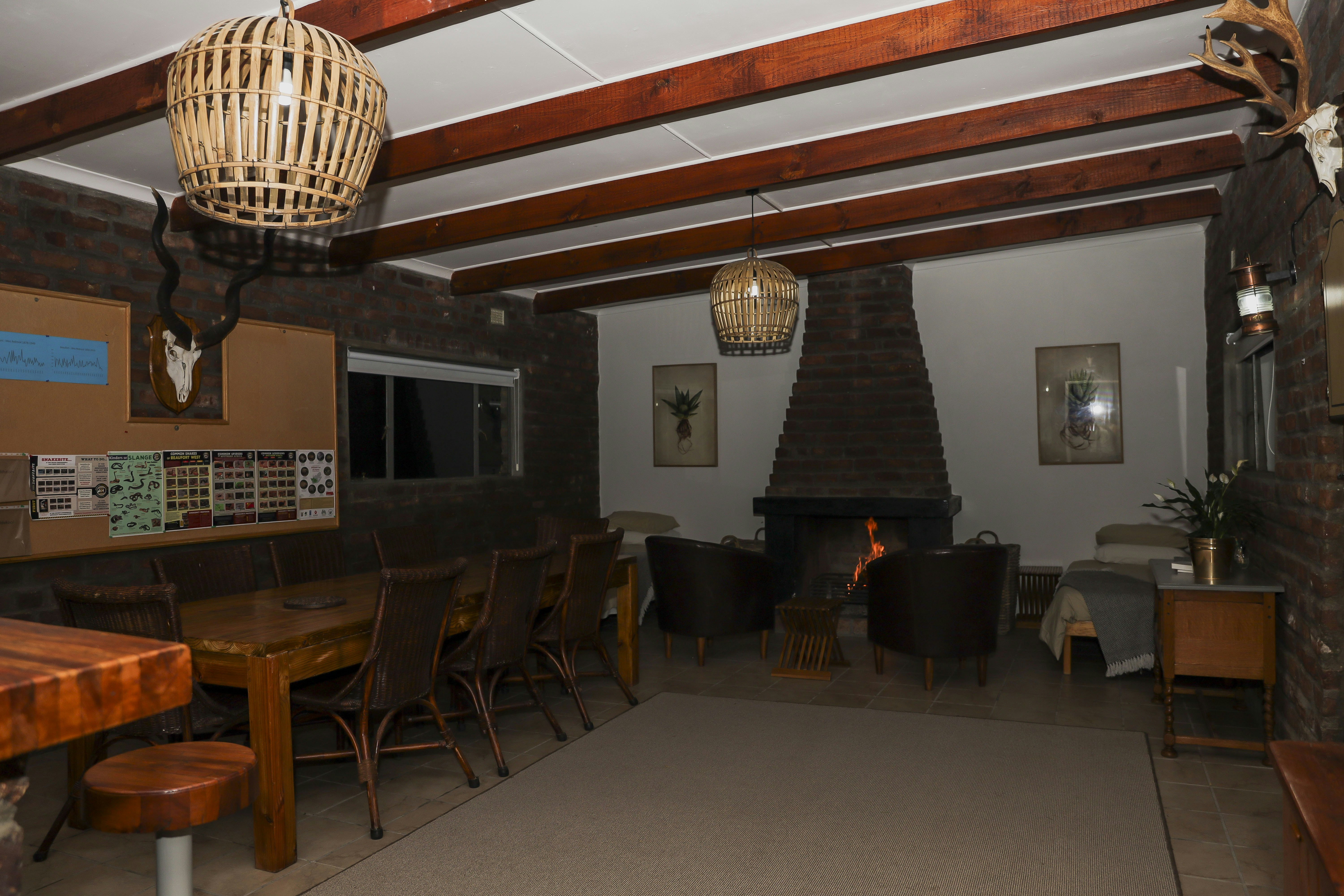 The living area includes a bar, a large dining table and chairs and a fireplace, making it a cosy alternative in winter. The outside features a grassed area with a braai and a covered area with an additional built-in braai.