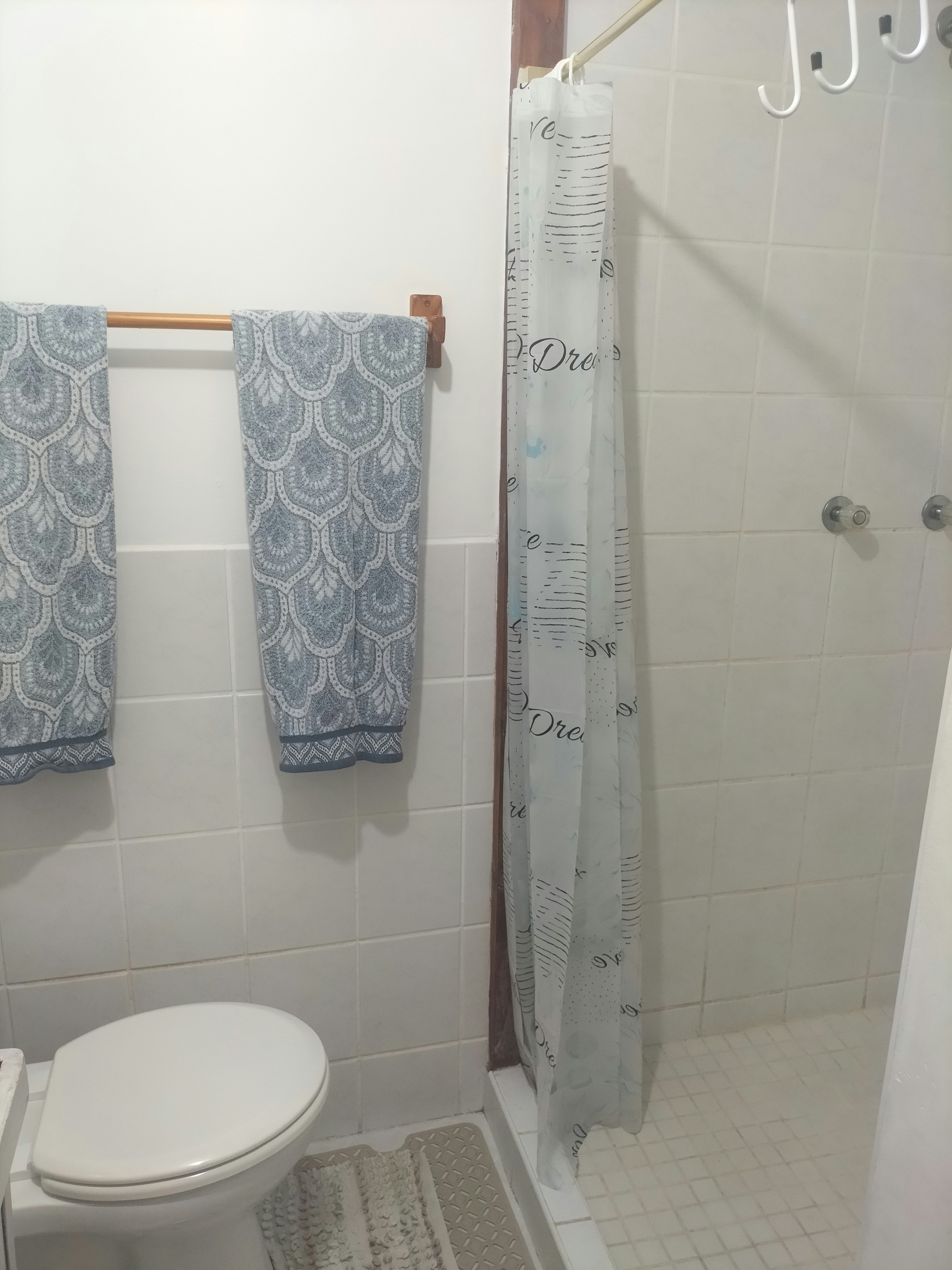 The apartment comprises 2 bedrooms and a sleeper couch suitable for 2 children. The main bedroom is furnished with a queen-size bed and includes a hairdryer, fan, and wardrobe. The second bedroom contains 2 single beds with storage space. The bathroom is fitted with a shower, basin, and toilet. Linen and bath towels are provided.