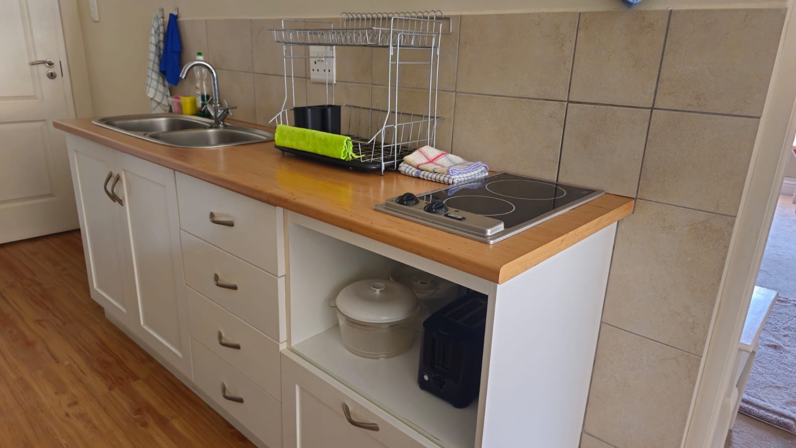 Die kombuisie is toegerus met 'n mikrogolfoond, 'n tweeplaatstoof, yskas-vrieskas, ketel, stomer, broodrooster, eetgerei en breekware. In die leefarea is daar 'n TV met 'n DVD-speler asook DStv Premium. Buiten die enkelbed, is daar ook 'n gemaklike rusbank, drie gemakstoele en 'n eetarea met 'n etenstafel en 4 stoele. 'n Skuifdeur lei na die balkon met 'n losstaande braai, tafel en gemakstoele. Daar is veilige parkering vir 'n motor. Die verblyf word nie deur berutkrag geraak nie en WiFi is beskikbaar.