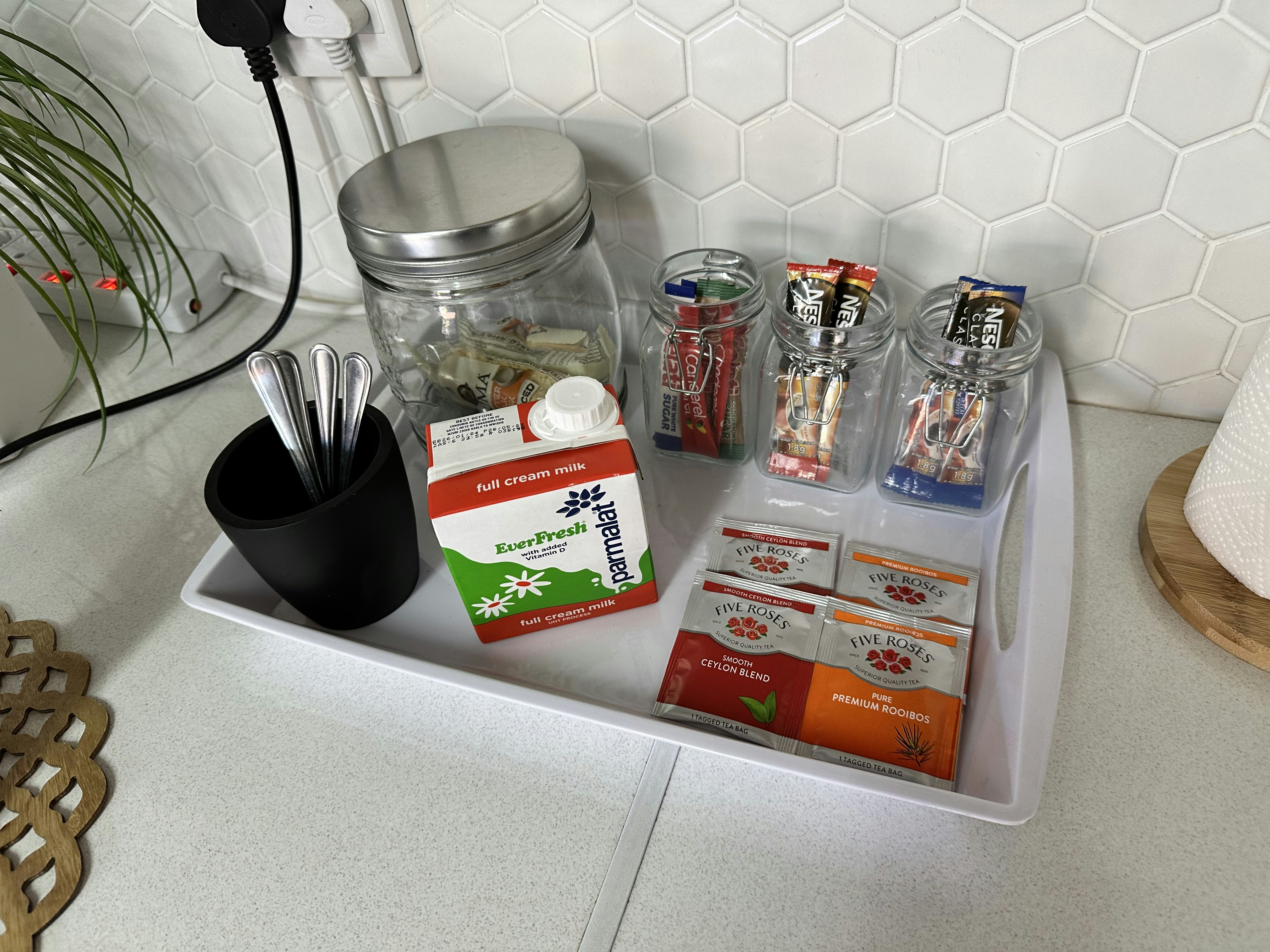 The living area features a fully equipped kitchen with a stove, oven, microwave, kettle, fridge-freezer, cutlery, crockery, as well as tea- and coffee-making facilities. Also available in the kitchen is a 4-seater dining table perfect for meals.