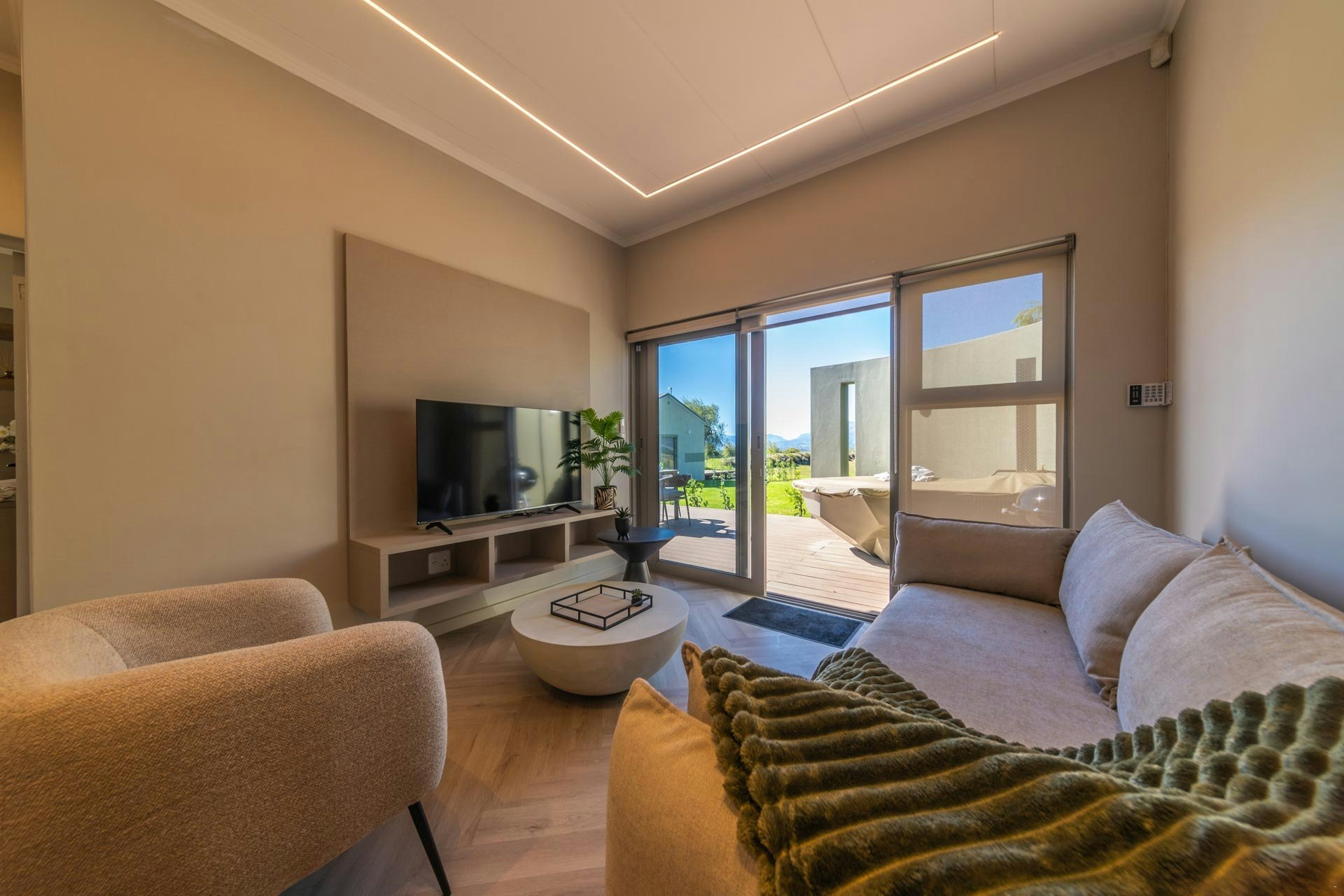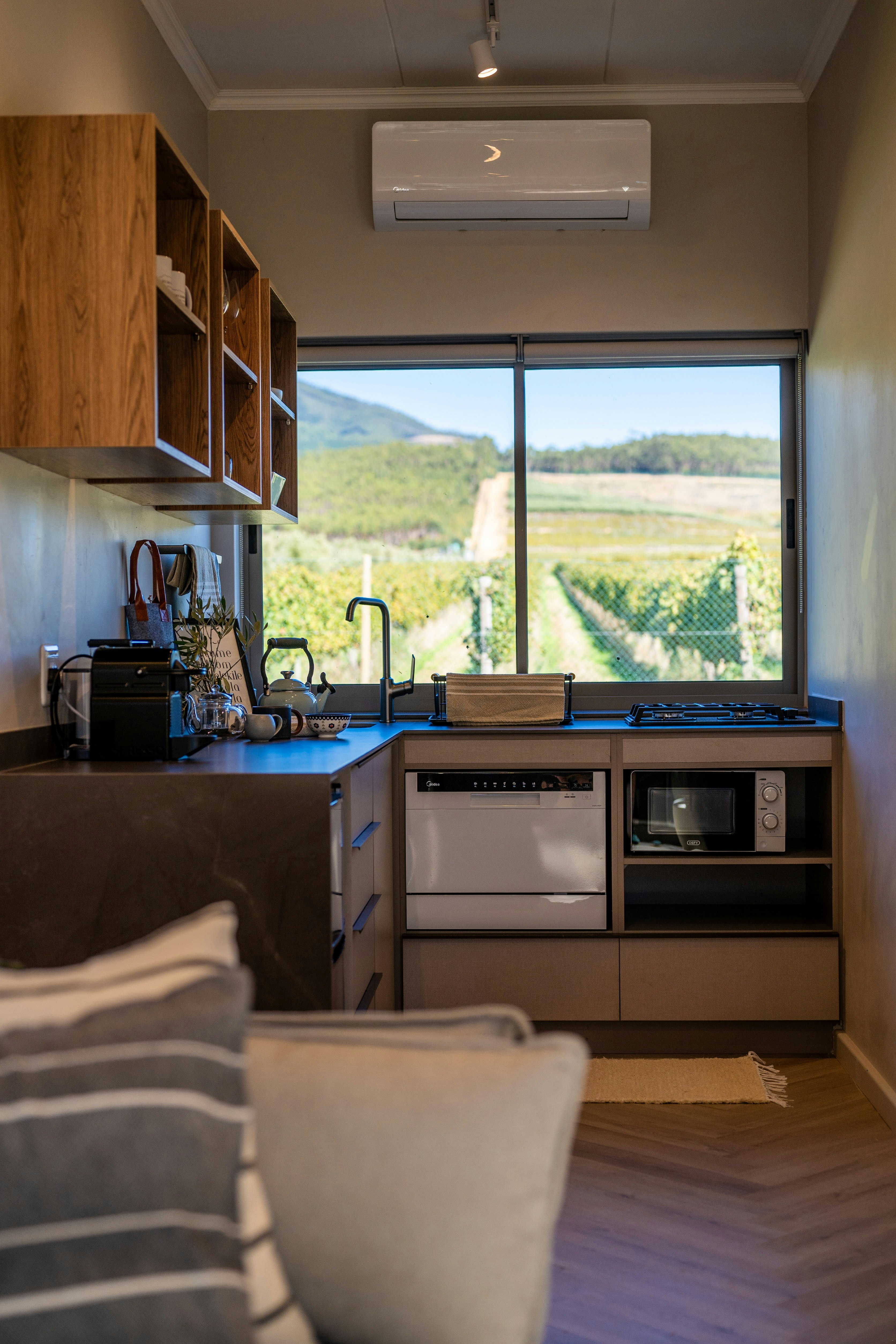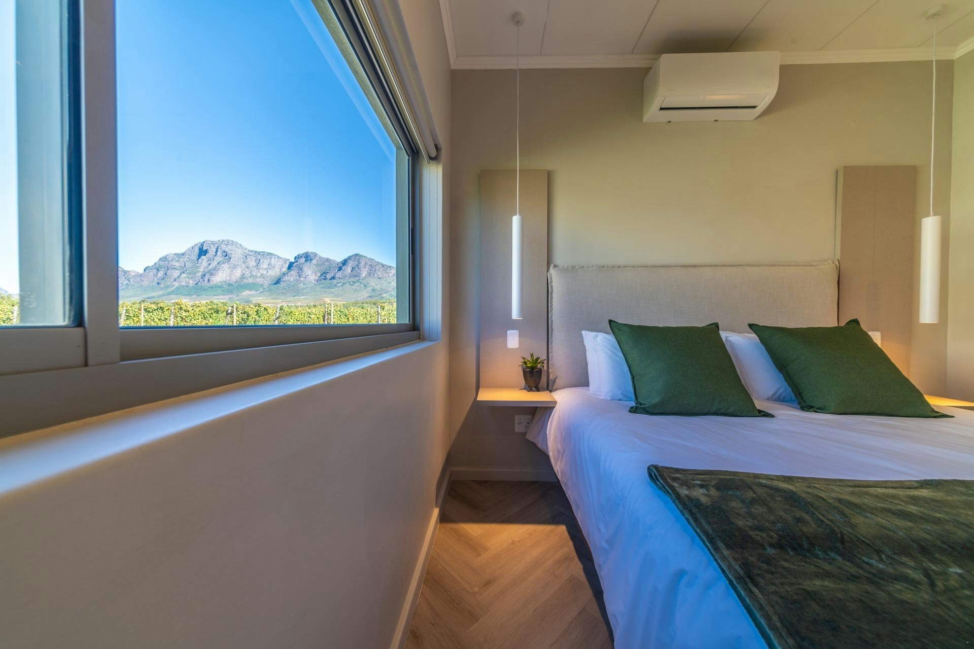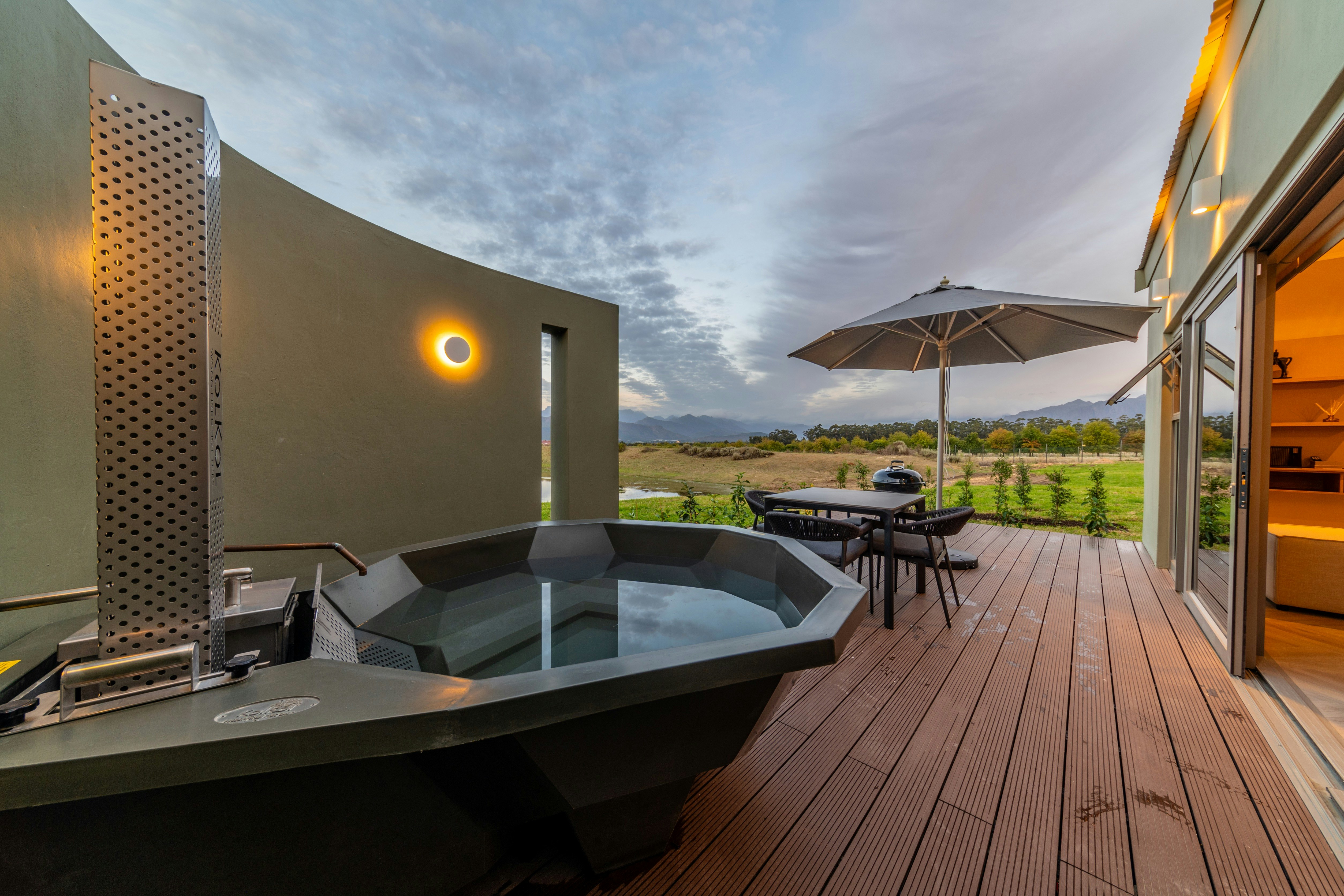 The unit leads out to a charming patio featuring outdoor seating, peaceful views, and braai facilities. Guests can also enjoy a KolKol hot tub, perfect for taking in the stunning sunsets and views over the vineyards.