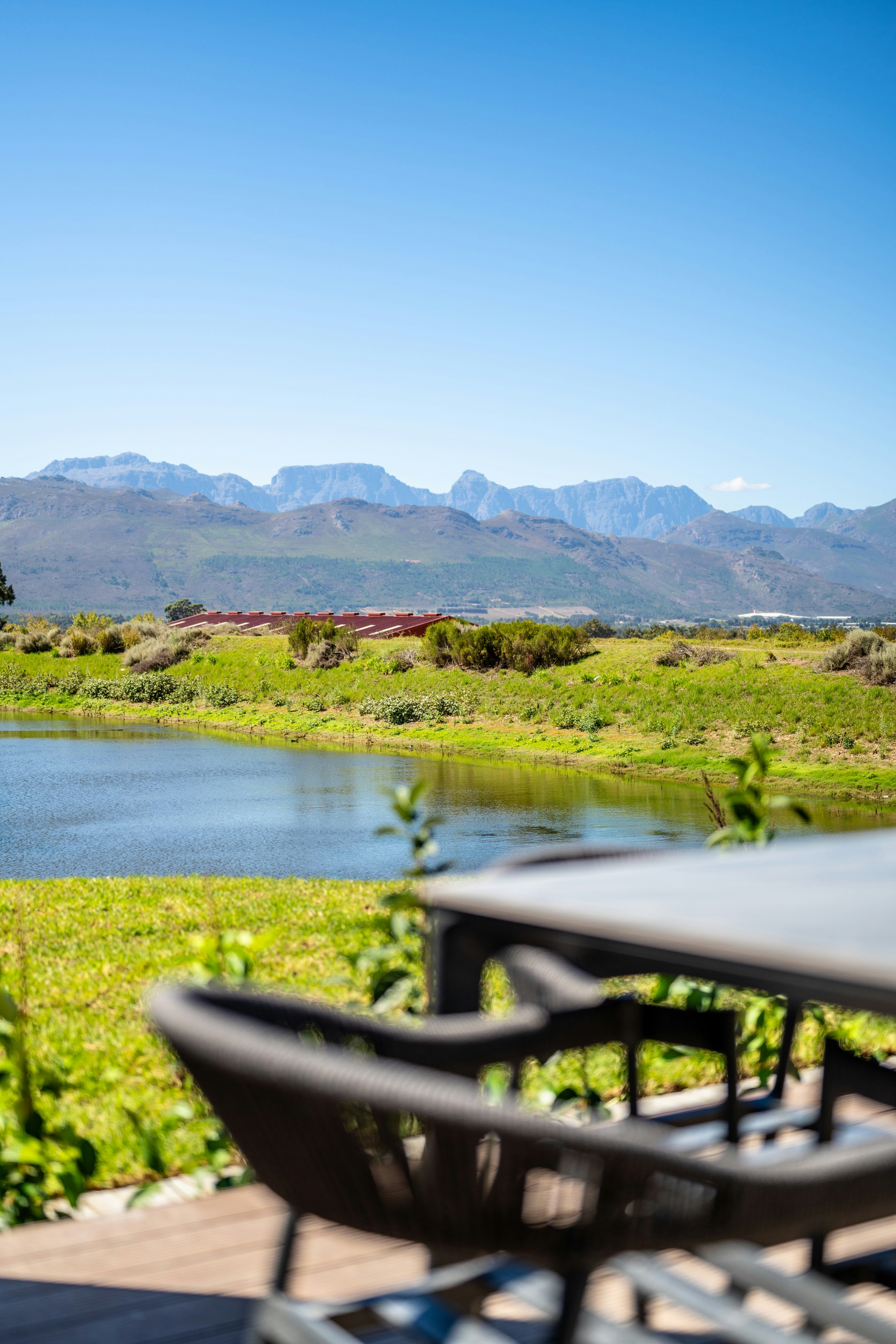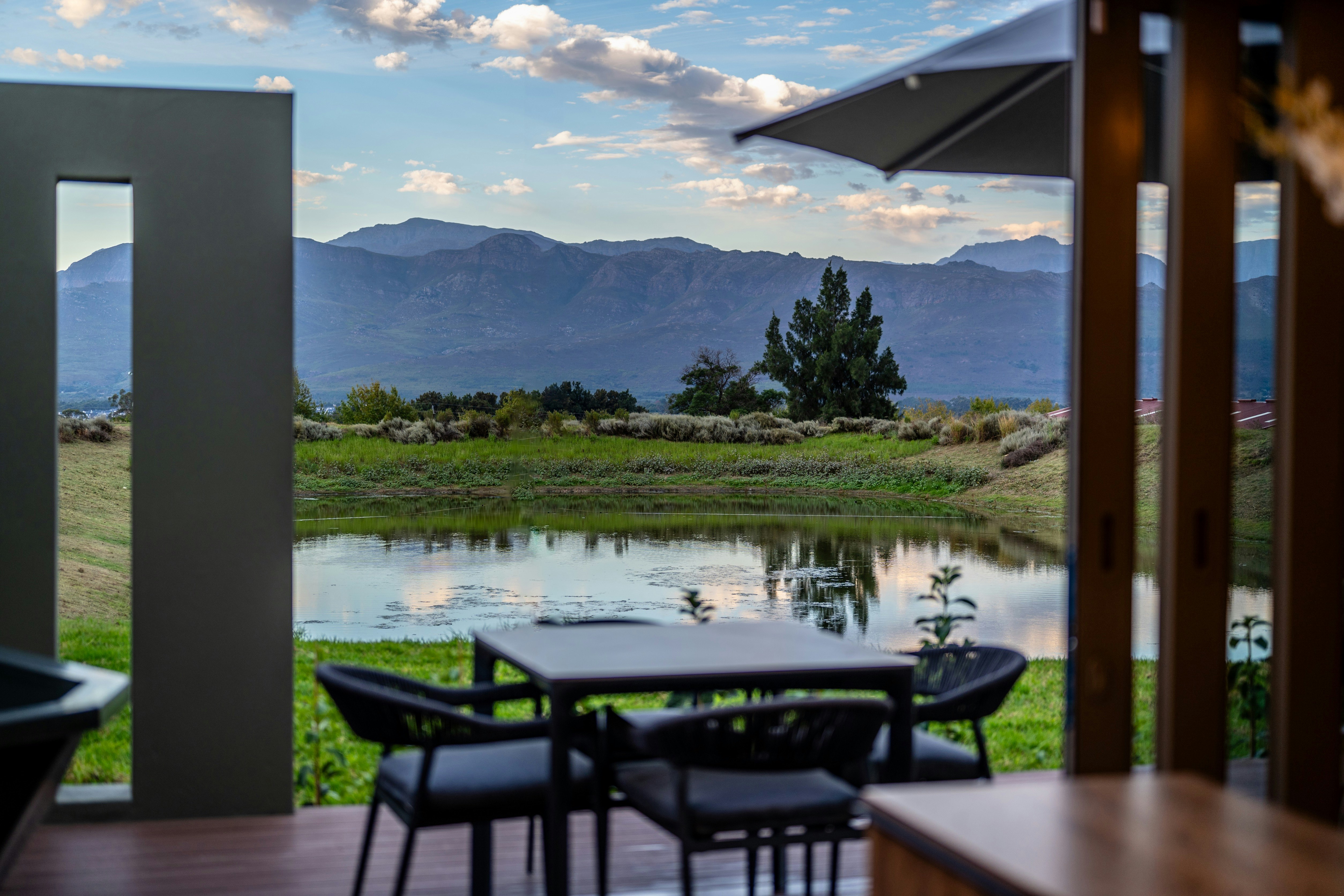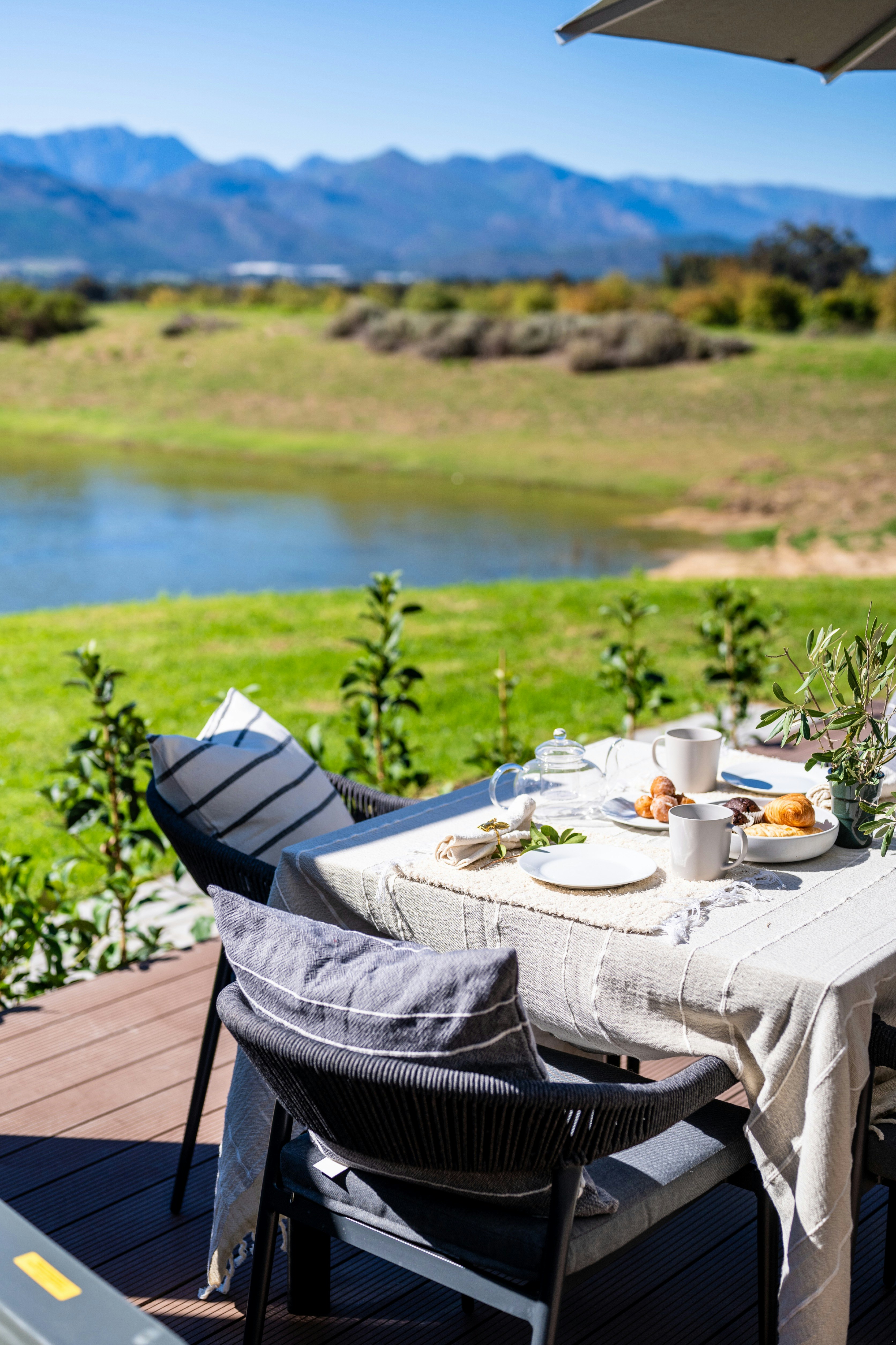 The unit leads out to a charming patio featuring outdoor seating, peaceful views, and braai facilities. Guests can also enjoy a KolKol hot tub, perfect for taking in the stunning sunsets and views over the vineyards.