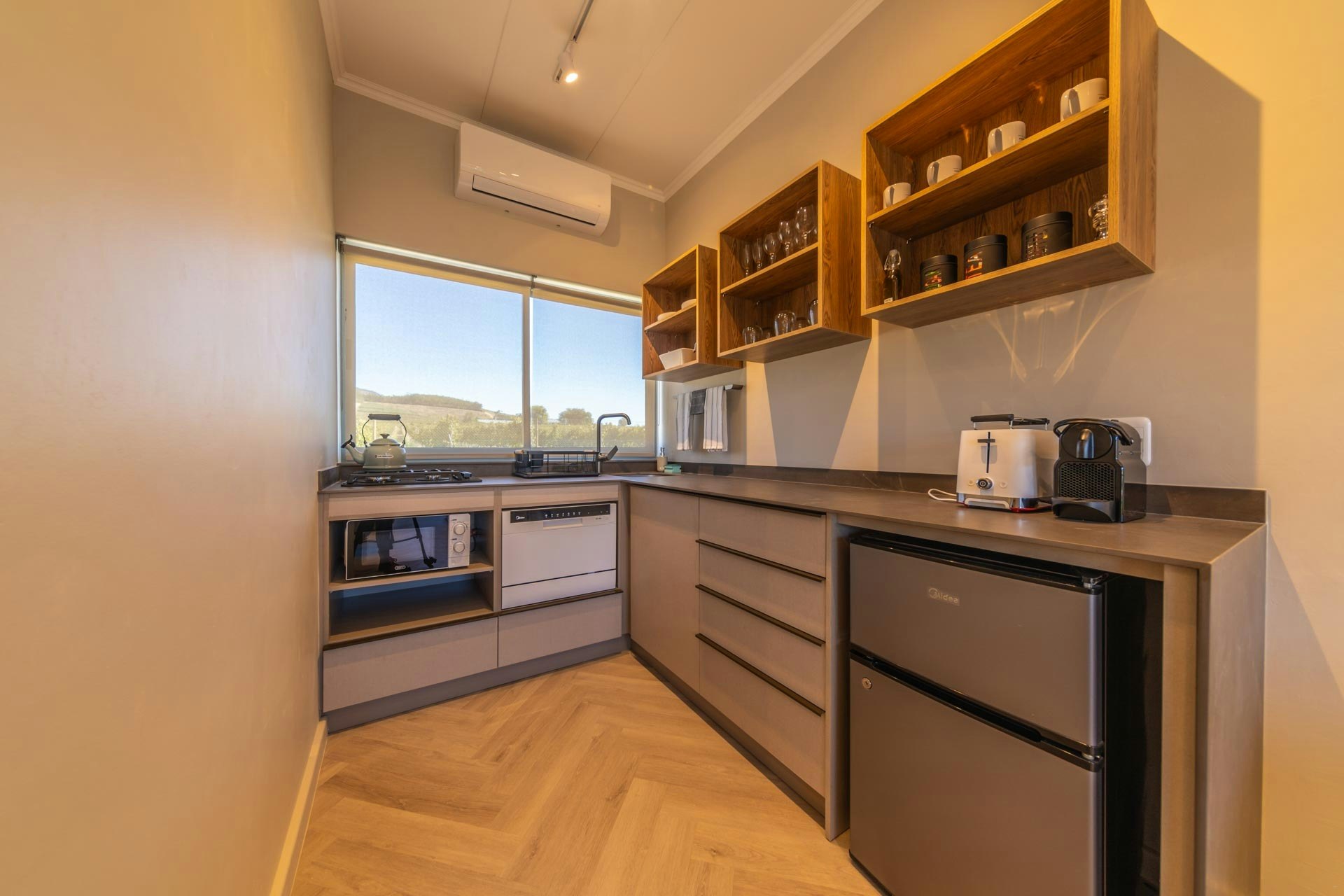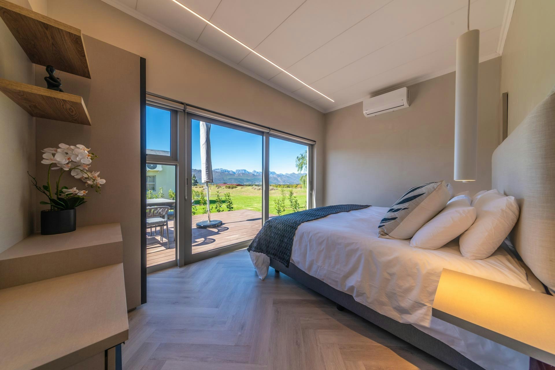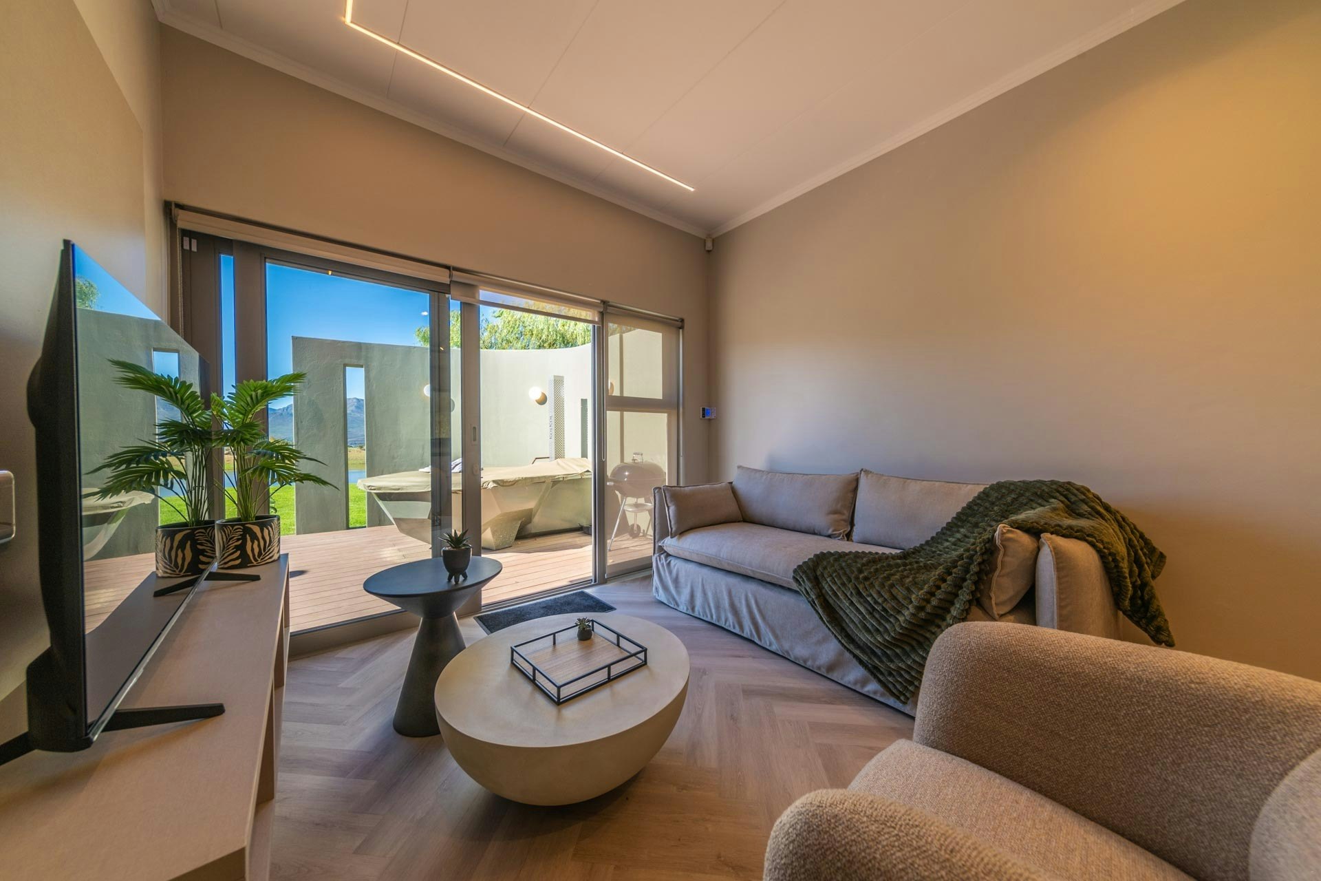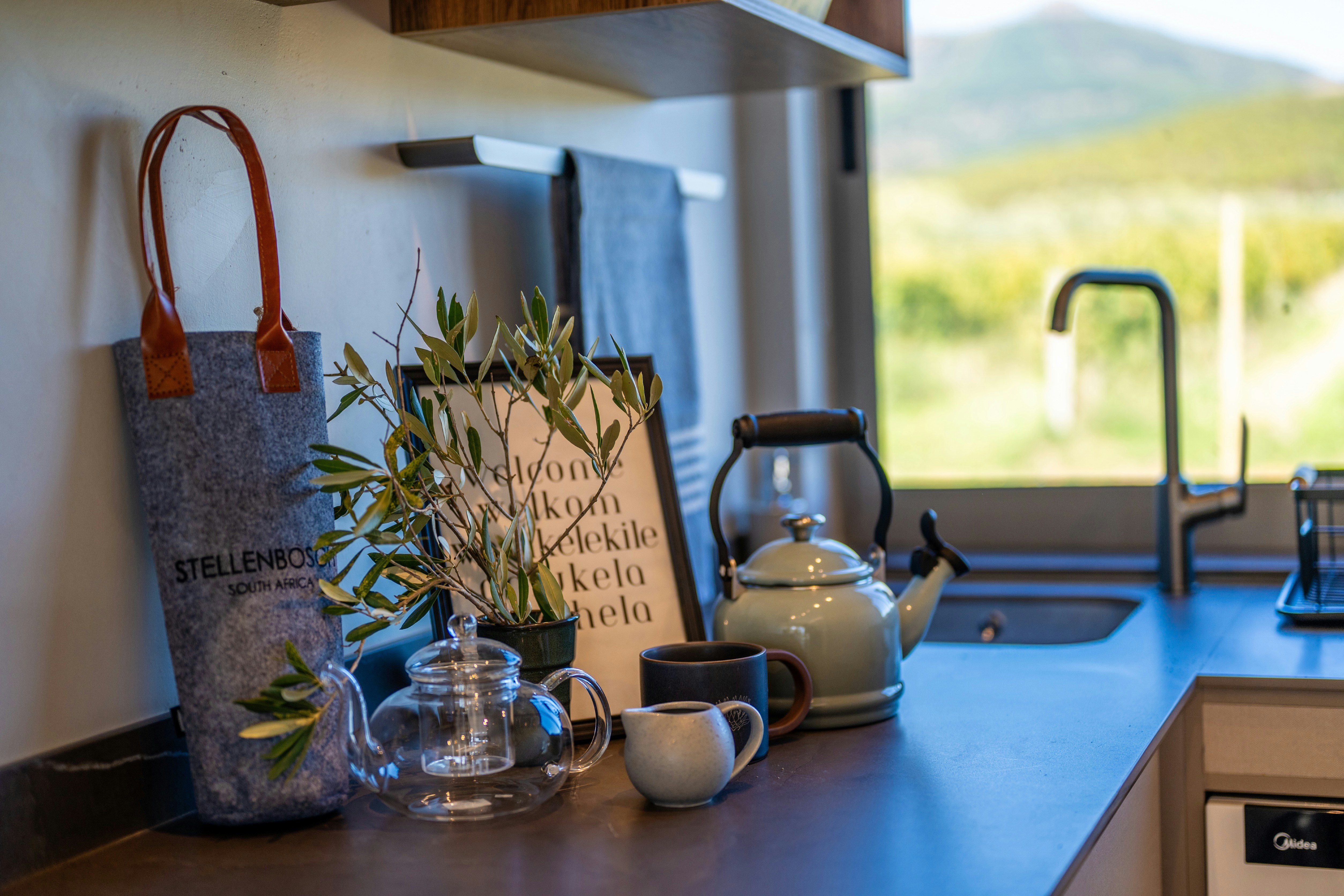 The unit leads out to a charming patio featuring outdoor seating, peaceful views, and braai facilities. Guests can also enjoy a KolKol hot tub, perfect for taking in the stunning sunsets and views over the vineyards.