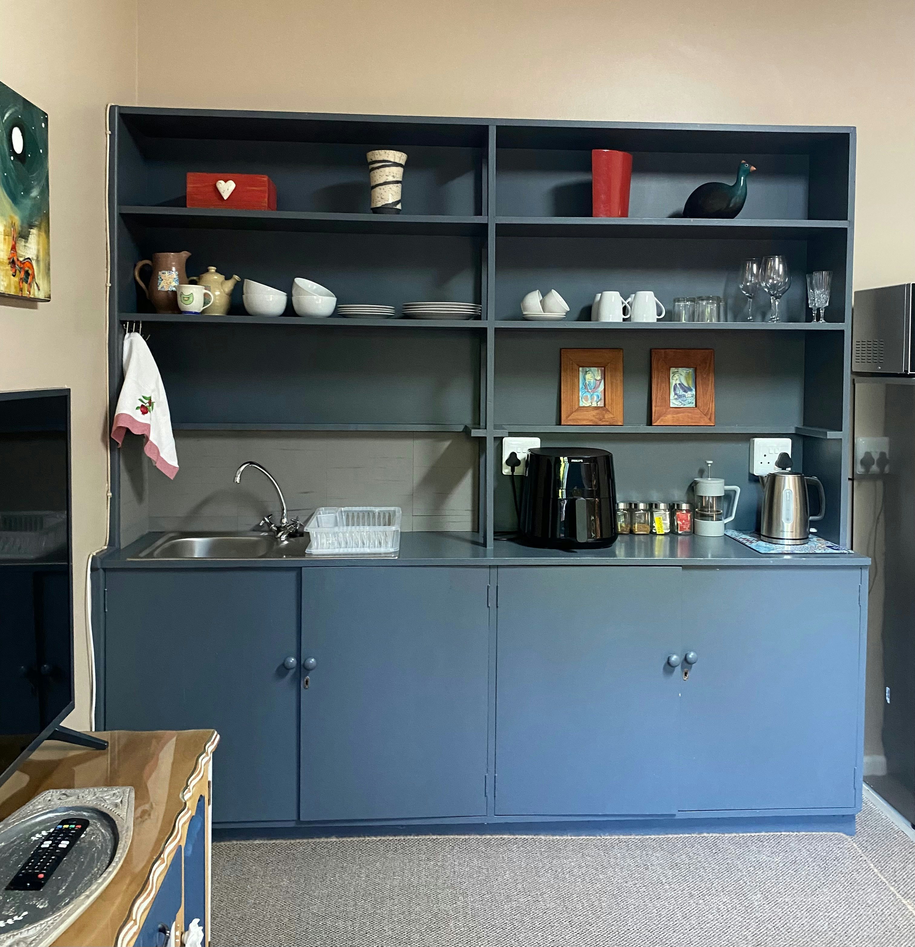 The living area features a kitchenette equipped with an air fryer, microwave, fridge-freezer, cutlery and crockery as well as tea- and coffee-making facilities. This space also has comfortable seating, a dining table and a TV. Access to free Wi-Fi is available. There is also a designated work area.