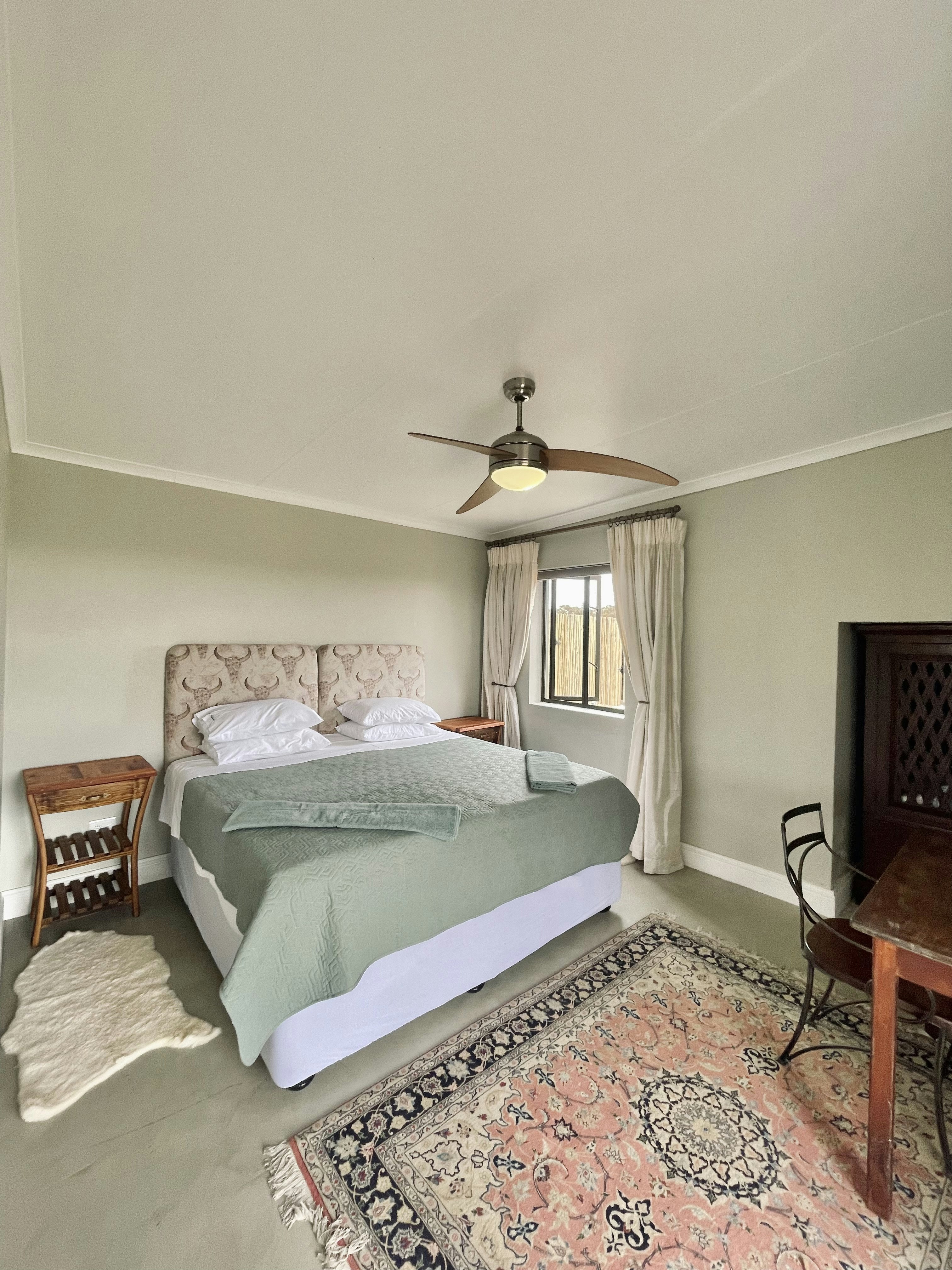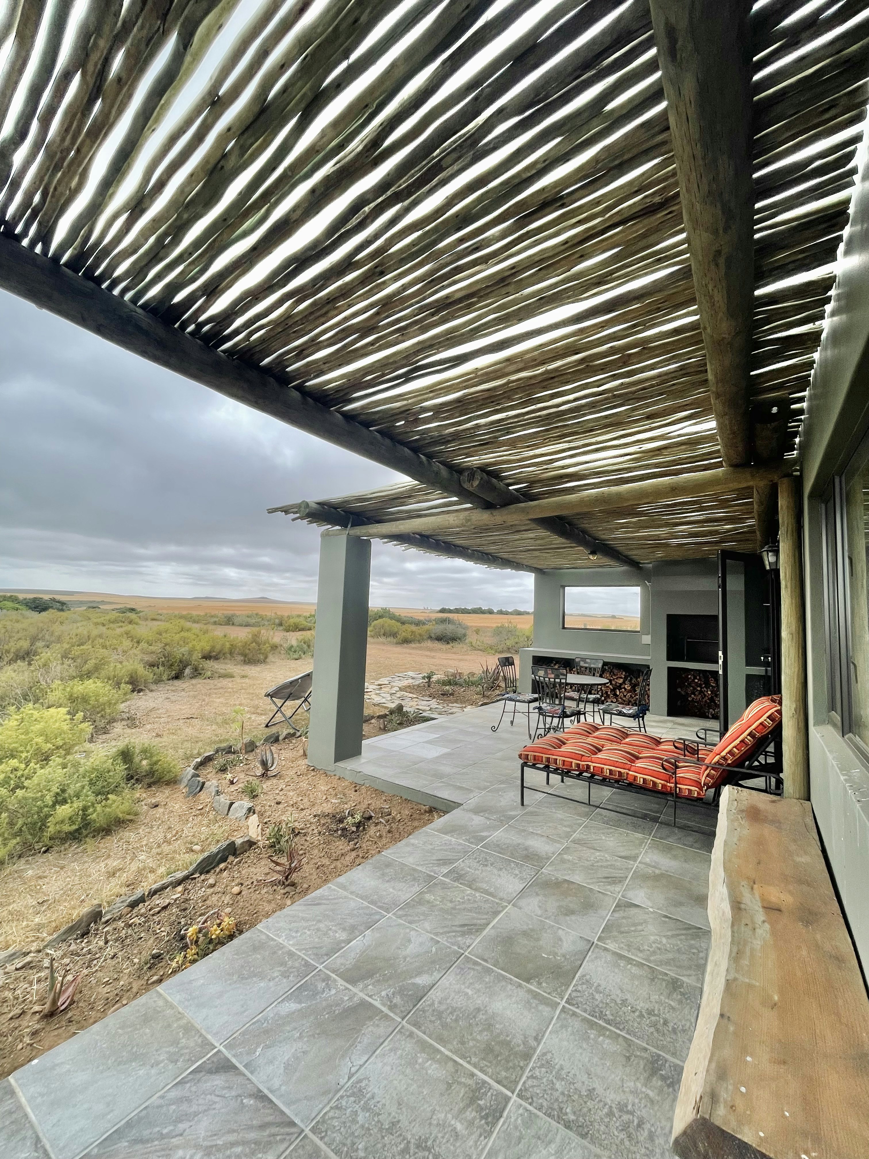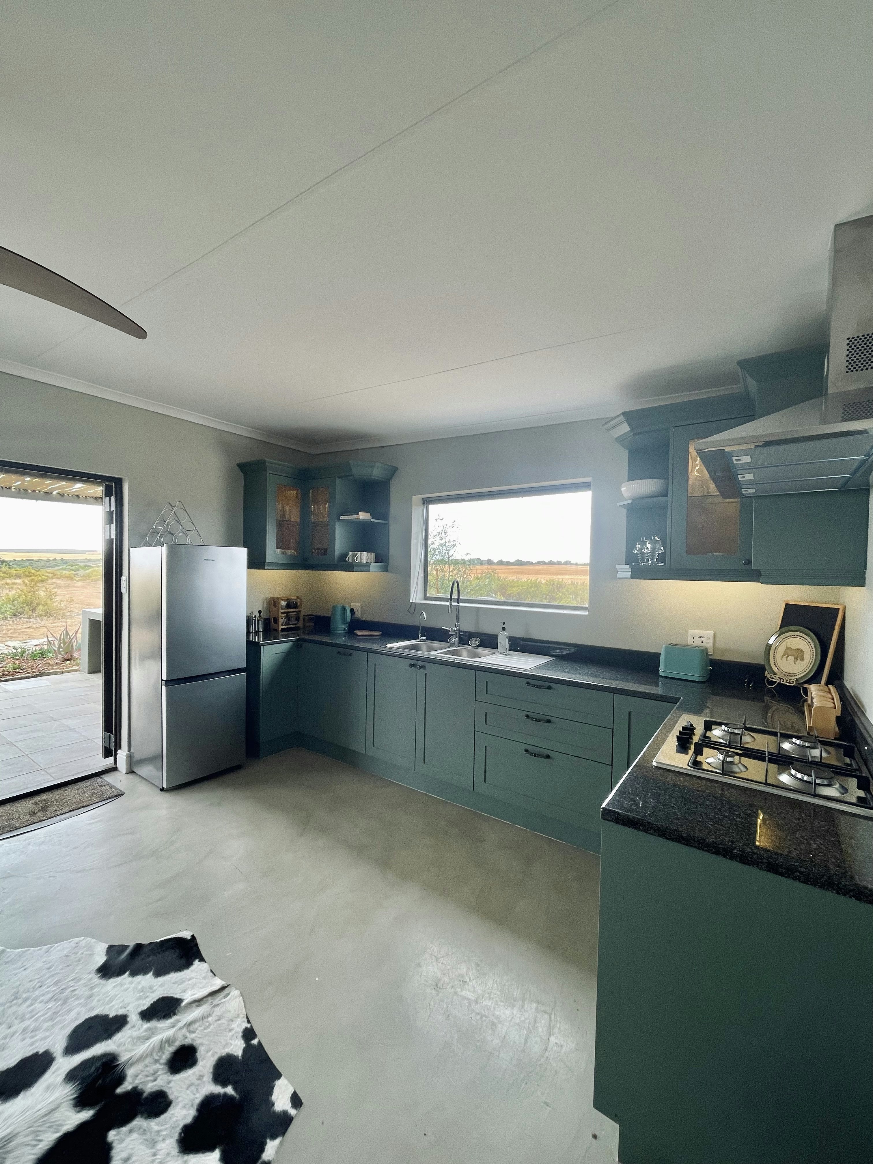 Die oopplan-kombuis is goed toegerus met 'n yskas-vrieskas, gasstoof, oond en mikrogolfoond. Die leefarea het 'n knus kaggel en maak oop na 'n patio met ingeboude braaigeriewe en 'n buite-eetarea. Gaste kan ontspan op die patio of die privaat buitebad geniet, wat panoramiese uitsigte oor die plaas bied en beide warm en koue water het. Die eiendom werk geheel en al op sonkrag, wat ononderbroke elektrisiteit en vryheid van beurtkrag verseker. WiFi is ook beskikbaar.