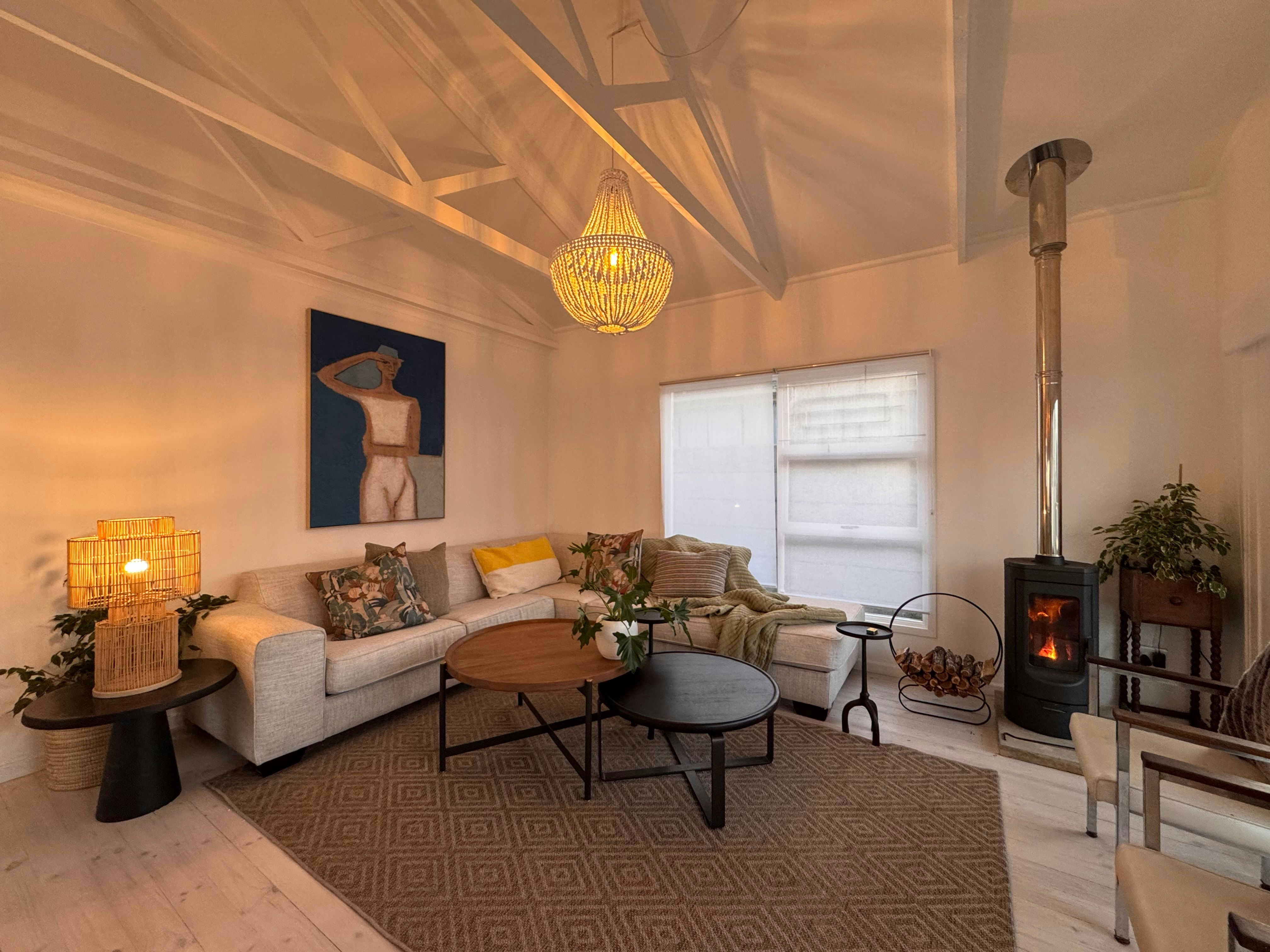 The open-plan living area features a cosy fireplace, comfy seating, and a dining space. The kitchen is fully equipped with a fridge-freezer, stove, oven, microwave, and tea- and coffee-making facilities.