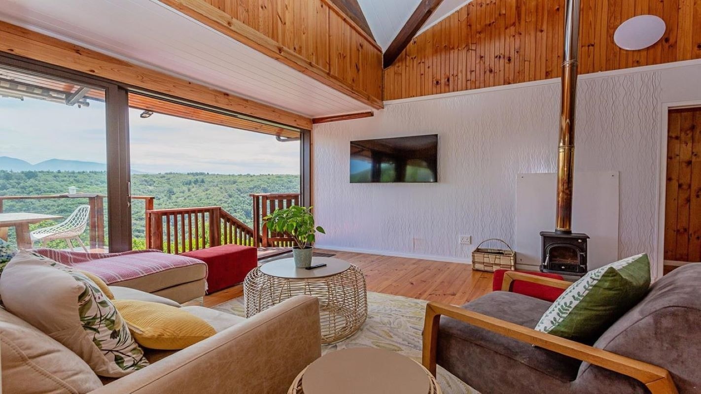 The kitchen is open-plan to the living area and is well-equipped with a fridge-freezer, microwave, oven, gas stove, dishwasher, cutlery, crockery, and tea- and coffee-making facilities. The living area features a fireplace, a TV, and comfortable seating opening onto a balcony with ample outdoor seating, an outdoor dining table, day beds, and a braai area overlooking the forest.