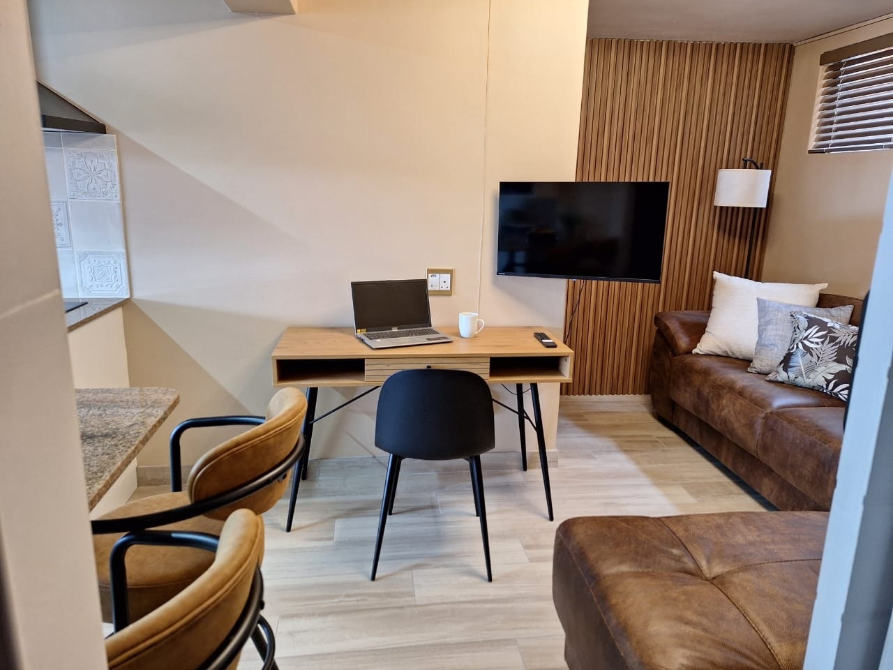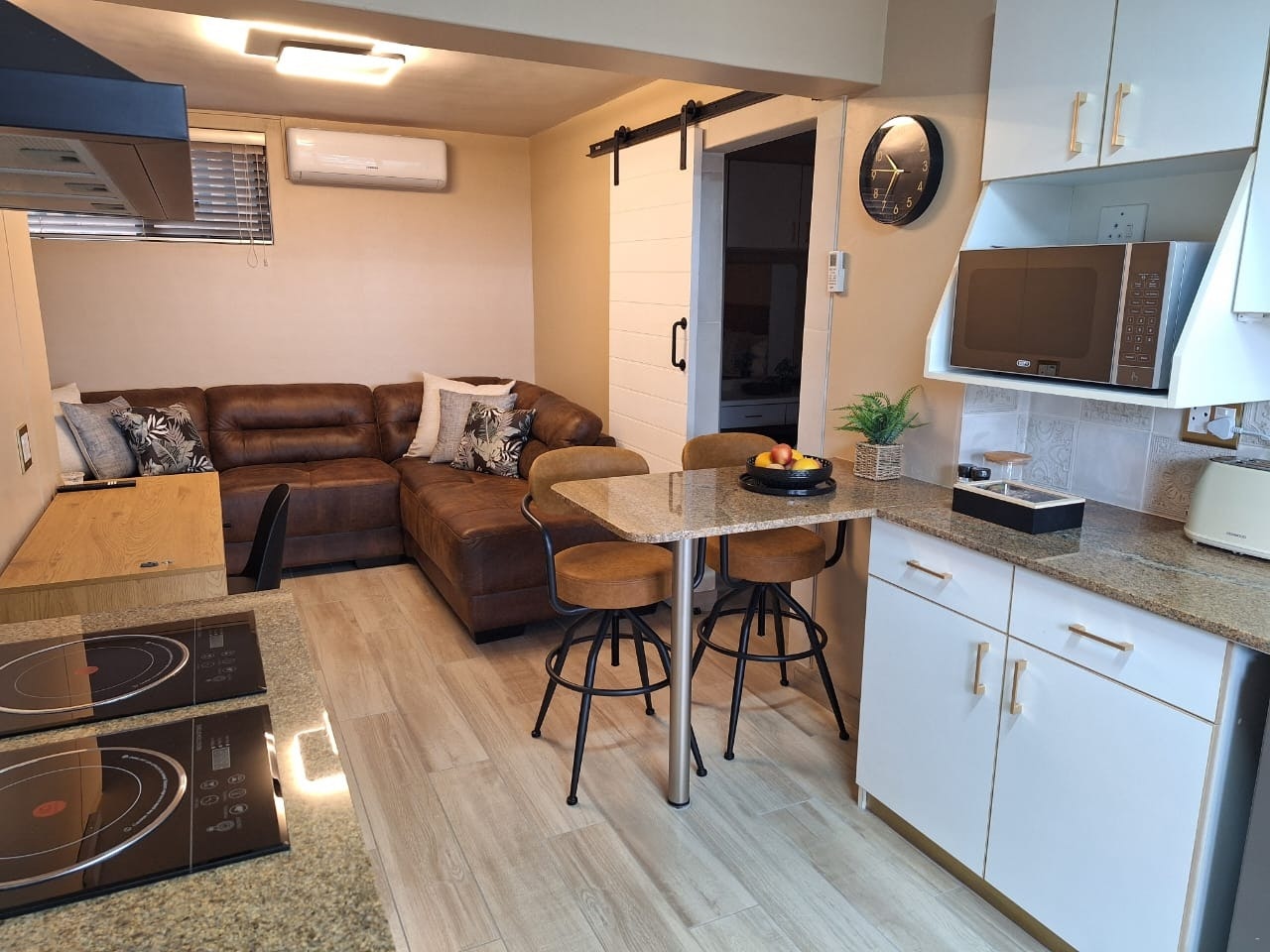 The open-plan living area offers a comfortable space to unwind, while the kitchenette is equipped with 2 induction plates, a microwave, a bar fridge, a kettle, and a toaster, as well as basic cooking essentials suited for heat-and-eat meals. The living area includes a Smart TV with streaming services, air-conditioning, and free Wi-Fi access. A dedicated workspace is also available.