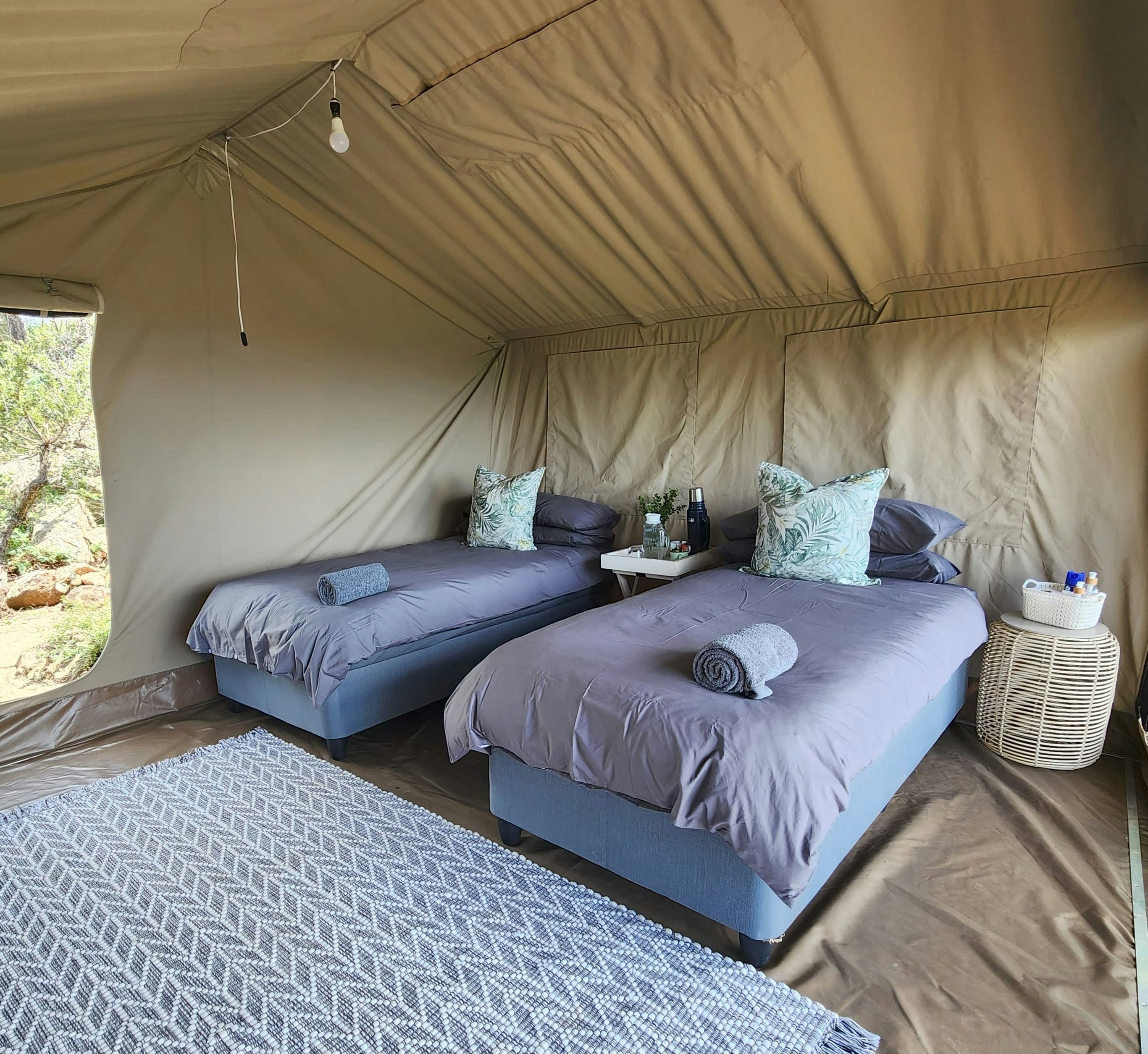 These lovely glamping tents can each comfortably accommodate 2 guests as it is furnished with a queen-size bed. Each tent has its own private ablution facility fitted with an open-air shower. All linen and bath towels are provided.