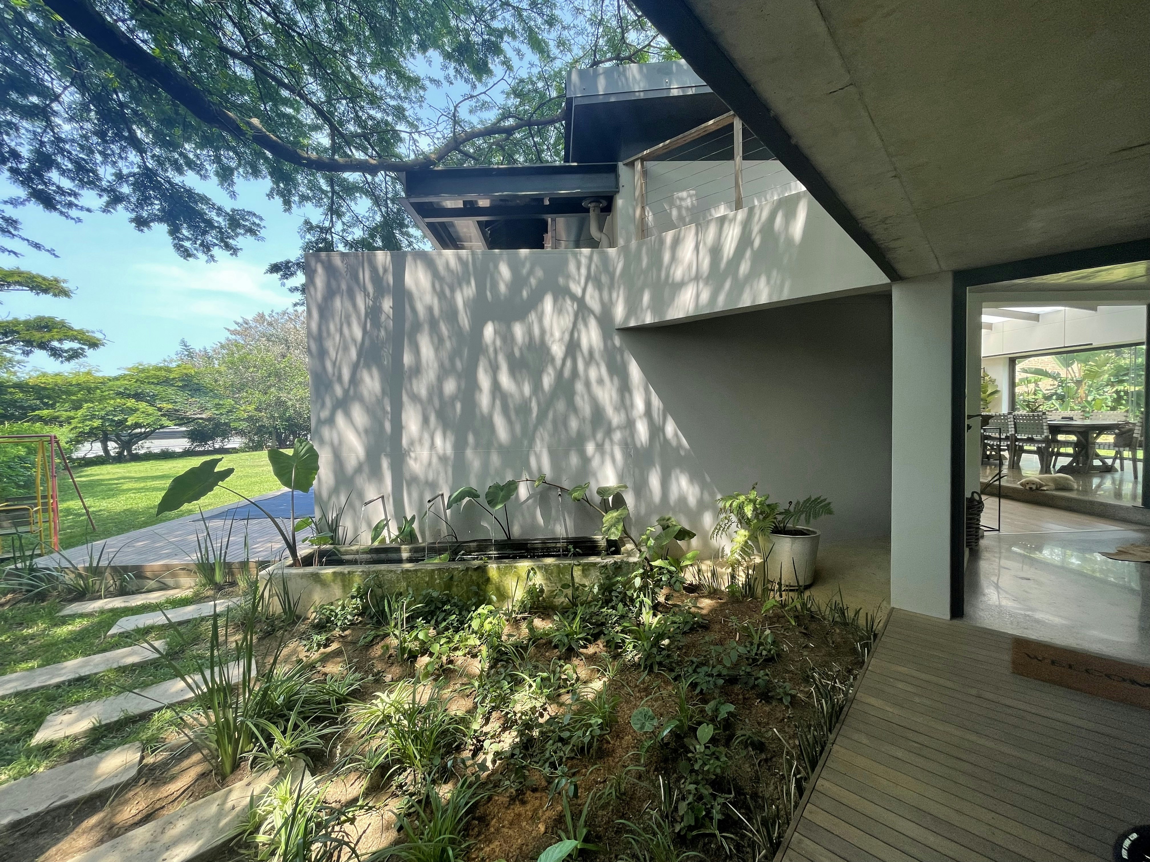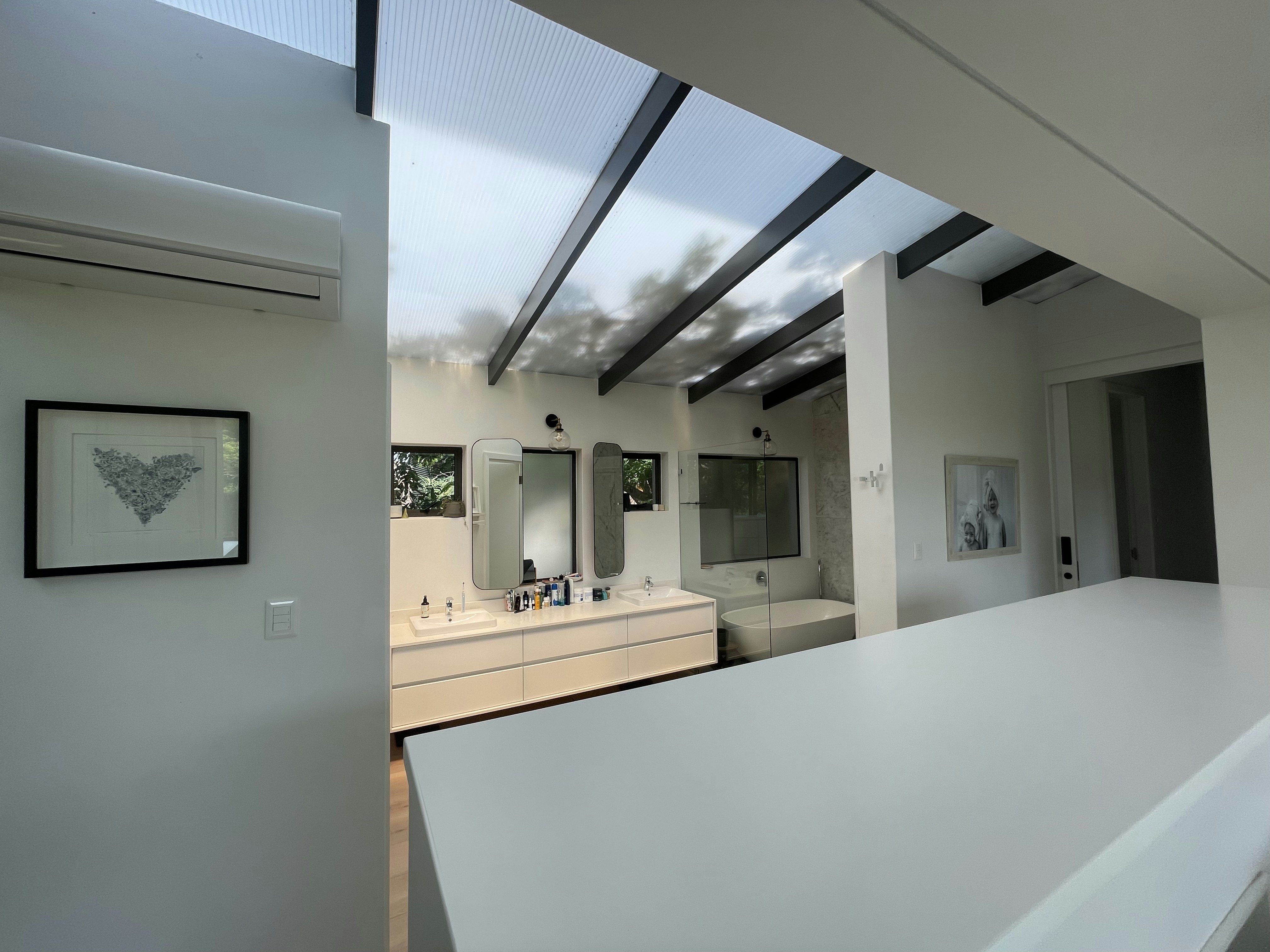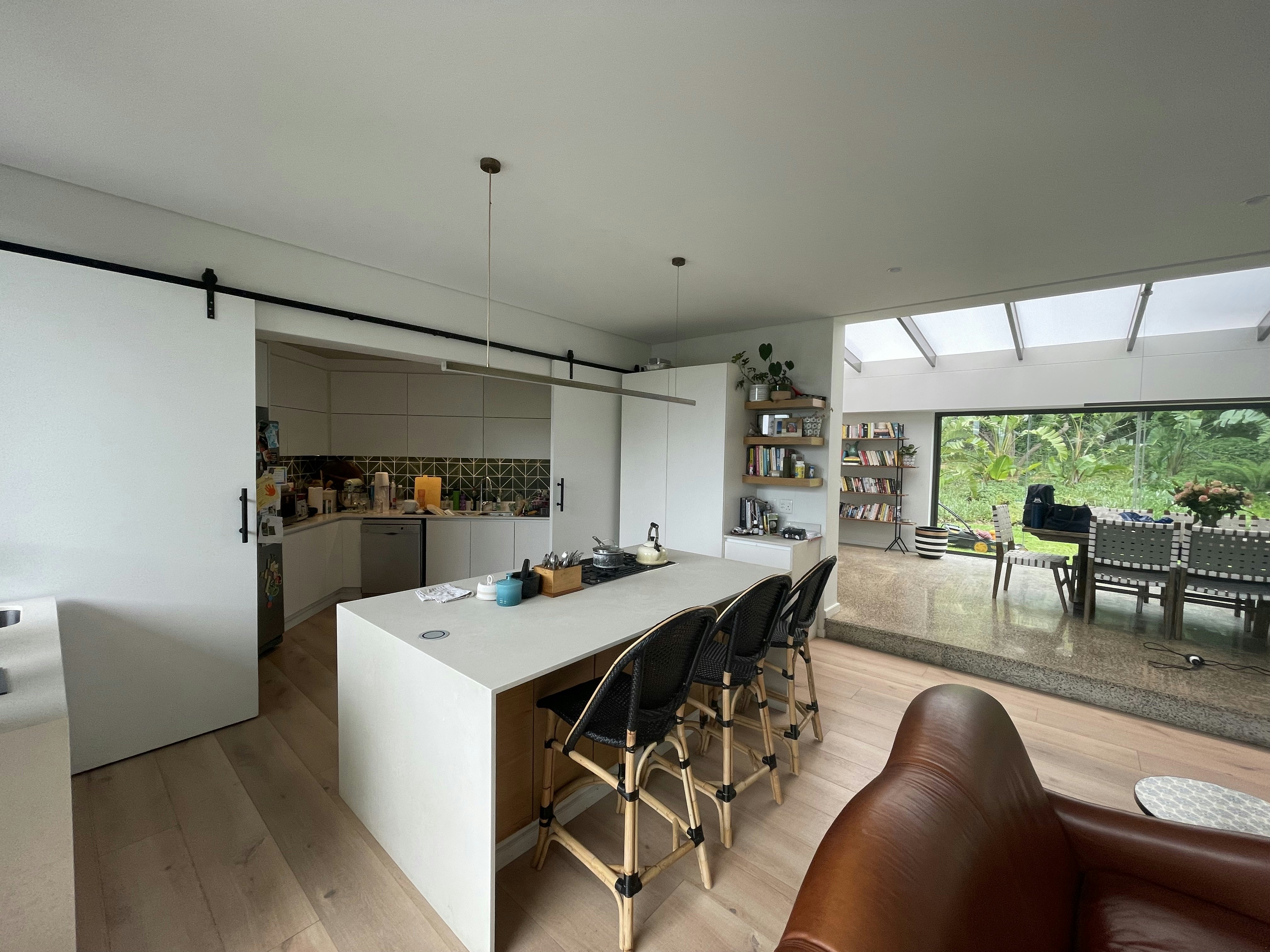 All the bedrooms have air conditioning and open up onto the deck which wraps around the house. The main en-suite bedroom boasts beautiful views of the forest, and has a private, tropical outdoor shower under the canopy. This bedroom contains a king-size bed. The guest suite is situated above the garage and is large and spacious and looks over the front garden, with beautiful views of the forest on the estate. This bedroom contains a queen-size bed and also has a fan and air conditioner.