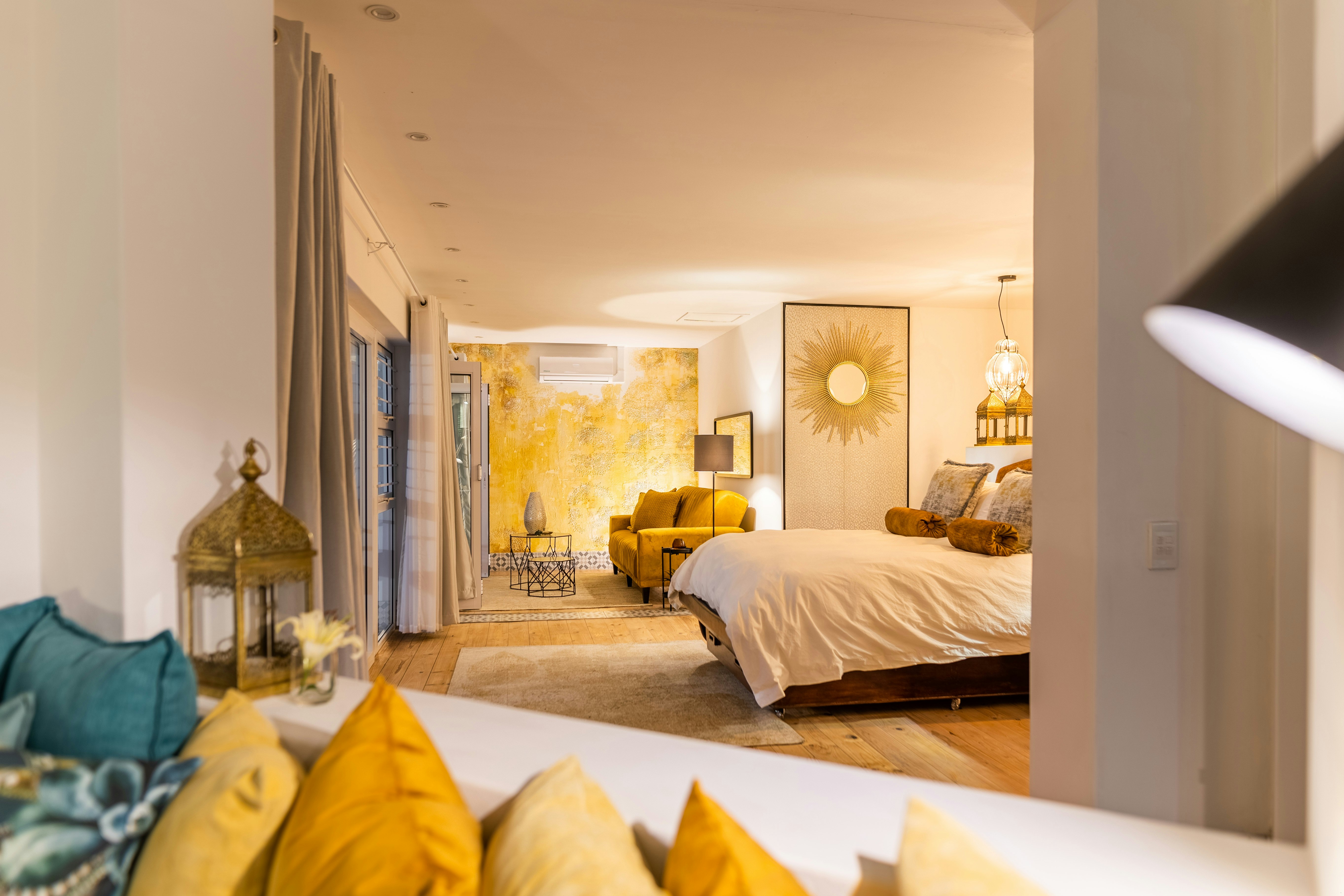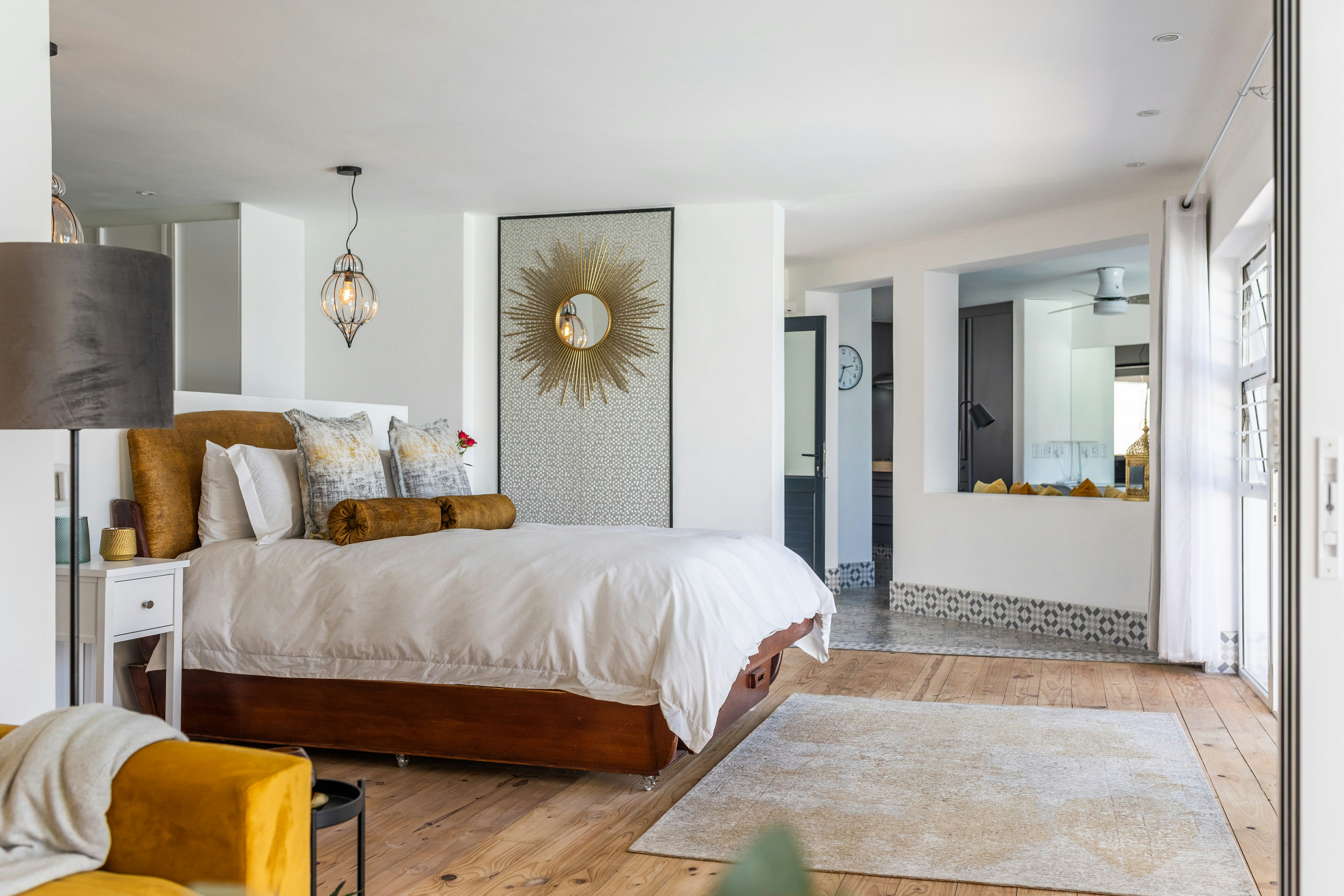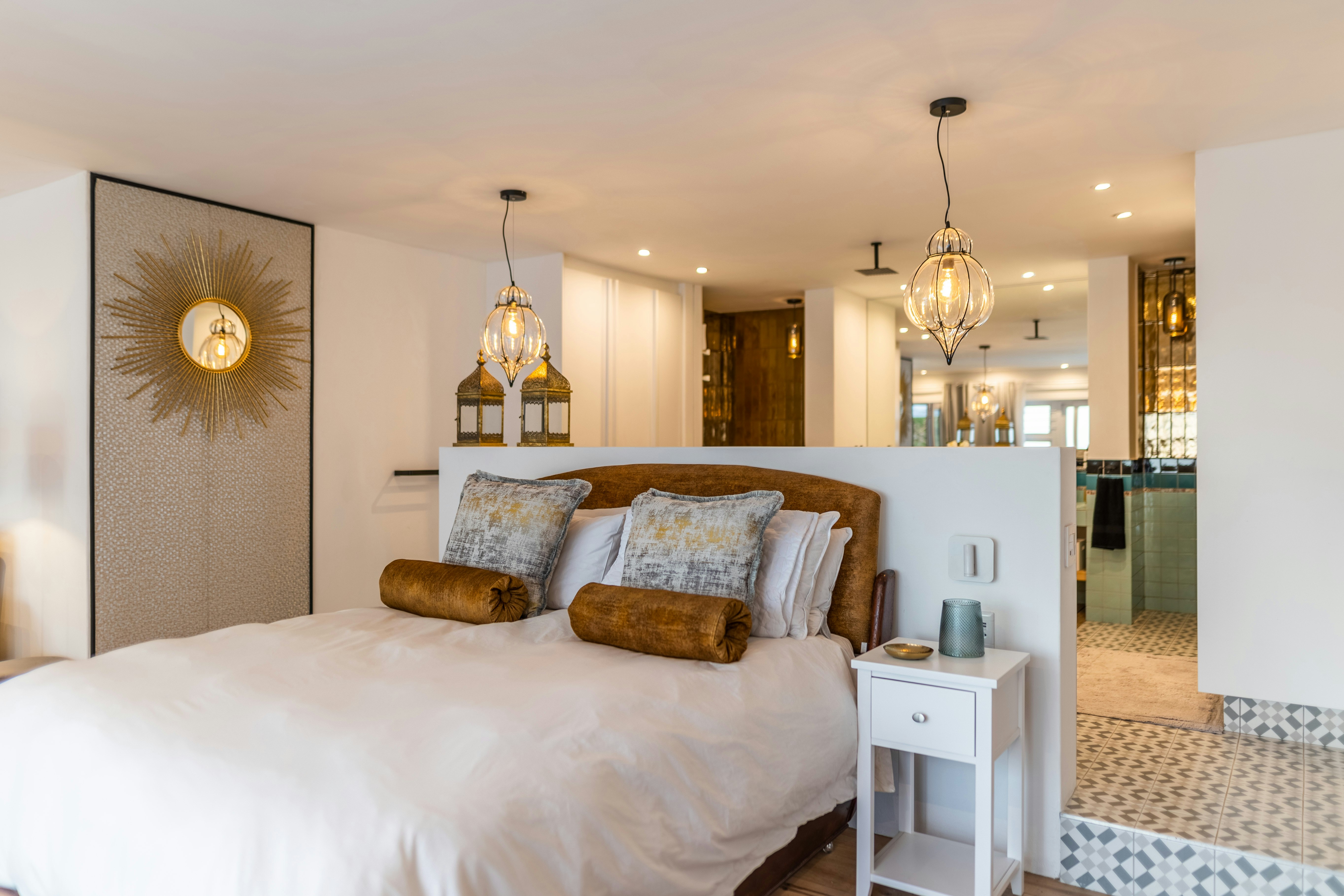The tastefully open-plan bedroom can accommodate 2 guests and is furnished with a queen-size bed and has a stunning en-suite bathroom fitted with an open rain shower in the middle of the room, a bath, his and her basin, and a toilet. Crisp white linen and towels are provided.