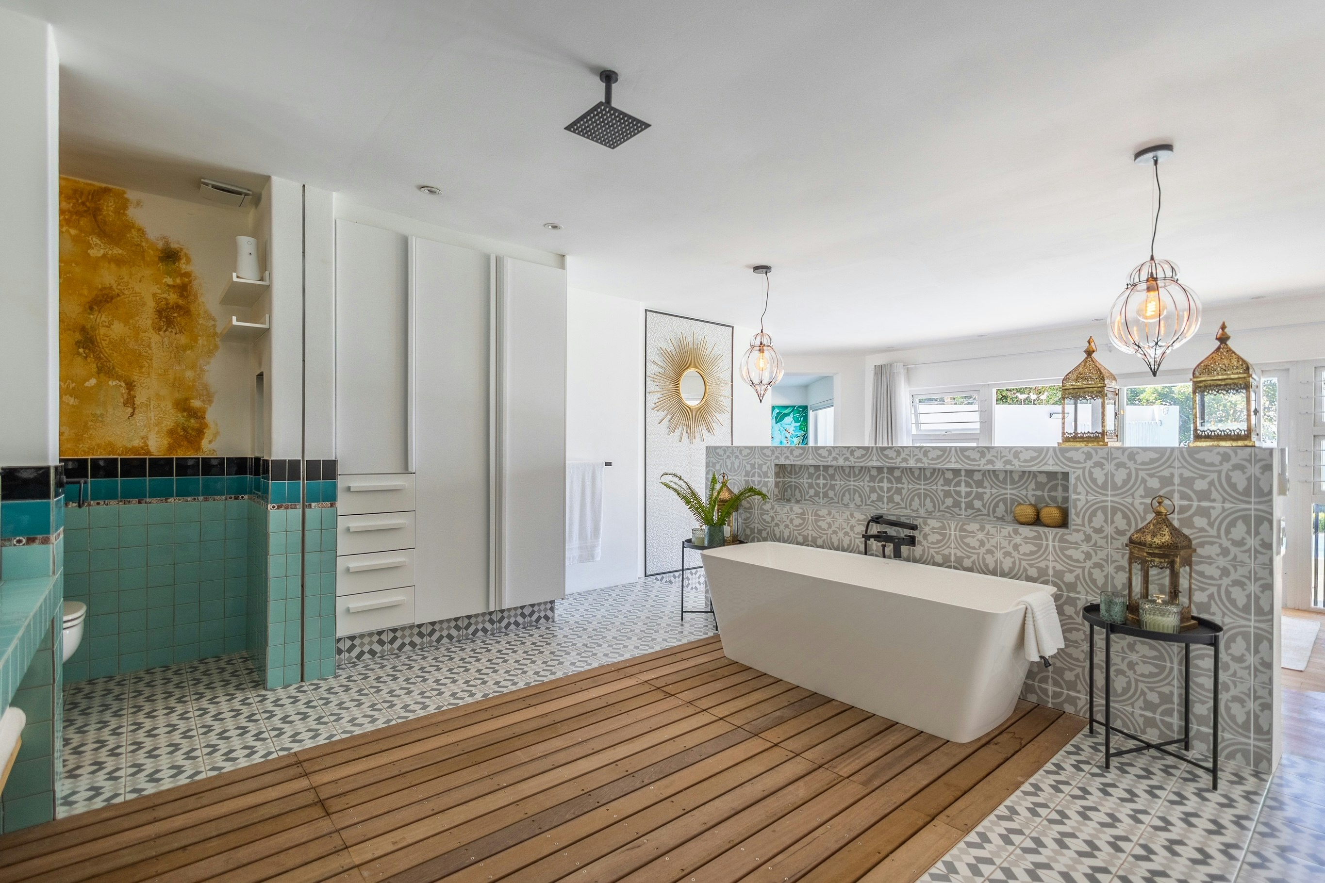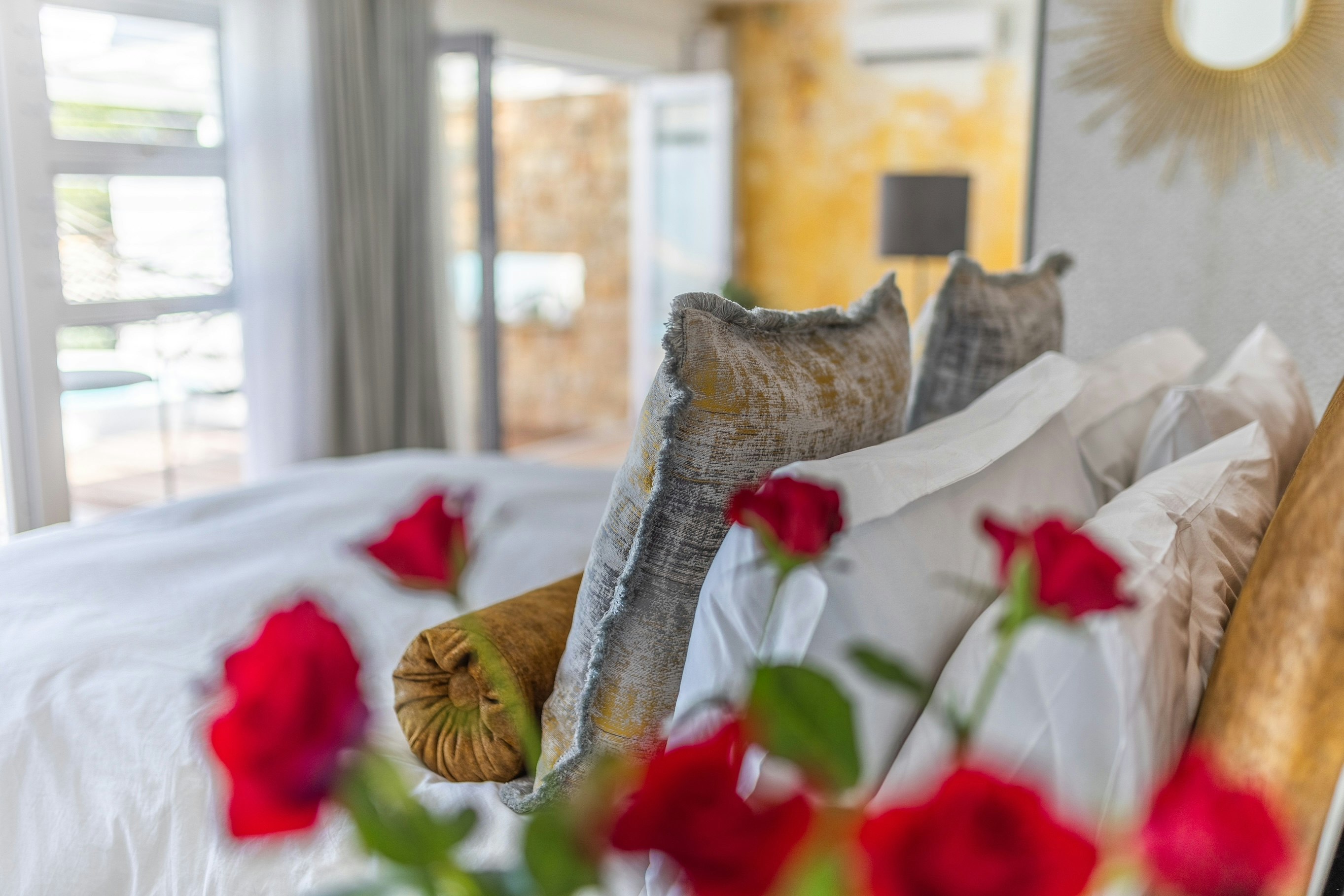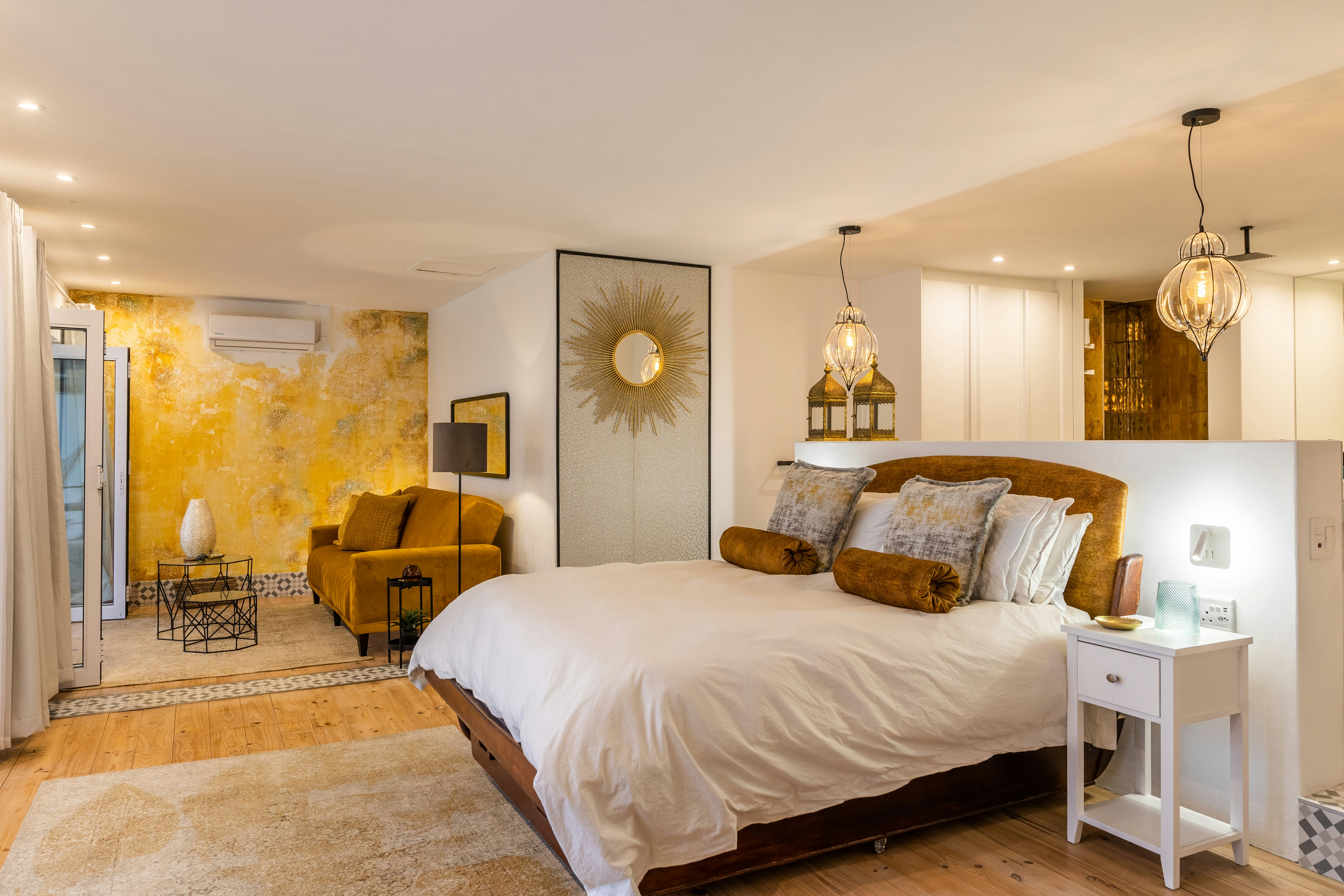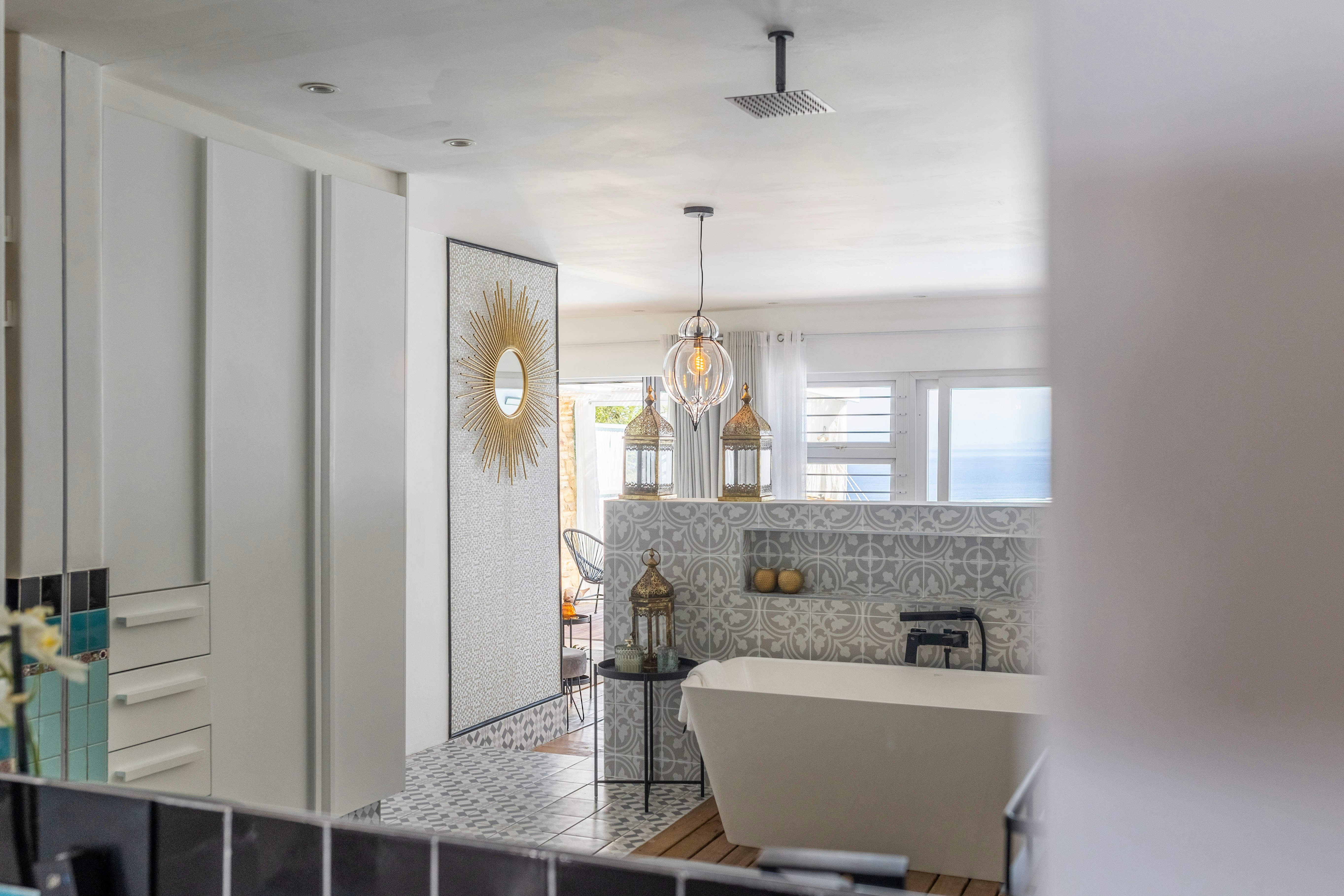 The tastefully open-plan bedroom can accommodate 2 guests and is furnished with a queen-size bed and has a stunning en-suite bathroom fitted with an open rain shower in the middle of the room, a bath, his and her basin, and a toilet. Crisp white linen and towels are provided.