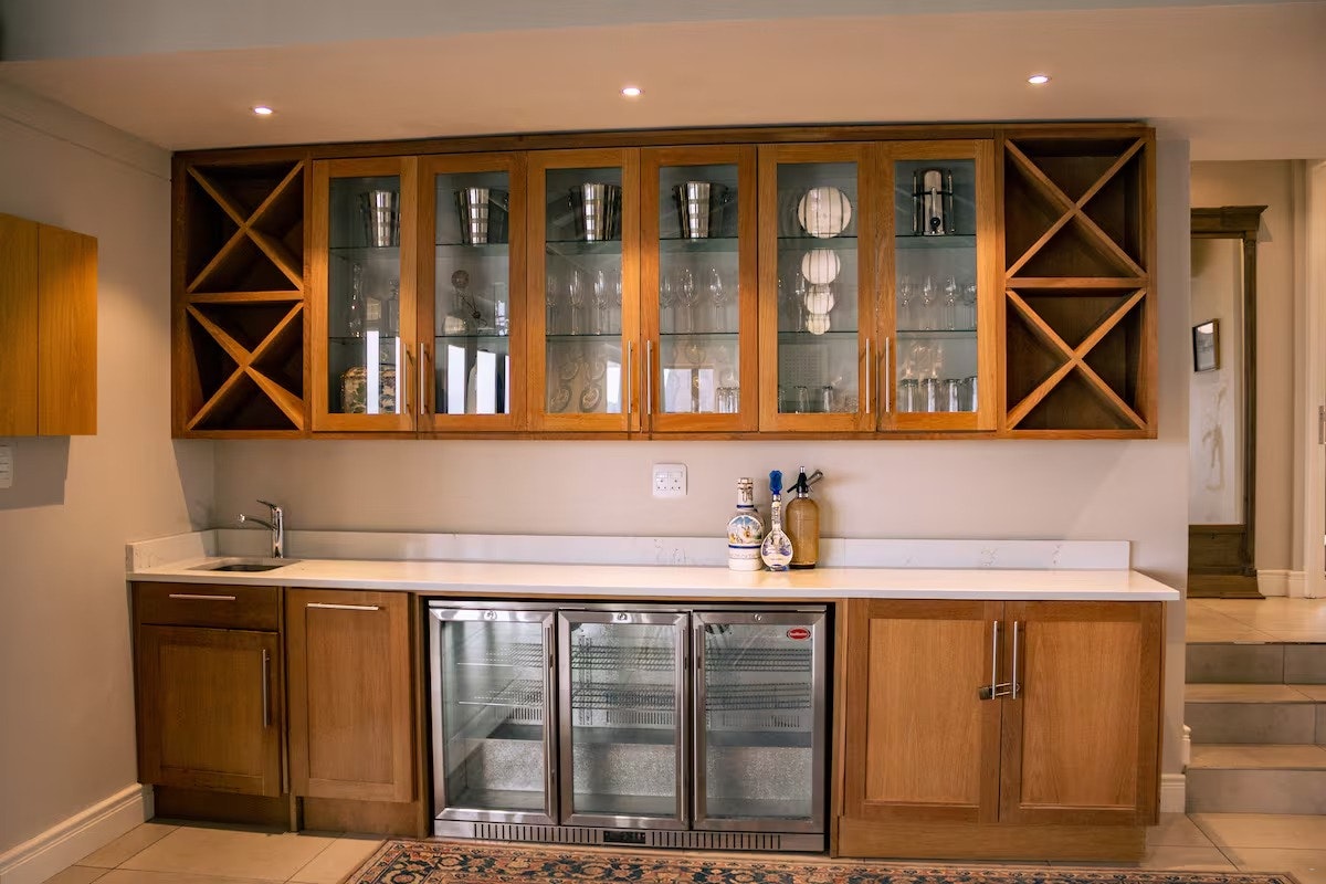 The expansive open-plan living area includes a modern kitchen equipped with a fridge-freezer, gas stove, oven, microwave, cutlery and crockery, and tea- and coffee-making facilities, as well as a breakfast bar with stools. A washing machine, tumble dryer, and dishwasher are also available in the separate scullery. Adjacent to the kitchen is a dining area with a 10-seater dining table, which flows seamlessly into the comfortably furnished lounge. The lounge features a large wood-burning fireplace, a smart TV with streaming services, and complimentary Wi-Fi available throughout the house.