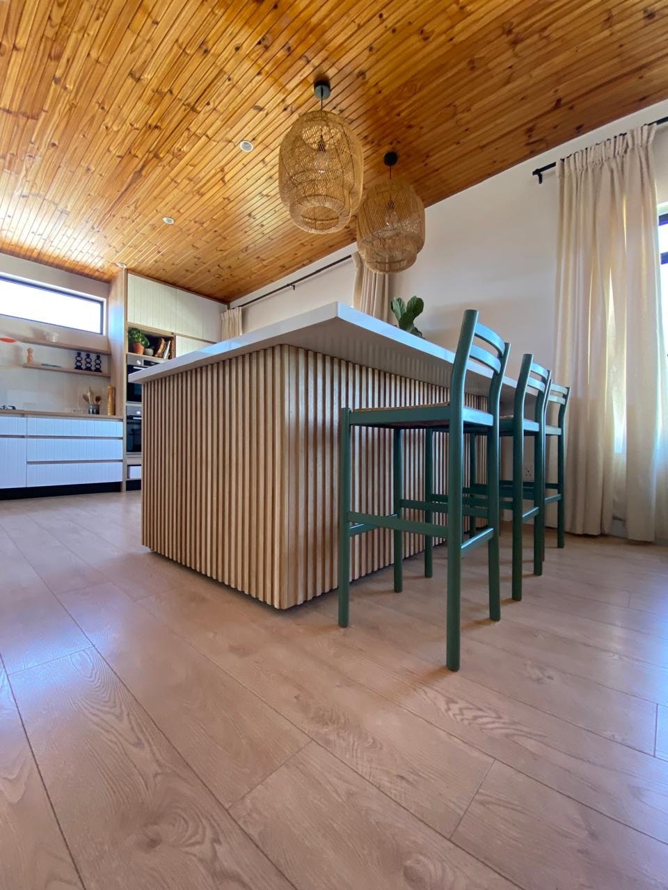 Die toegeruste kombuis sluit 'n yskas-vrieskas, gasstoof, 2 oonde, diepvrieskas, mikrogolfoond, eetgerei, breekware en tee- en koffiemaakgeriewe in. Die kombuis maak oop in 'n eetarea met 'n 14-sitplektafel, perfek vir gesinsmaaltye, en 'n ruim TV-sitkamer. Vir vermaak het die binnebraaikamer 'n pooltafel en veerpyltjiebord, en die binnebraai-area lei na 'n balkon met see-uitsigte.