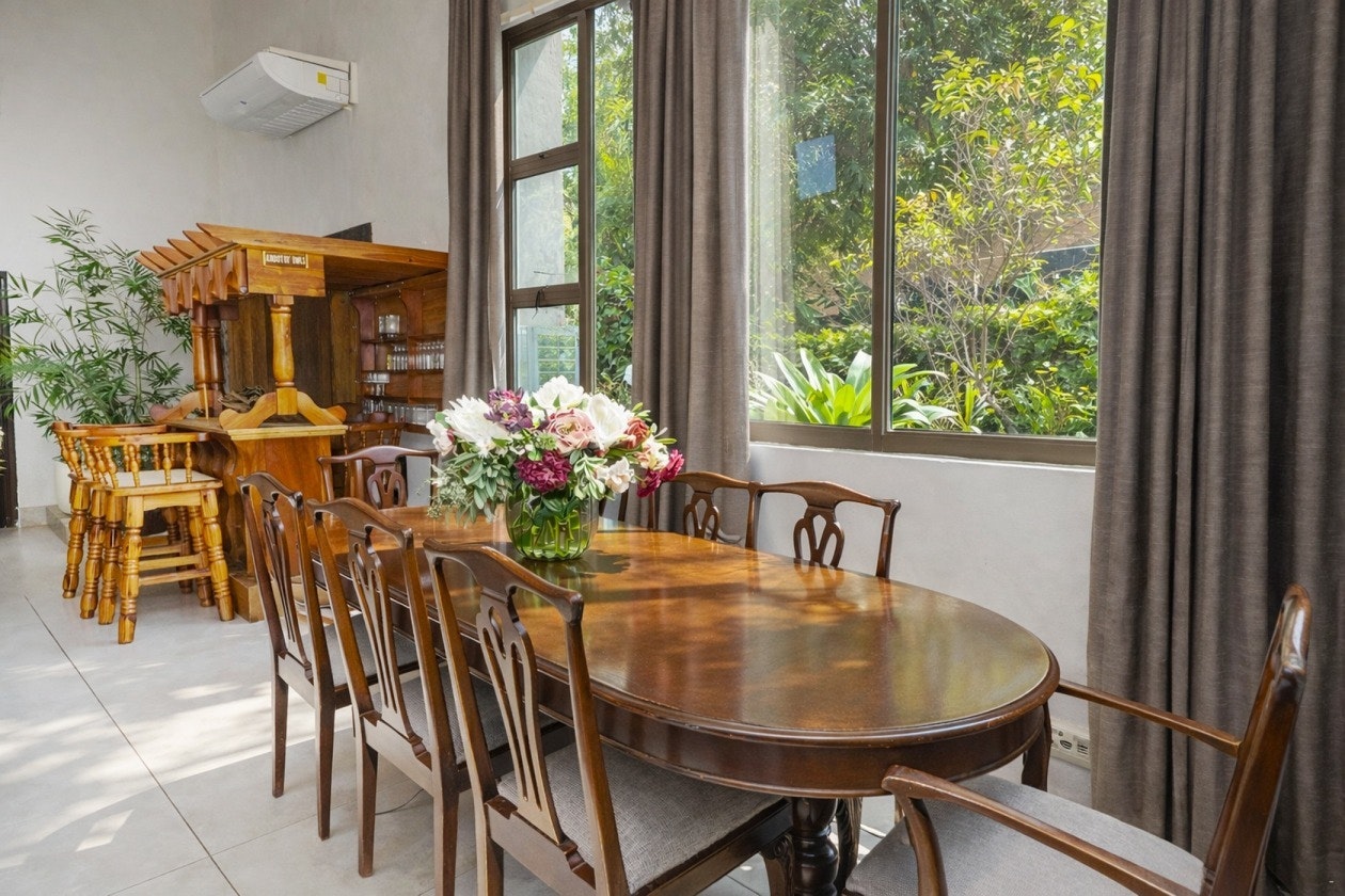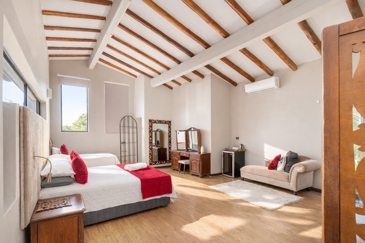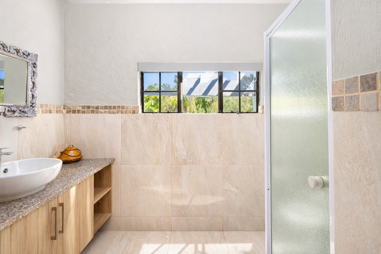 The main house can comfortably accommodate 14 guests and comprises 6 bedrooms and 3 bathrooms. The first bedroom is furnished with a queen-size bed, another 3 bedrooms each contain a double bed, while the other 2 bedrooms each have a double bed and a single bed. Two of the bathrooms have a bath and a shower, while the third bathroom has a shower.
