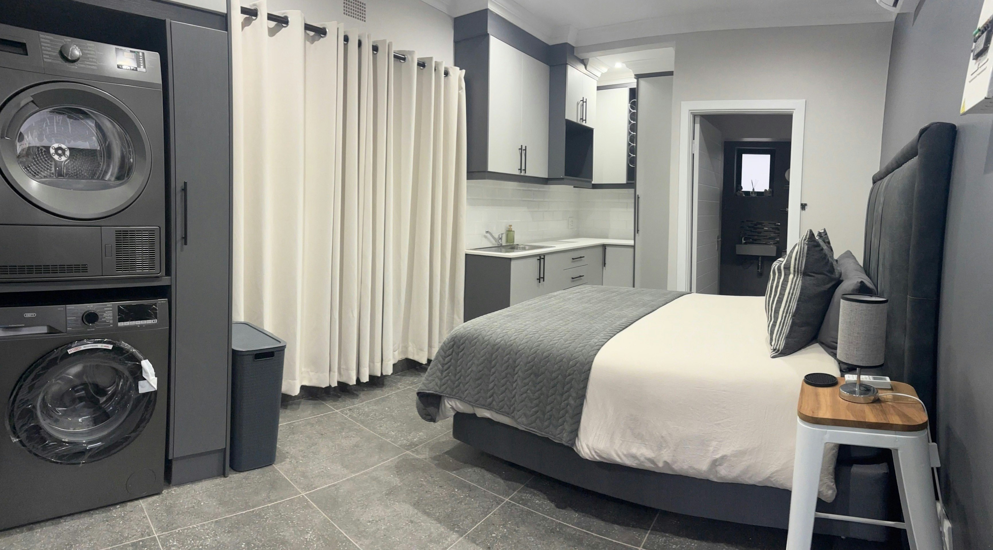 Die ensuite badkamer beskik oor stort, wasbak en toilet. Die slaapkamer het 'n koningingrootte-bed. Daar is wasmasjien en tuimeldroer.