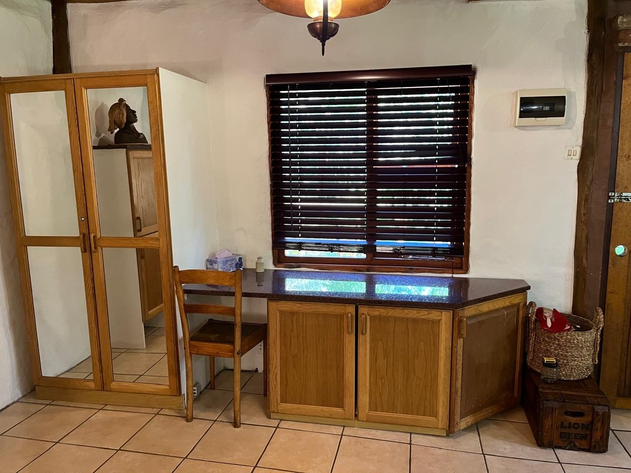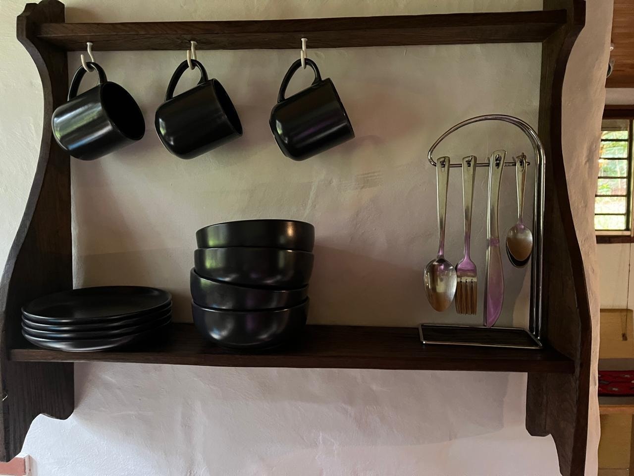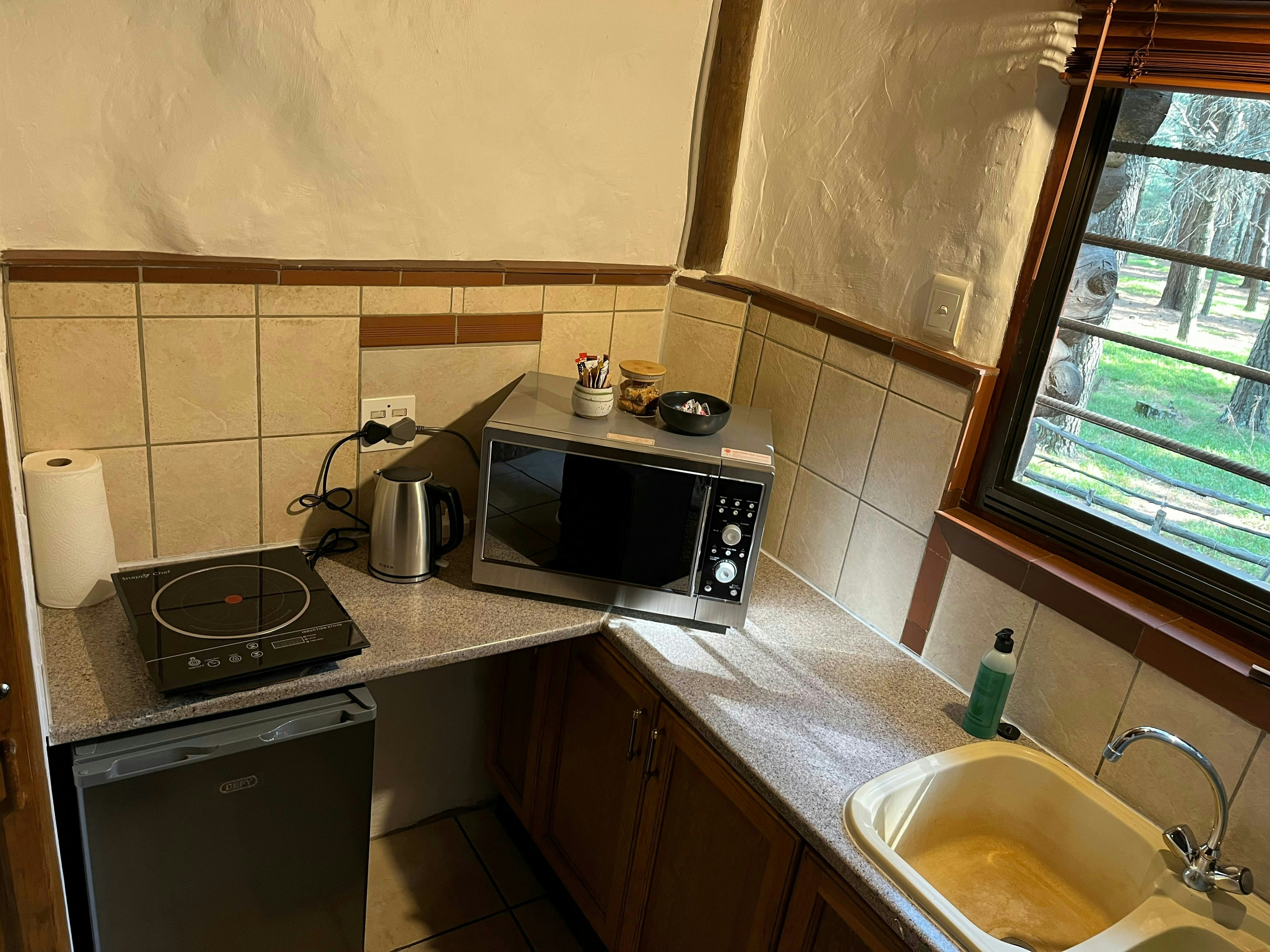 The kitchenette is fitted with a 1-plate induction stove, microwave, bar fridge, kettle, cutlery, and crockery, providing basic self-catering facilities.