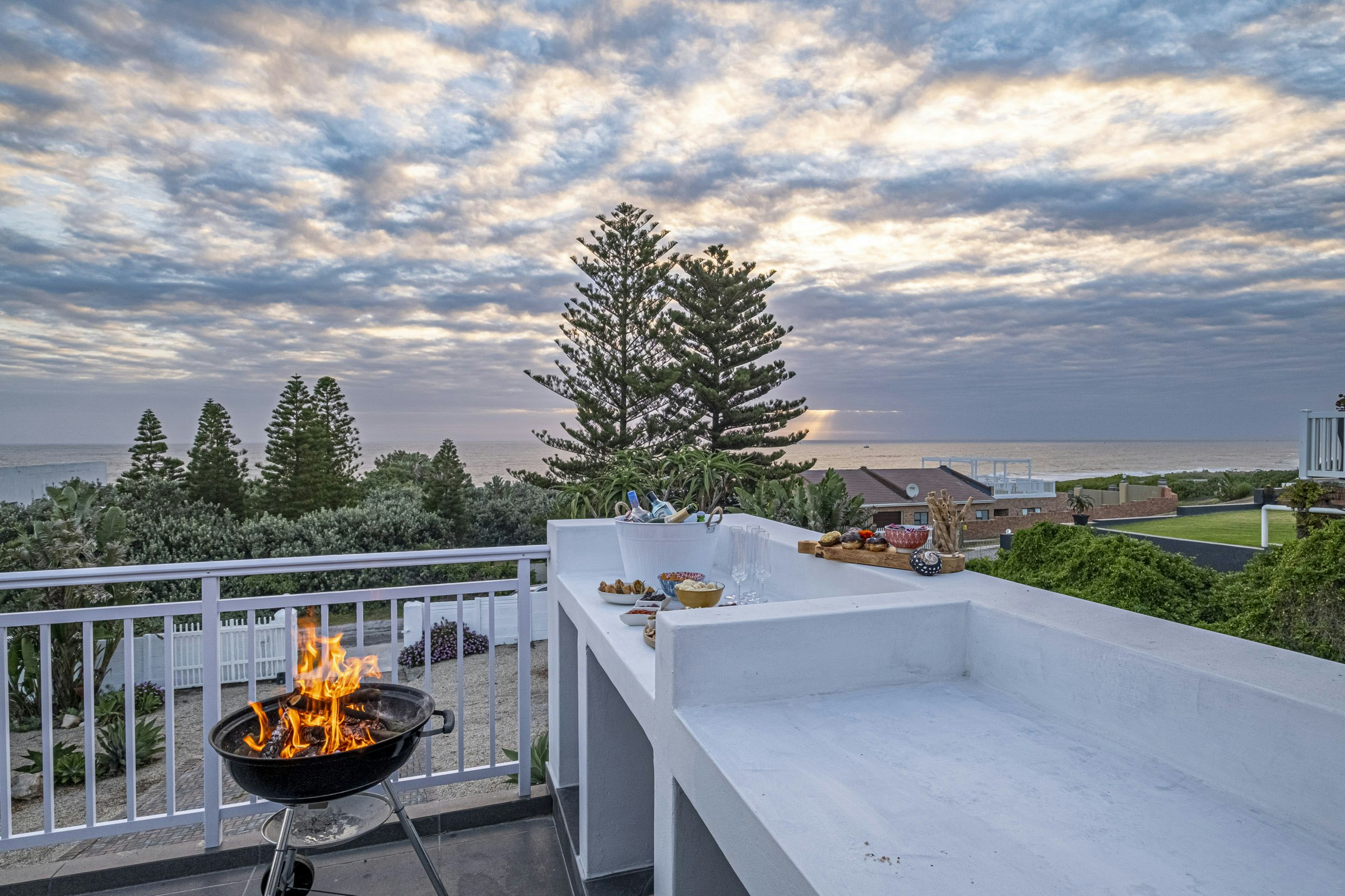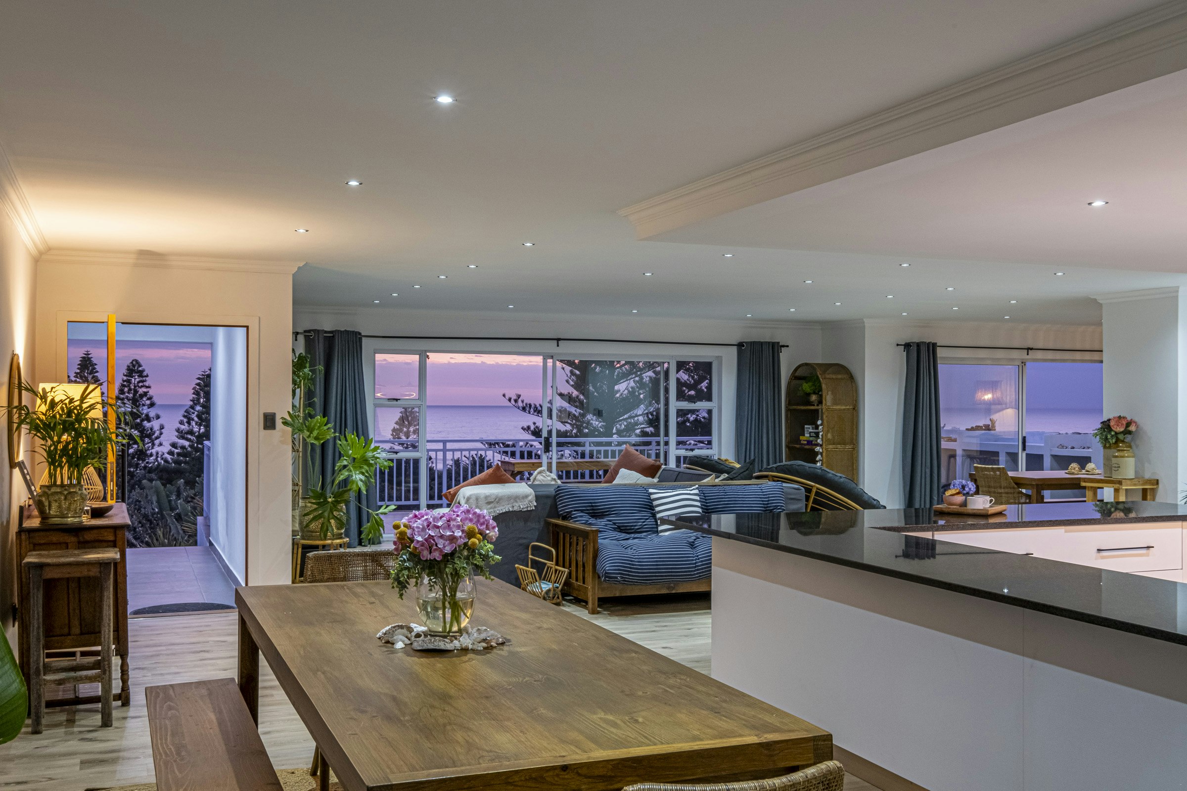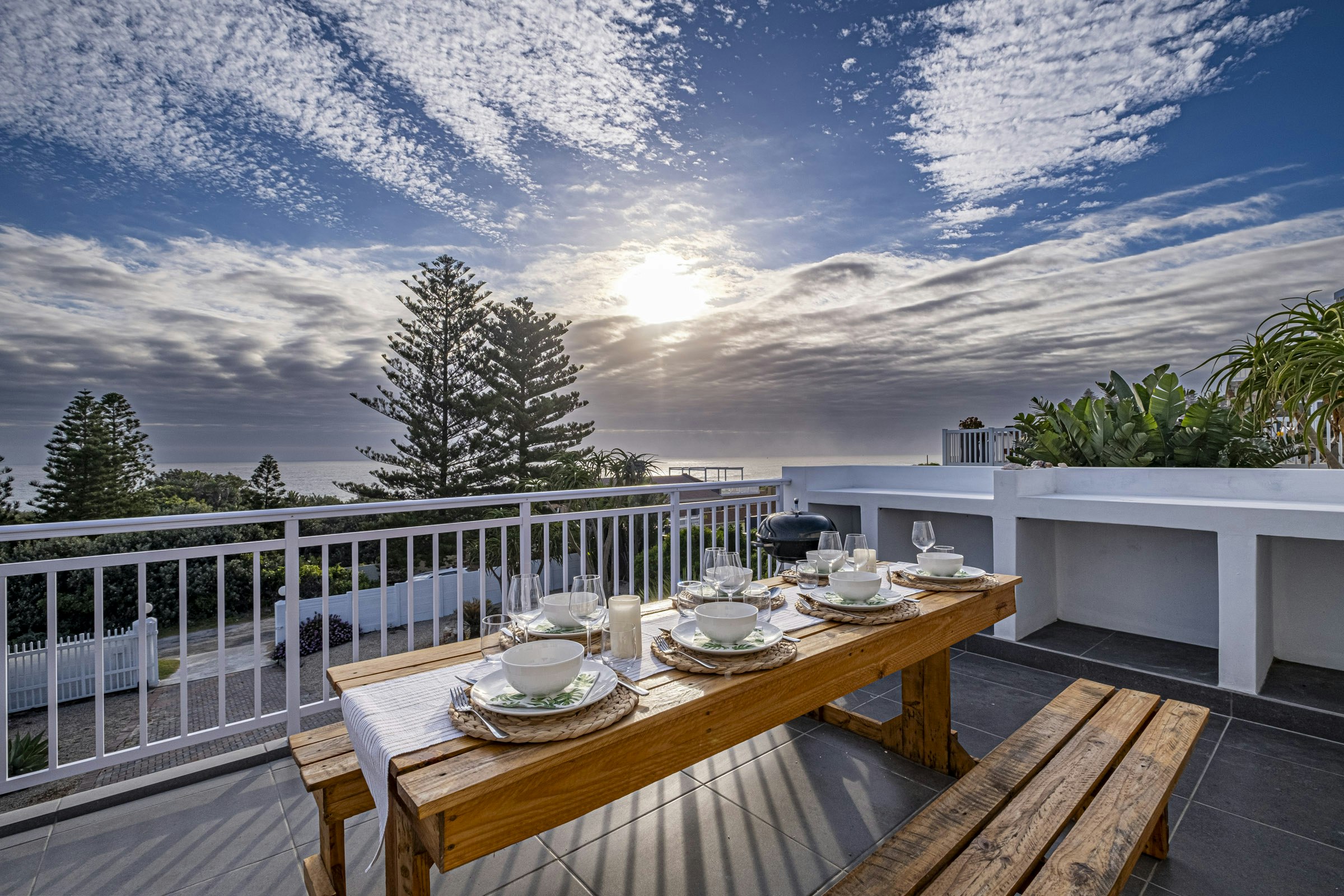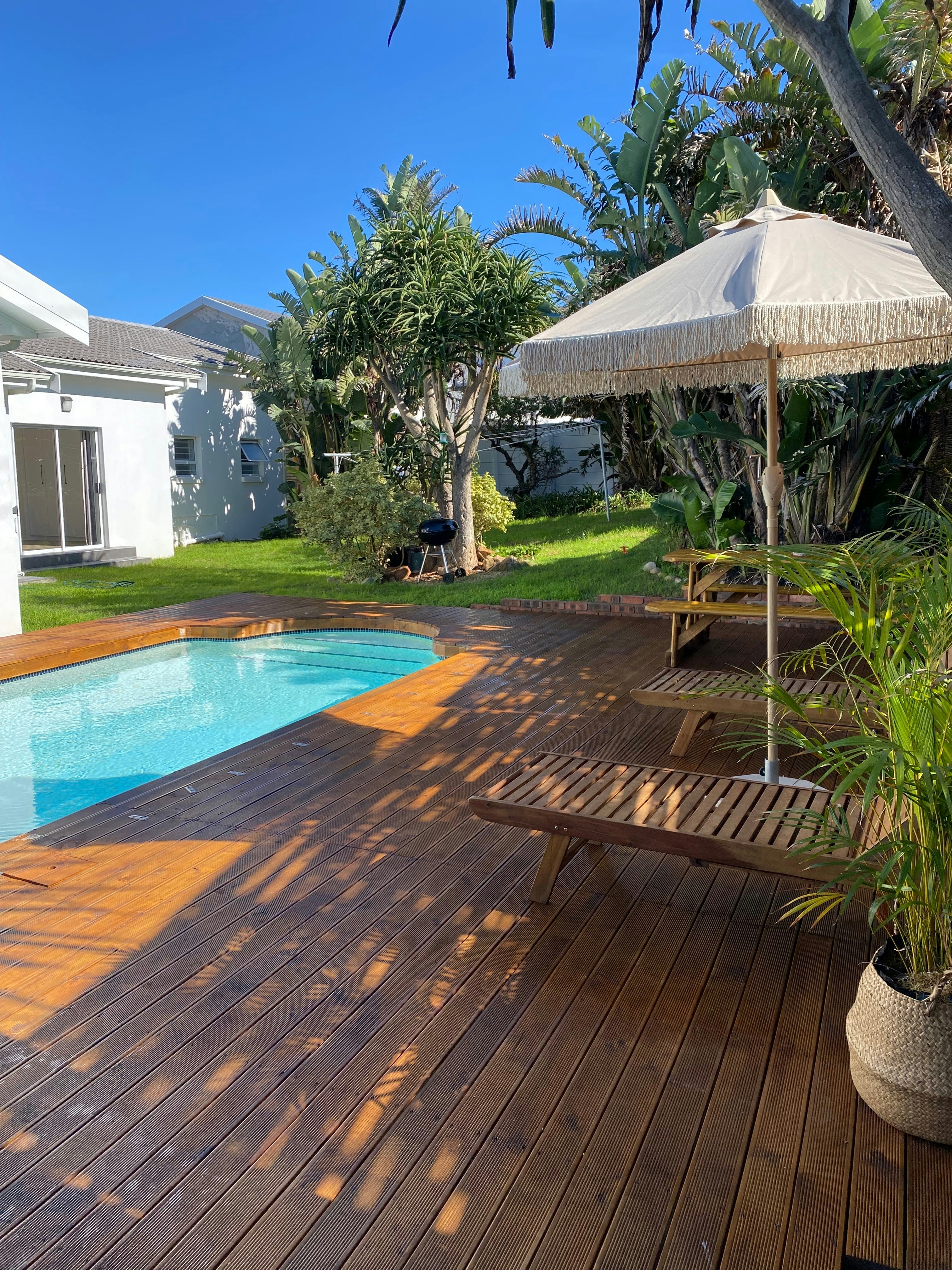 The open-plan kitchen is equipped with a fridge-freezer, gas stove, oven, microwave, air fryer, cutlery and crockery, tea- and coffee-making facilities, dishwasher, washing machine and tumble dryer. The living room is furnished with comfortable seating, a TV, a dining table, and a child-only double sleeper couch for the 2 children. The rooms have glass doors that open to a balcony that is furnished with another dining table, a braai and sea views. Next to the kitchen there is a dining area furnished with a dining table that leads to the entertainment room that is furnished with a pool table, a TV and a bar with stools. The room opens onto the back garden where guests can enjoy a swimming pool and deck area. Access to Wi-Fi is available.