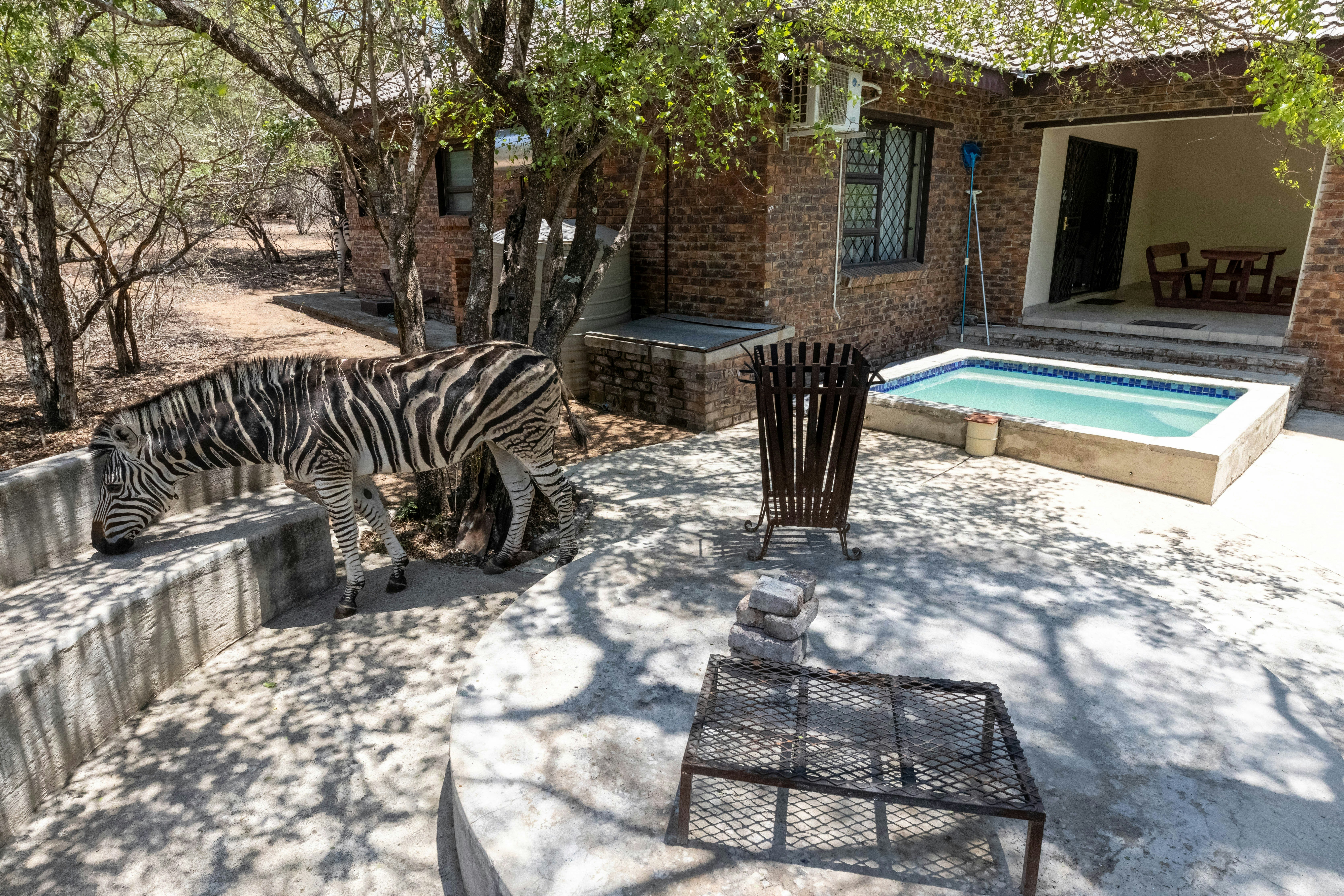 Skuifdeure lei na 'n onderdakstoep met 'n piekniekbankie. Daar is ook 'n skitterende swembad en 'n groot boma met 'n vuurput. Die kuierarea is privaat en bied 'n uitsig oor die park wat 'n ware bosveld-ervaring verseker. 'n Vakansie in Mamba Bush House is onvergeetlik en die omgewing laat gaste toe om baie diere te sien.