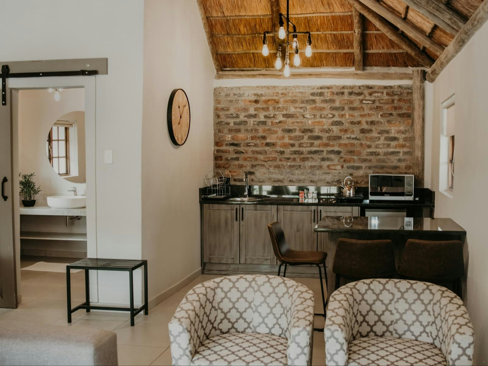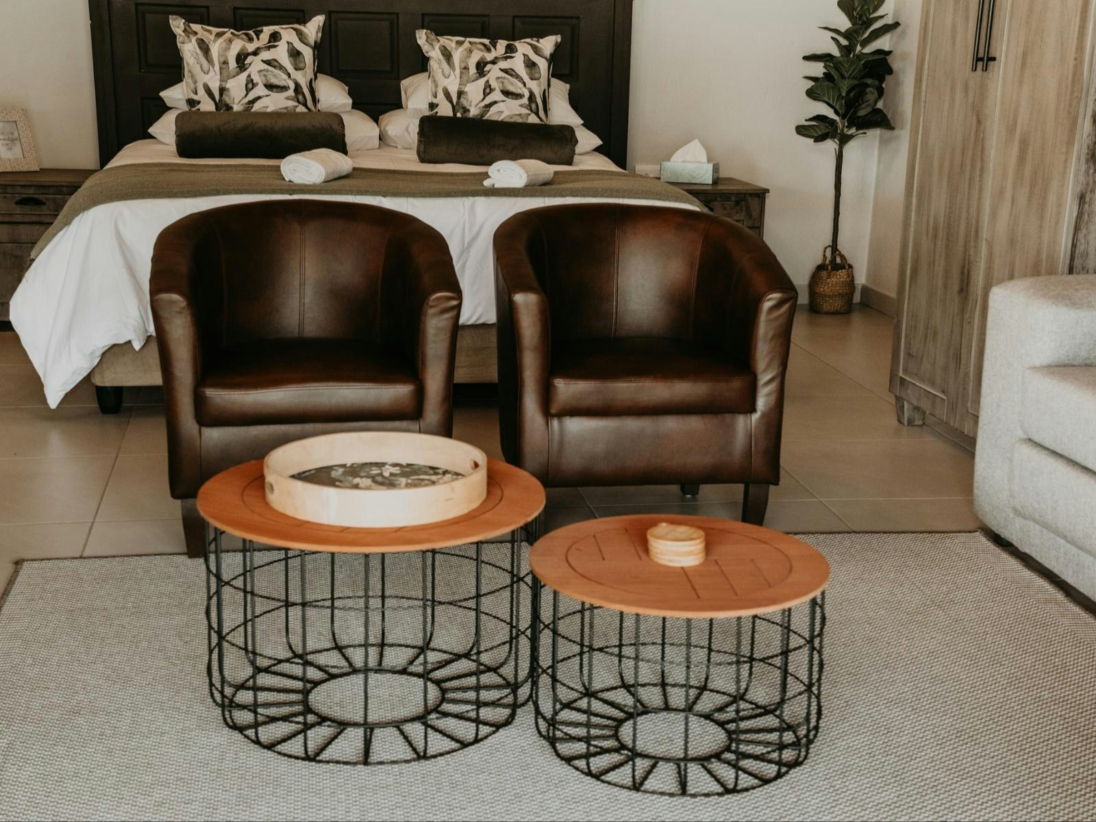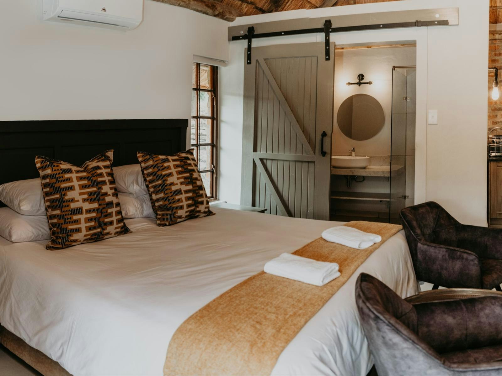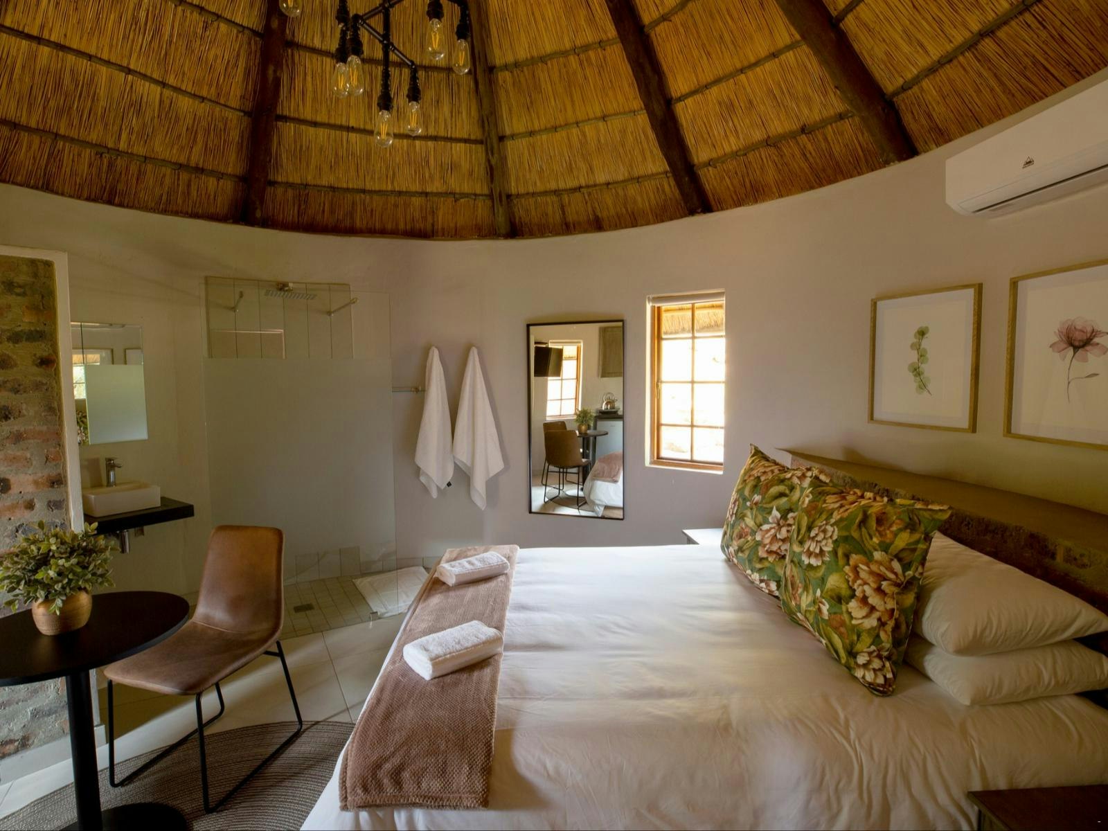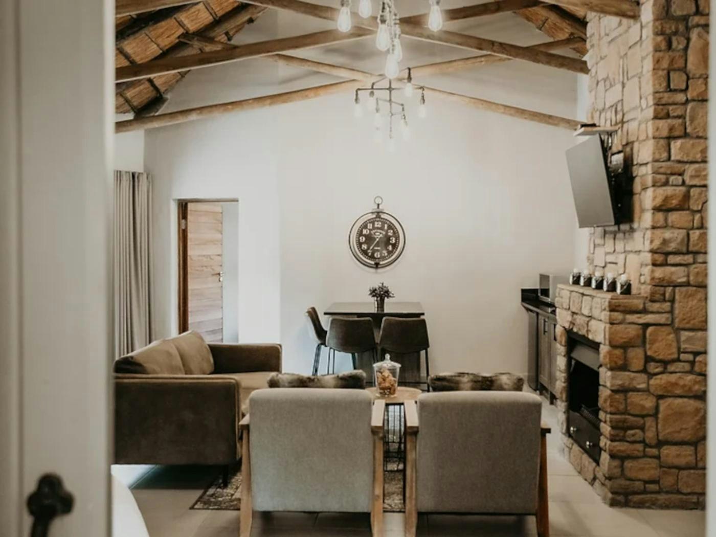 The estate boasts 9 self-catering chalets, each accommodating between 2 to 4 guests. These chalets feature a sleeping area, a living space, and a well-equipped kitchenette. Furnished with either a king- or queen-sized bed, each chalet offers the convenience of en-suite bathrooms. The kitchenettes include a bar fridge, induction plate, microwave, and coffee- and tea-making facilities. Guests can enjoy modern amenities such as Wi-Fi, a TV with DStv channels, air conditioning, braai facilities, and beautiful views of the lake.