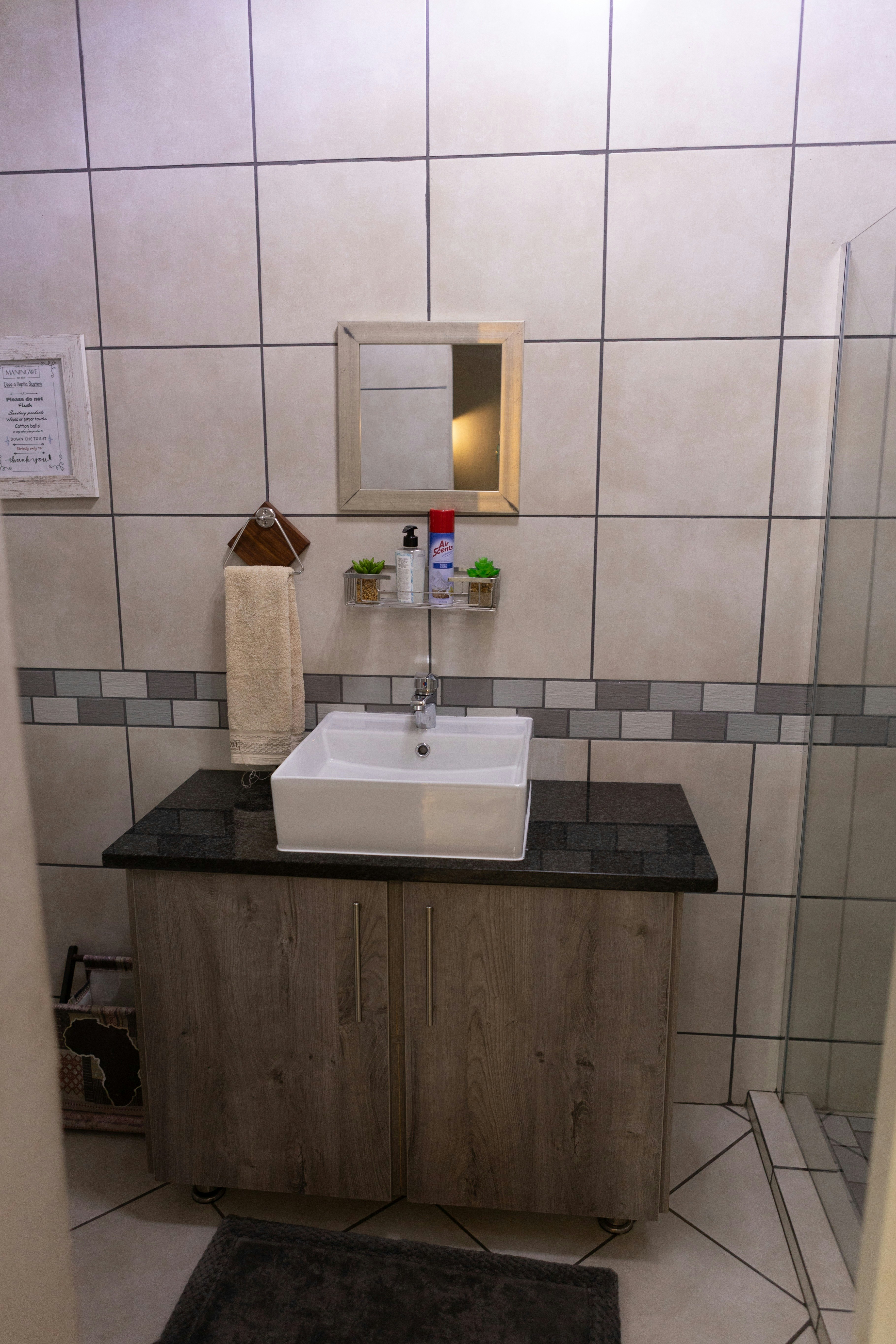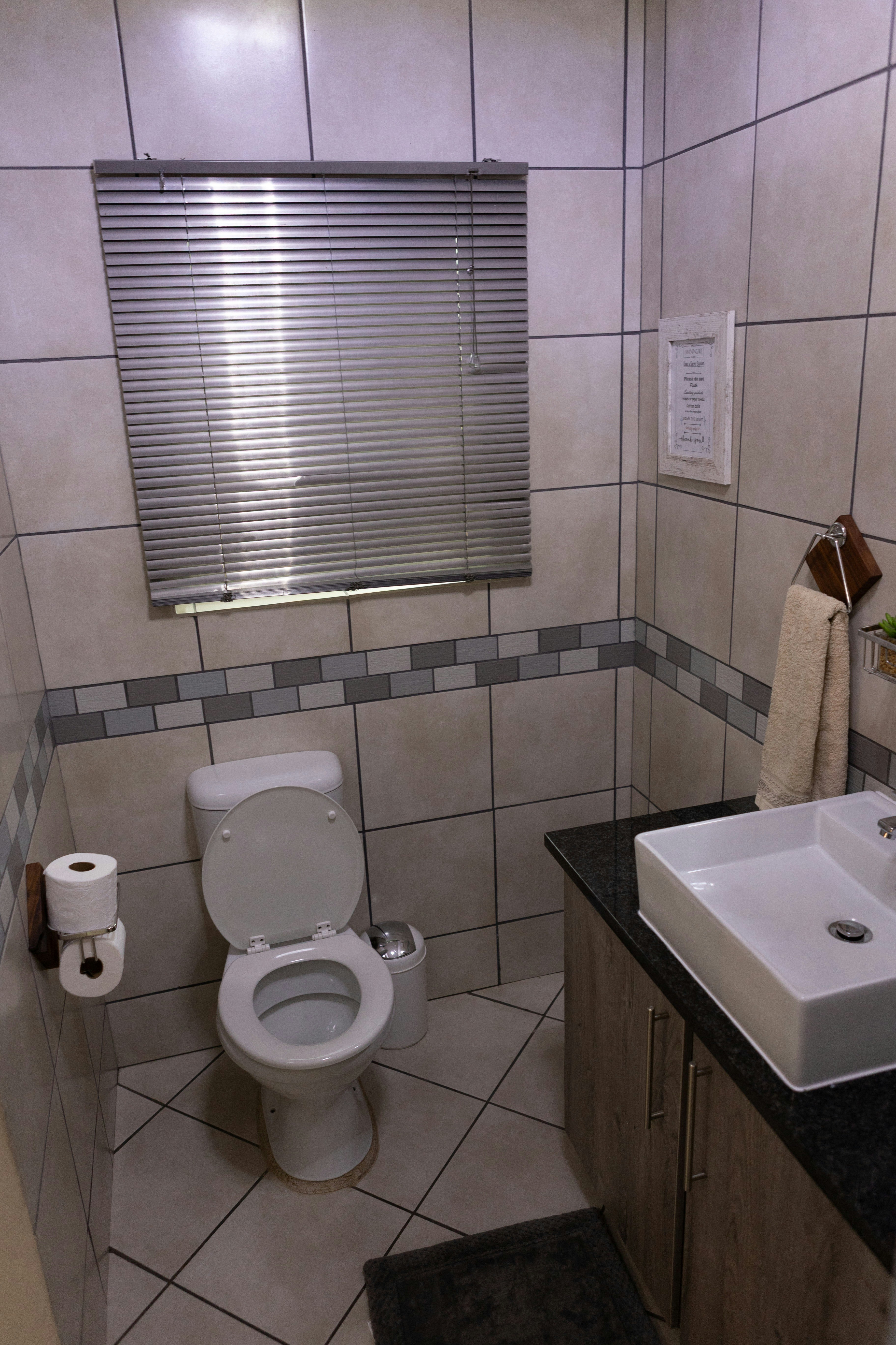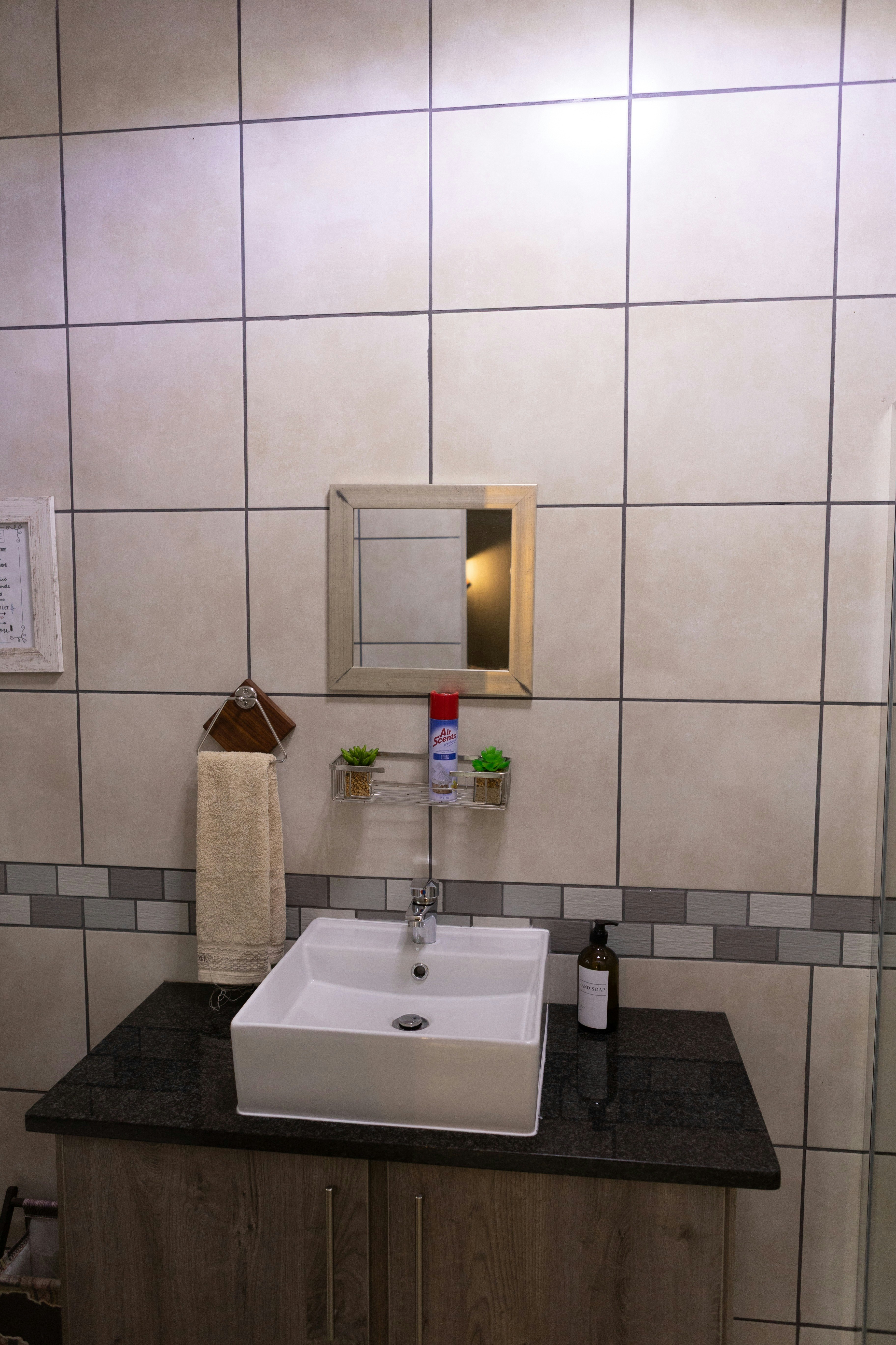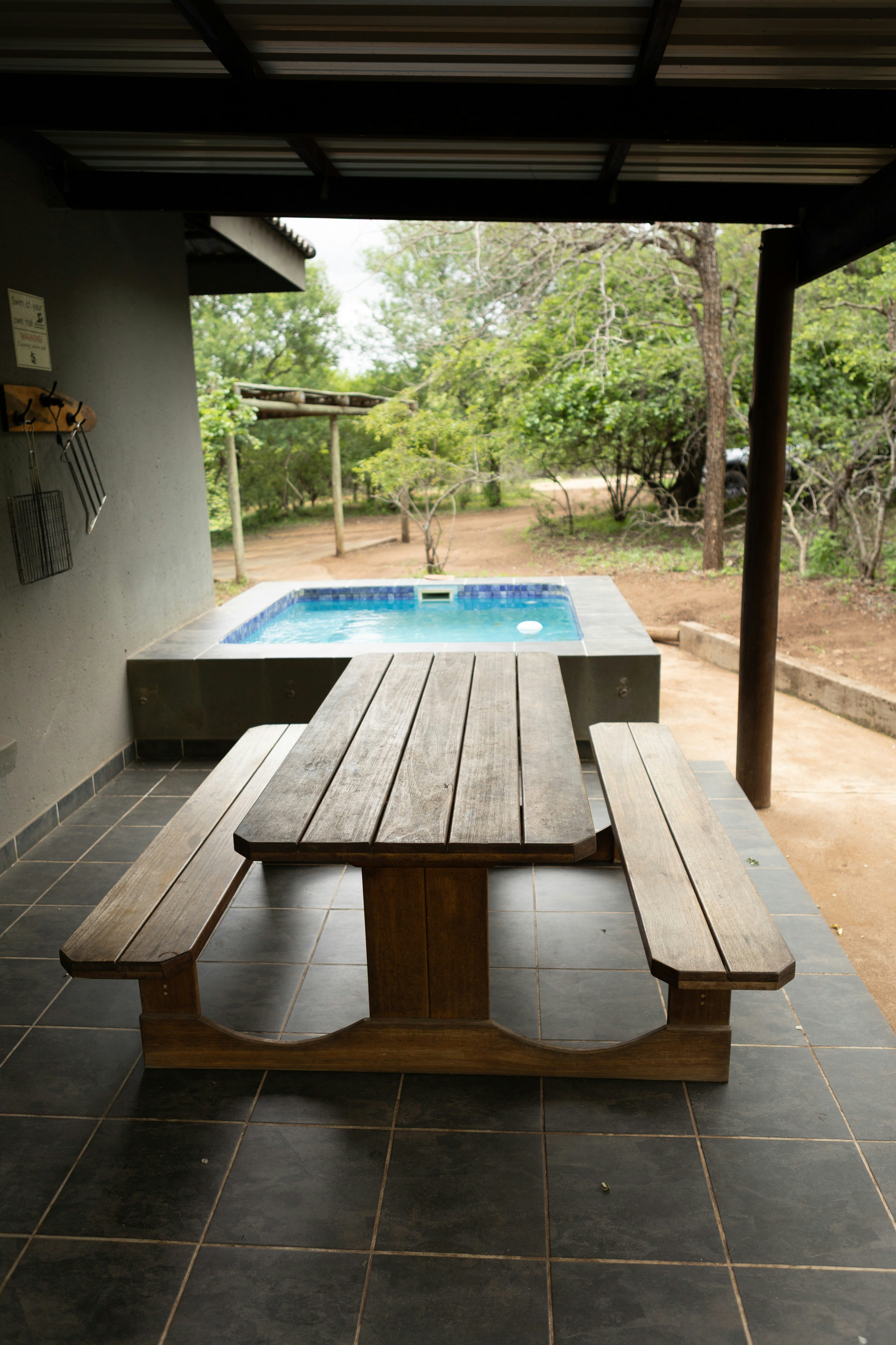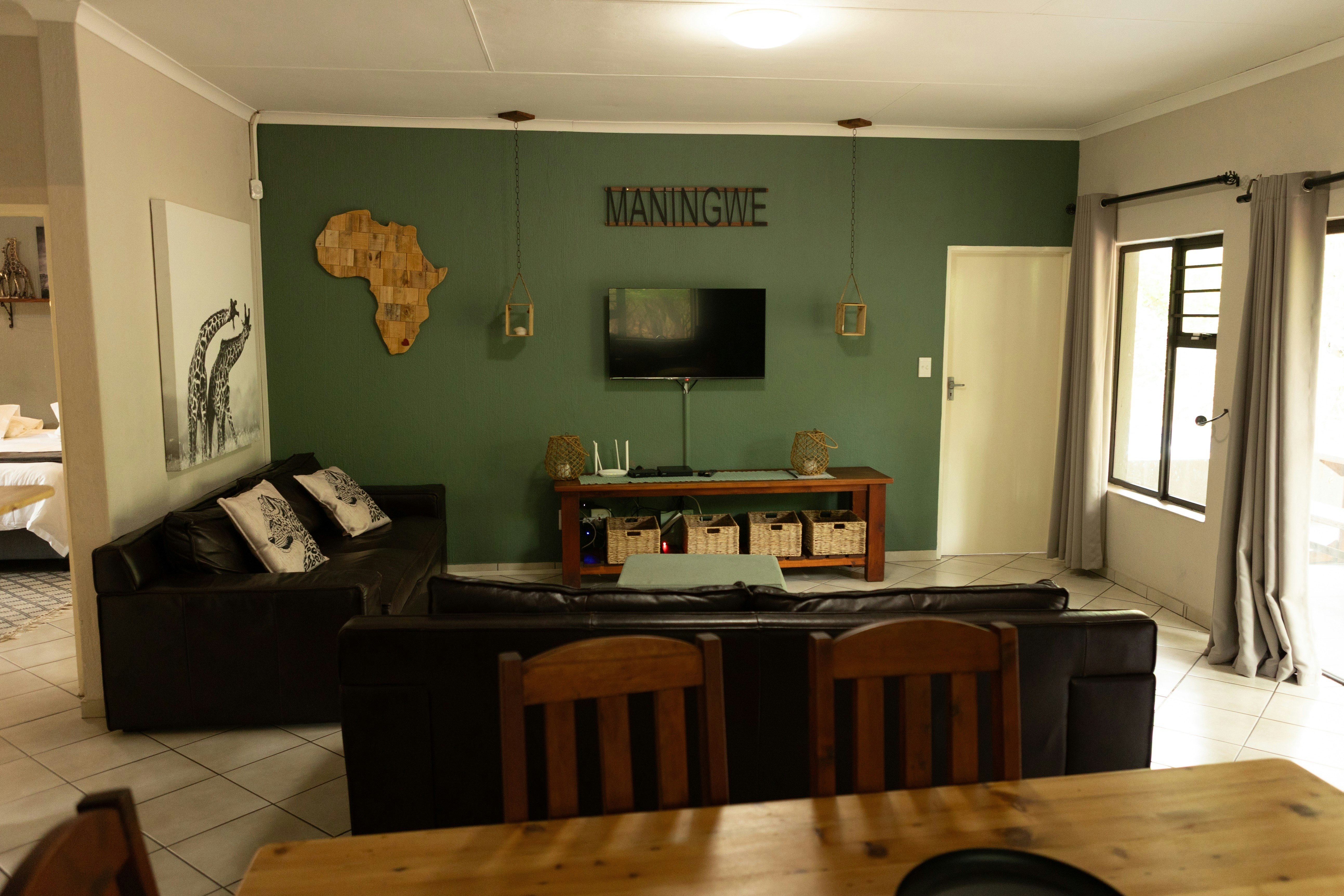 The kitchen is fully equipped for self-catering and contains a stove, oven, fridge-freezer, microwave, dish washer and cutlery and crockery. There is also a washing machine for guests' use. The dining area has seating space for 6 people, while the lounge has a leather lounge suite and a wall-mounted flat-screen TV with full DStv channels, and Netflix. Free Wi-Fi access is also provided. The living area opens up onto a lovely patio area which has a picnic table, a splash pool and a boma with a firepit.