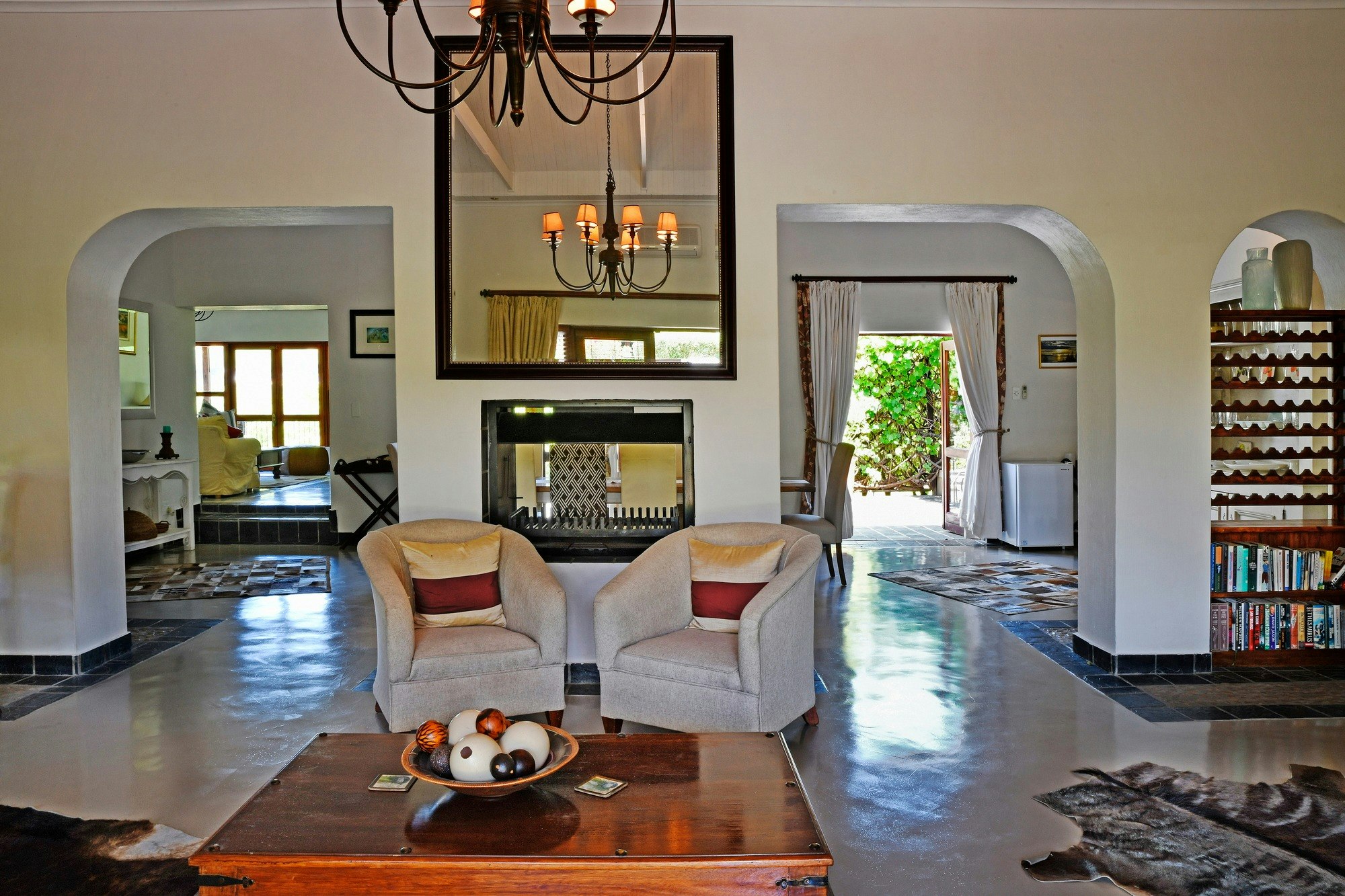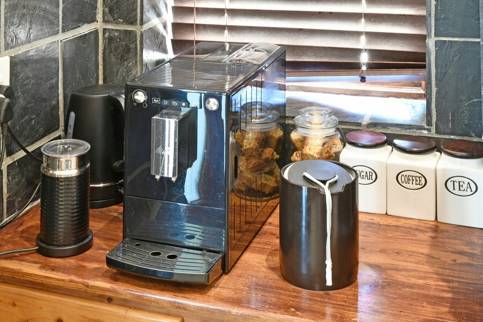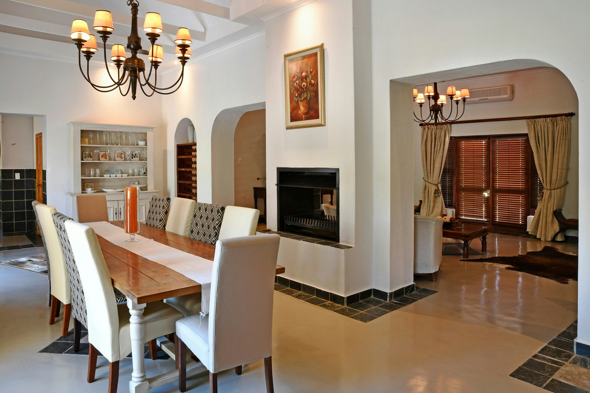 The home features a fully equipped kitchen and scullery that includes an electric stove, gas stove, oven, air fryer, microwave, kettle, toaster, cutlery, crockery, fridge-freezer, bar fridge, dishwasher, washing machine, and tumble dryer. The lounge and dining area offer comfortable seating for guests to dine and relax and also boasts a fireplace. For entertainment, a smart TV with Netflix and access to free Wi-Fi are available.
