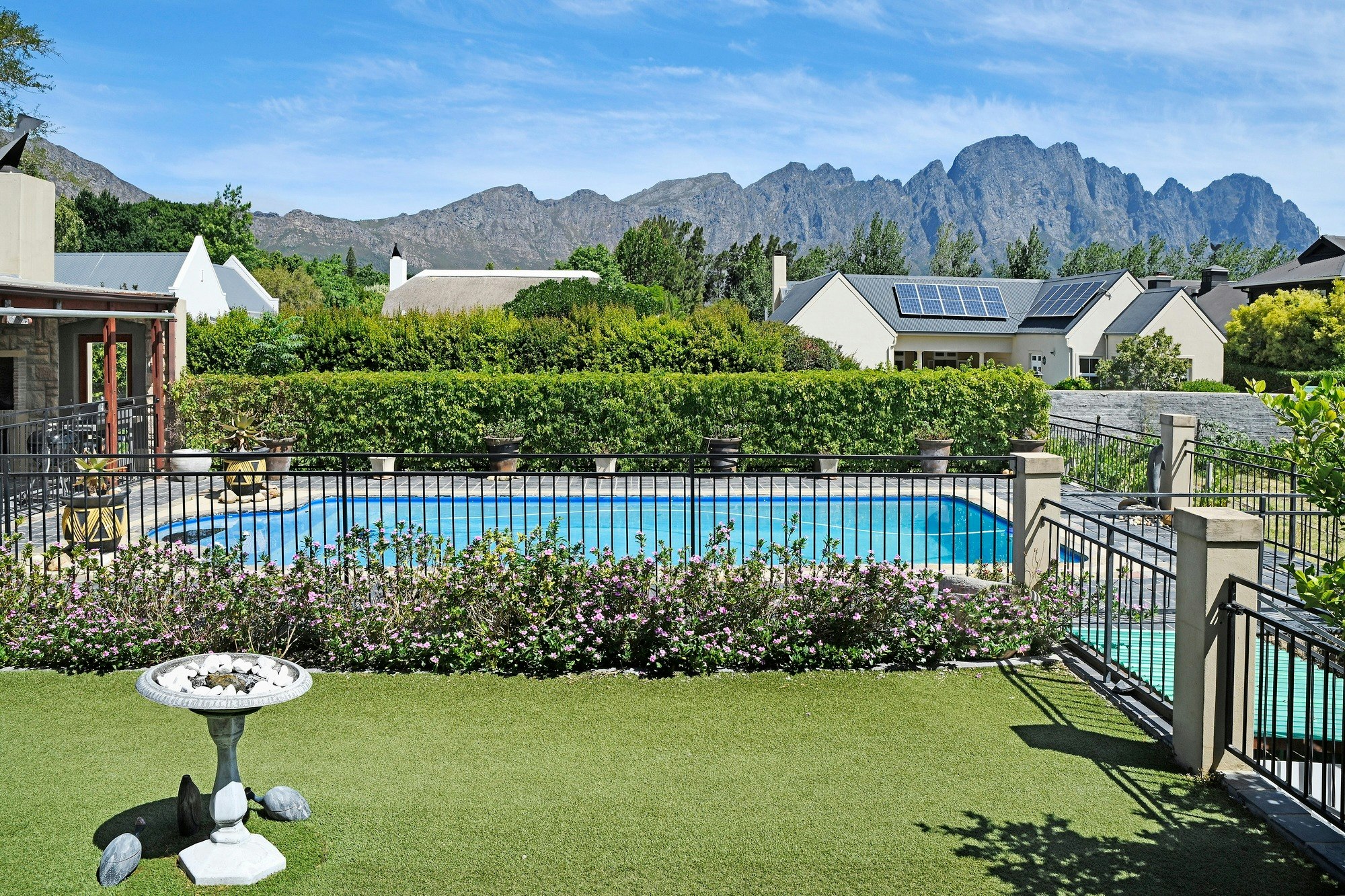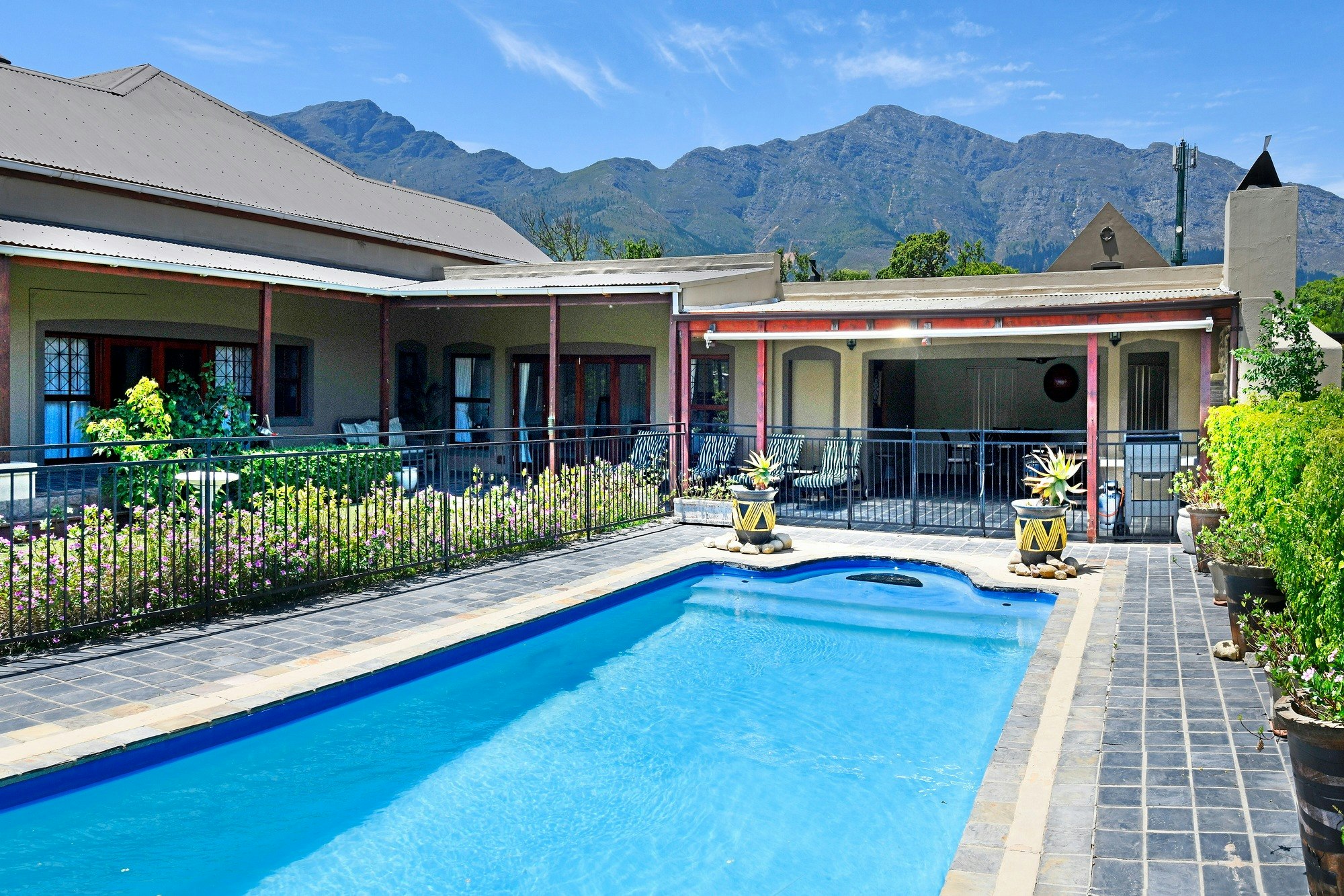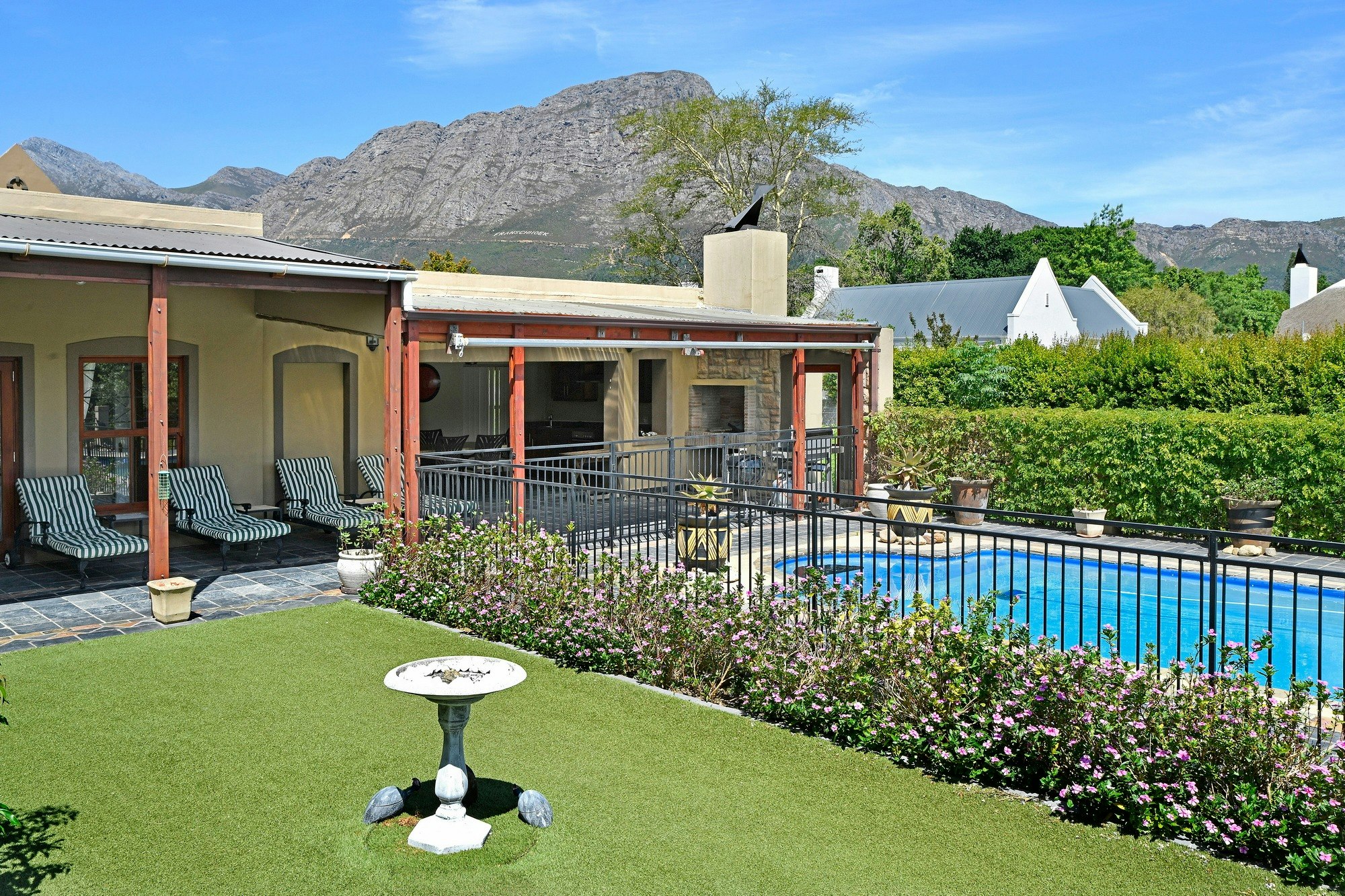 Outside, guests can enjoy a covered patio with an outdoor kitchen and built-in braai. Additionally, a swimming pool and outdoor shower complete this space. Guests are afforded secure garage and driveway parking behind a secure gate. This property is just a short walk from Franschhoek’s shops and restaurants, only 150 m from the Franschhoek Wine Tram Terminal, and 500 m from the bustling Franschhoek Market.