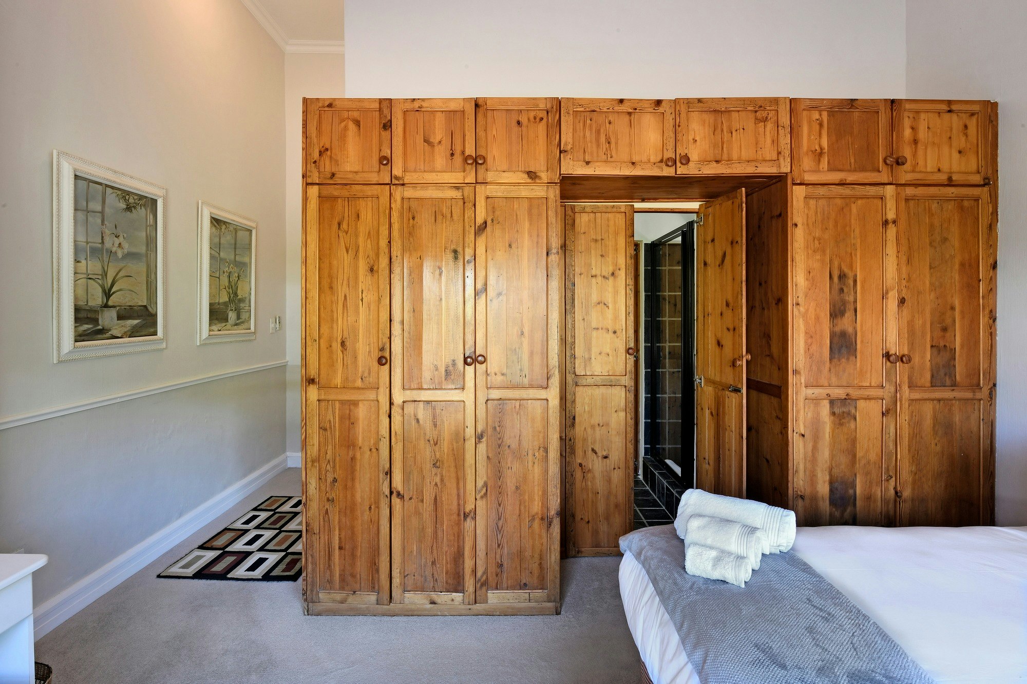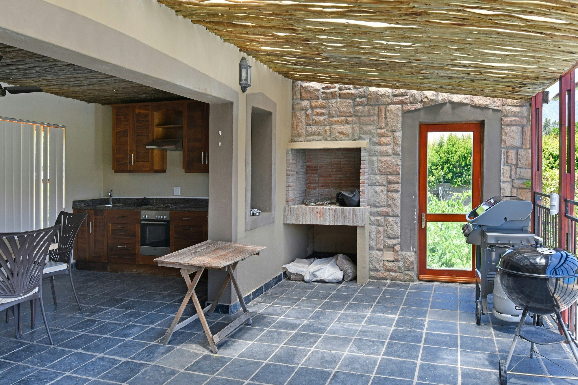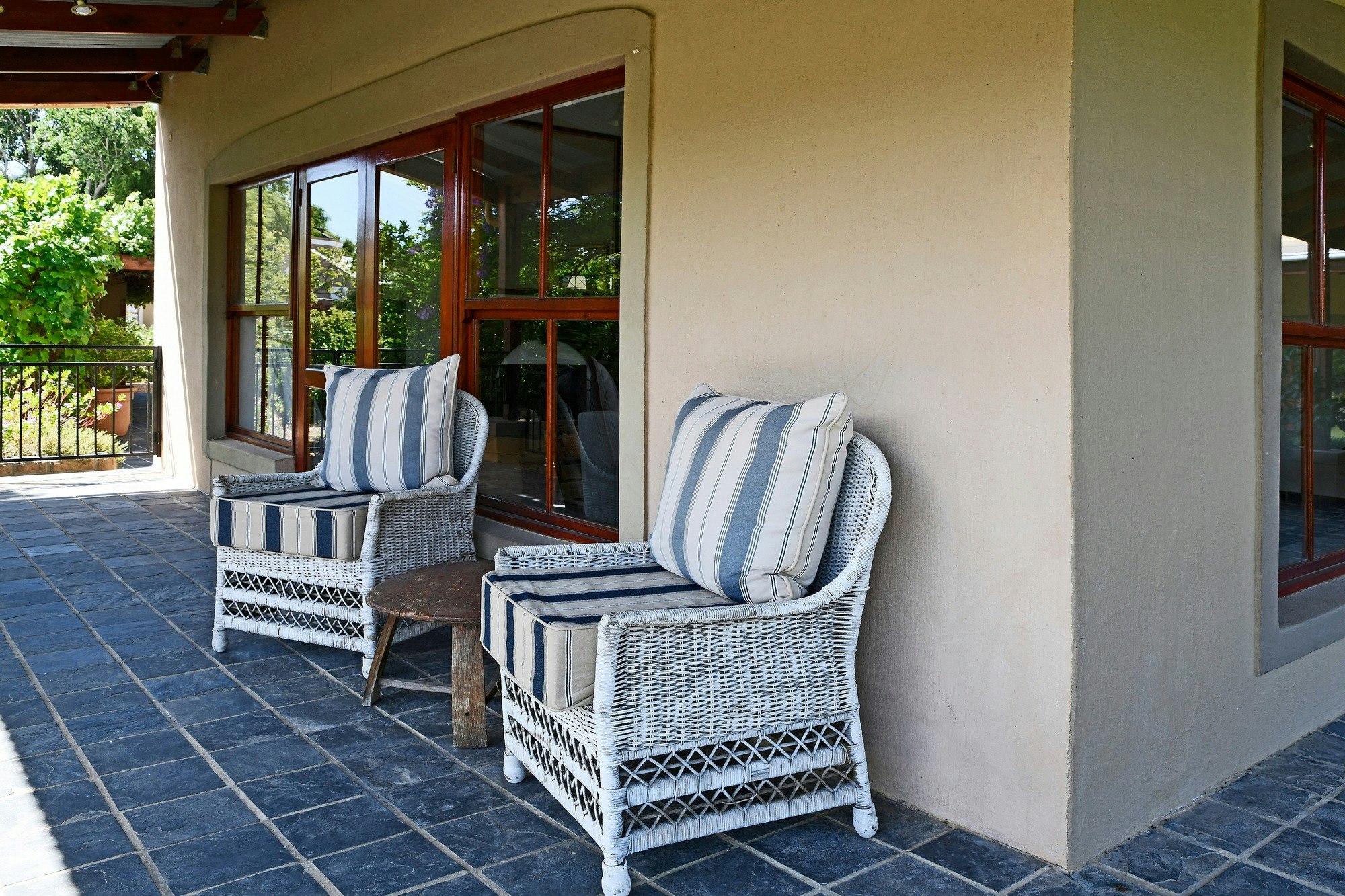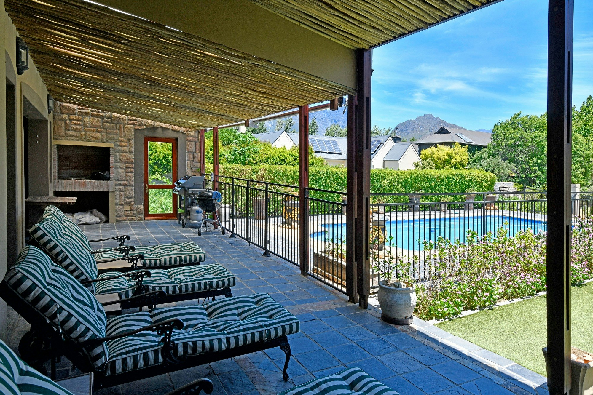 Outside, guests can enjoy a covered patio with an outdoor kitchen and built-in braai. Additionally, a swimming pool and outdoor shower complete this space. Guests are afforded secure garage and driveway parking behind a secure gate. This property is just a short walk from Franschhoek’s shops and restaurants, only 150 m from the Franschhoek Wine Tram Terminal, and 500 m from the bustling Franschhoek Market.