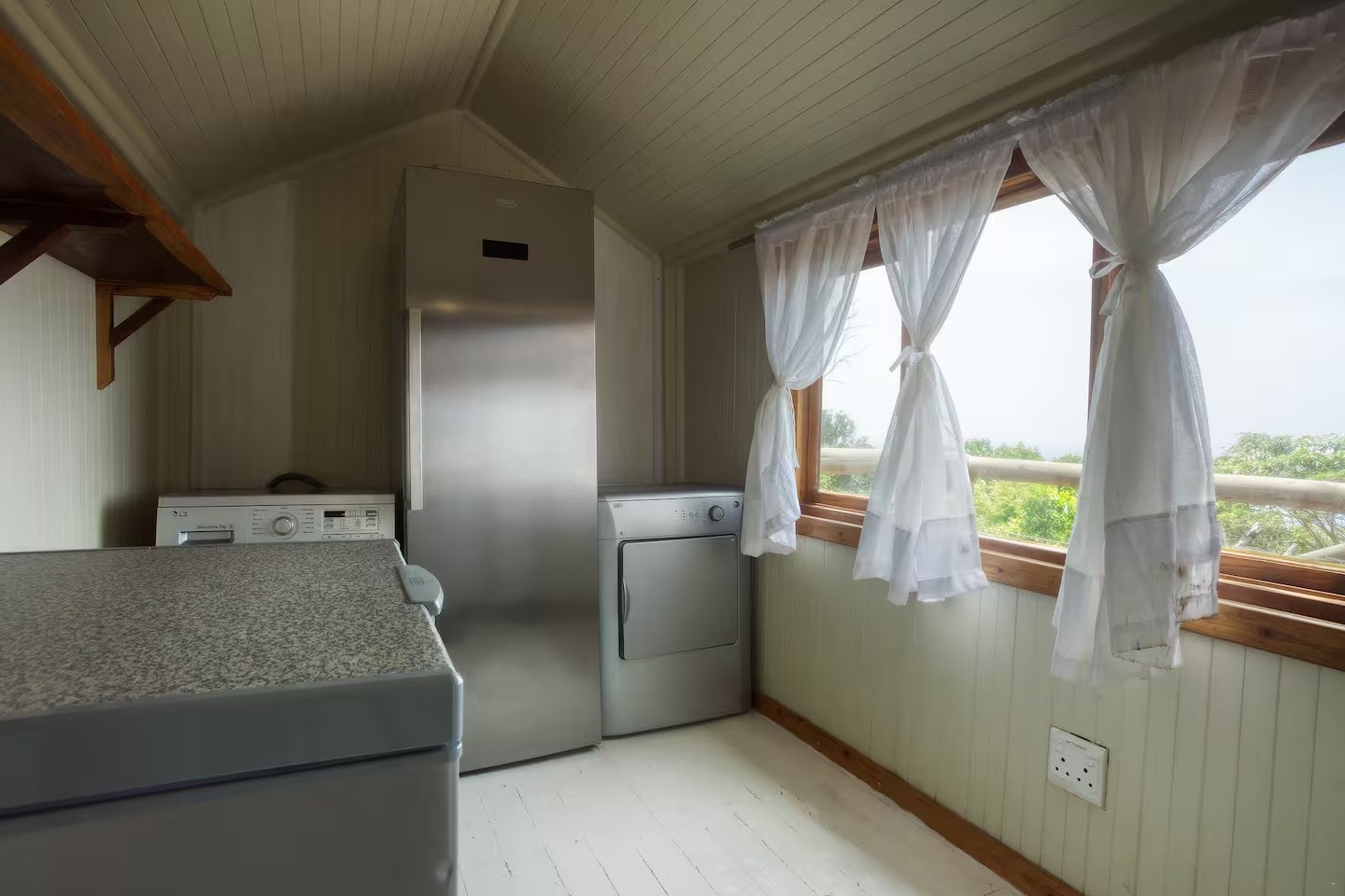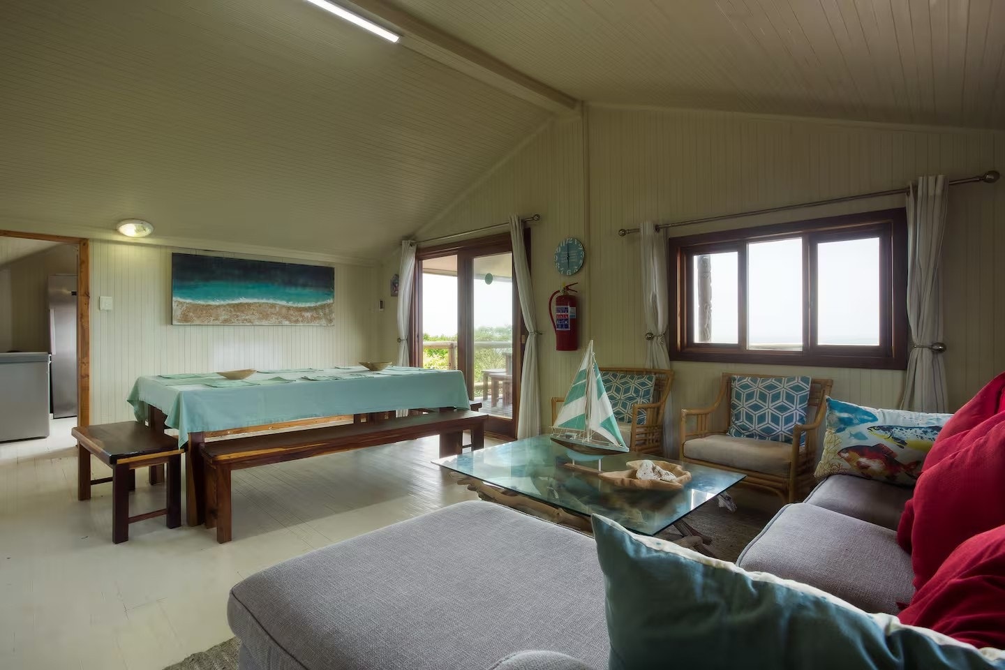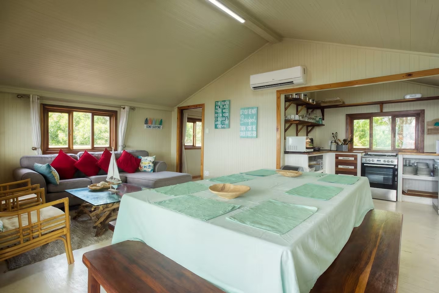 Die aparte sitkamer- en kombuiseenheid is volledig toegerus vir selfsorg, insluitend 'n mikrogolfoond, elektriese oond, vierplaat-gasstoof, skottelgoedwasser en alle nodige breekware, eetgerei, potte en panne. Die sitkamer het gemaklike sitplek, en die leefarea het lugverkoeling. Die houtdek buite die sitkamer is ingerig met sonbeddens met matrasse en 'n gasbraai. Gaste word daaraan herinner dat die gasbraai streng vir gasgebruik is; Enige misbruik, soos die gebruik van houtskool of hout, sal 'n vervangingsfooi tot gevolg hê.