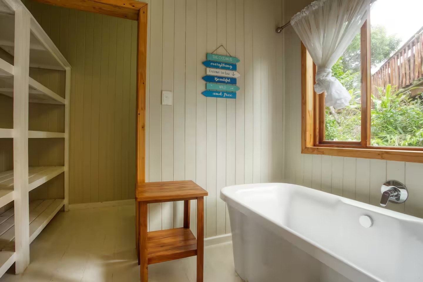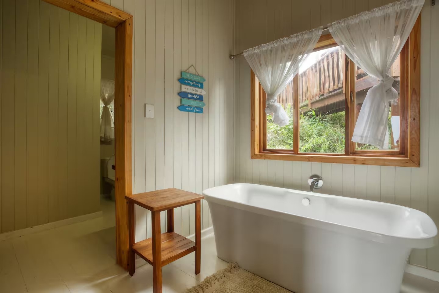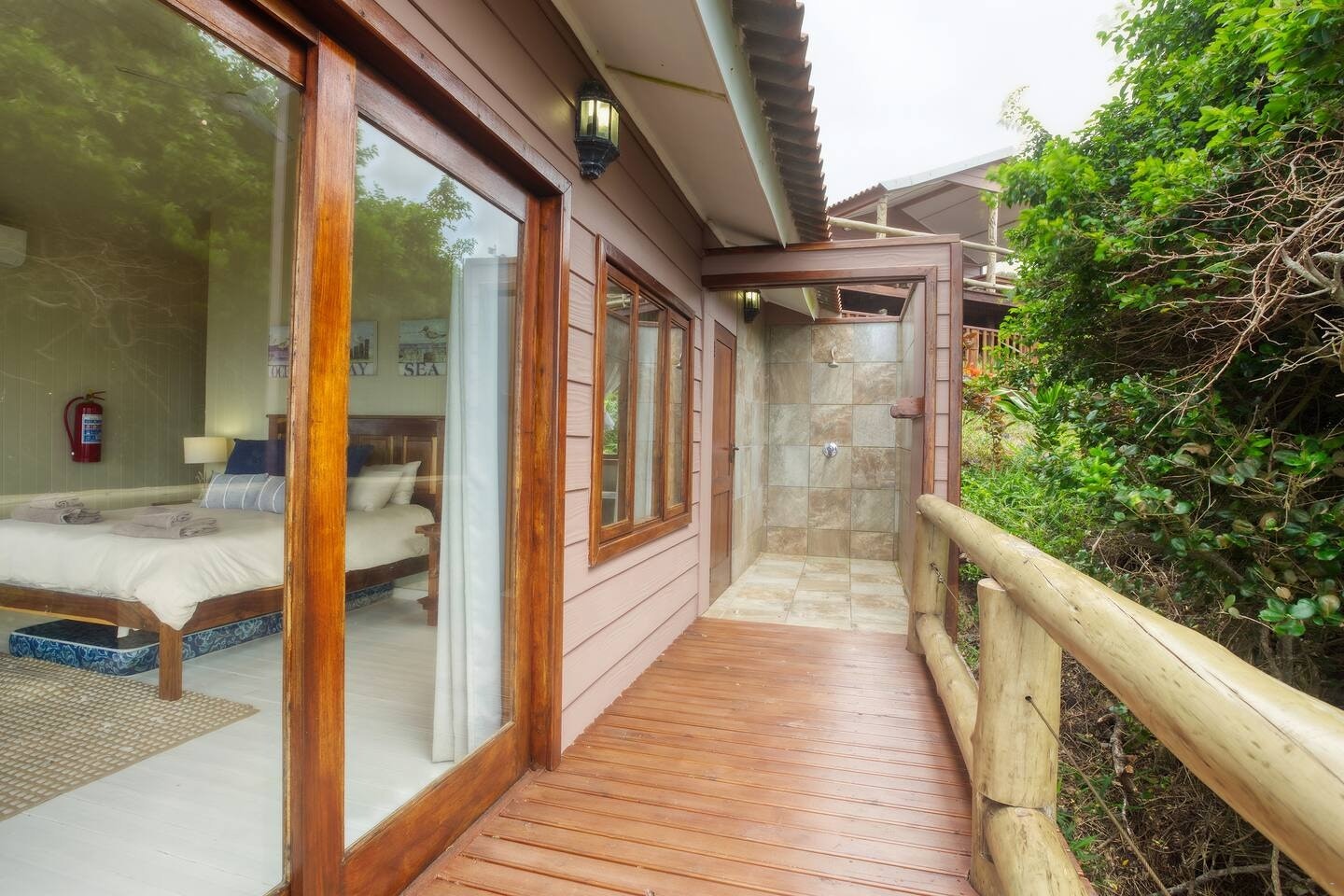 Die aparte sitkamer- en kombuiseenheid is volledig toegerus vir selfsorg, insluitend 'n mikrogolfoond, elektriese oond, vierplaat-gasstoof, skottelgoedwasser en alle nodige breekware, eetgerei, potte en panne. Die sitkamer het gemaklike sitplek, en die leefarea het lugverkoeling. Die houtdek buite die sitkamer is ingerig met sonbeddens met matrasse en 'n gasbraai. Gaste word daaraan herinner dat die gasbraai streng vir gasgebruik is; Enige misbruik, soos die gebruik van houtskool of hout, sal 'n vervangingsfooi tot gevolg hê.