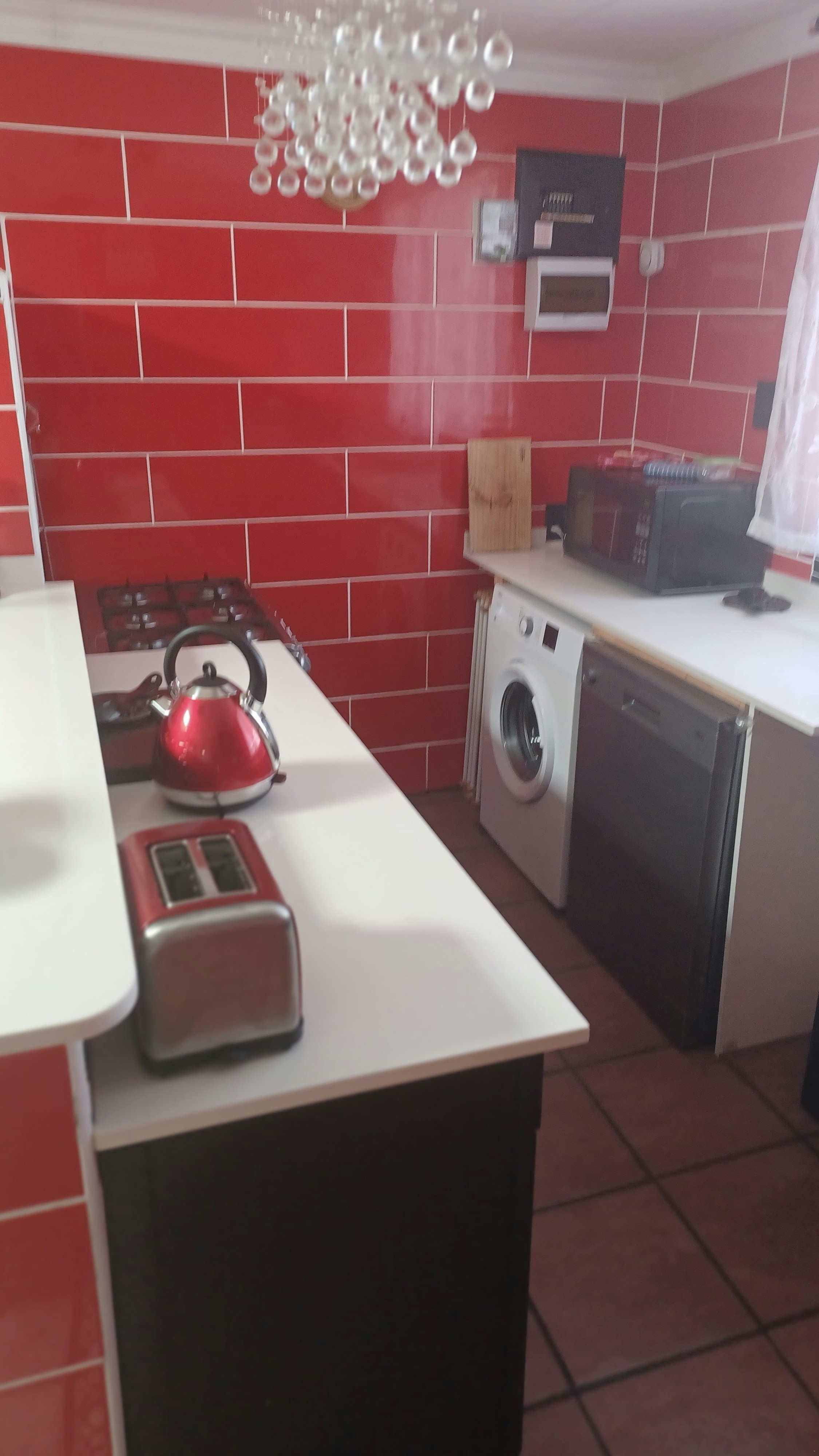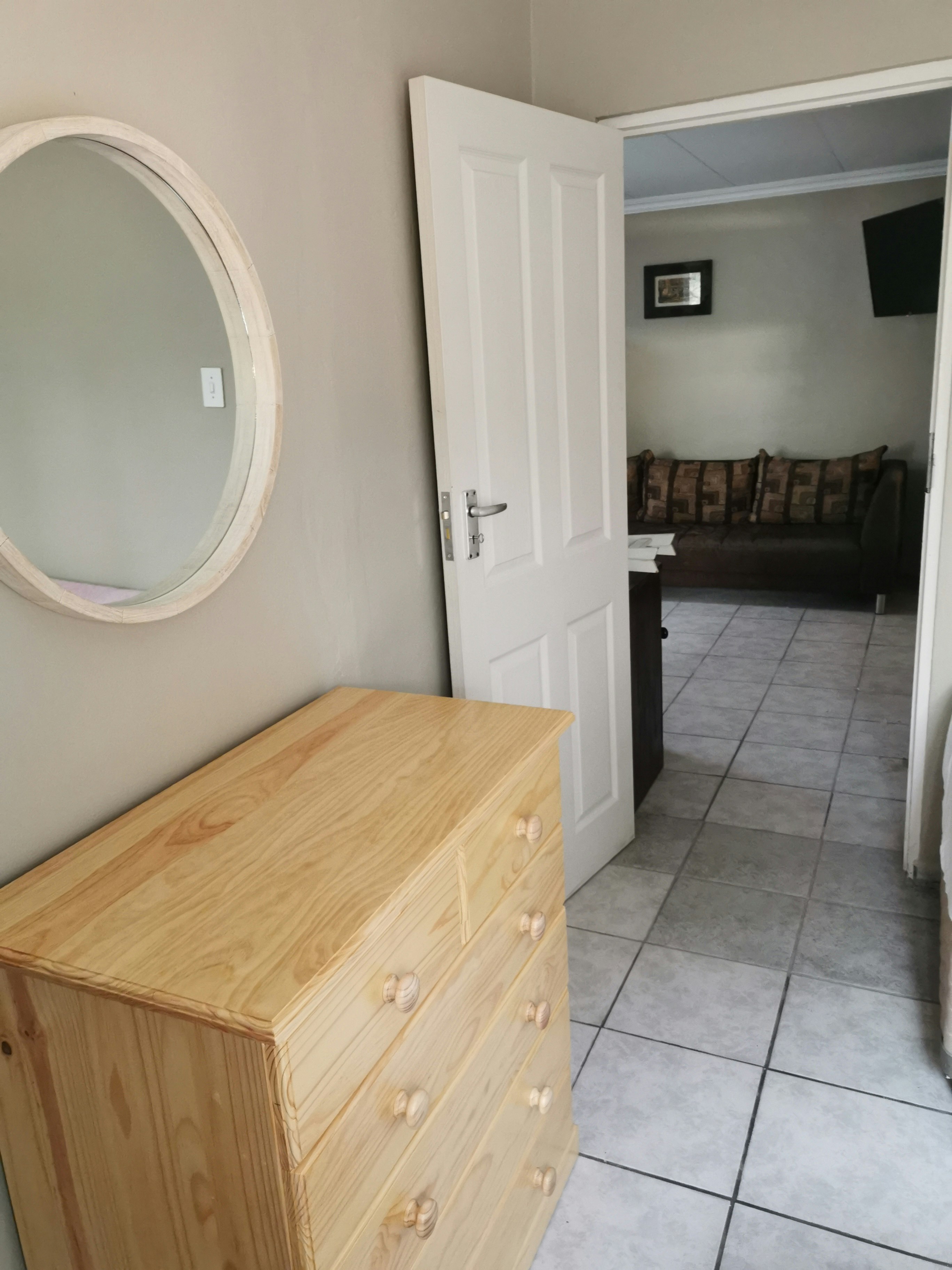The open-plan living area features a kitchen fully equipped with a gas stove, oven, microwave, fridge-freezer, toaster, kettle, cutlery, and crockery, as well as a breakfast bar with stools. A washing machine and a dishwasher are also available in the kitchen. Leading from the kitchen is a lounge with comfortable couches and a flat-screen TV with DStv channels. Access to free Wi-Fi is provided.