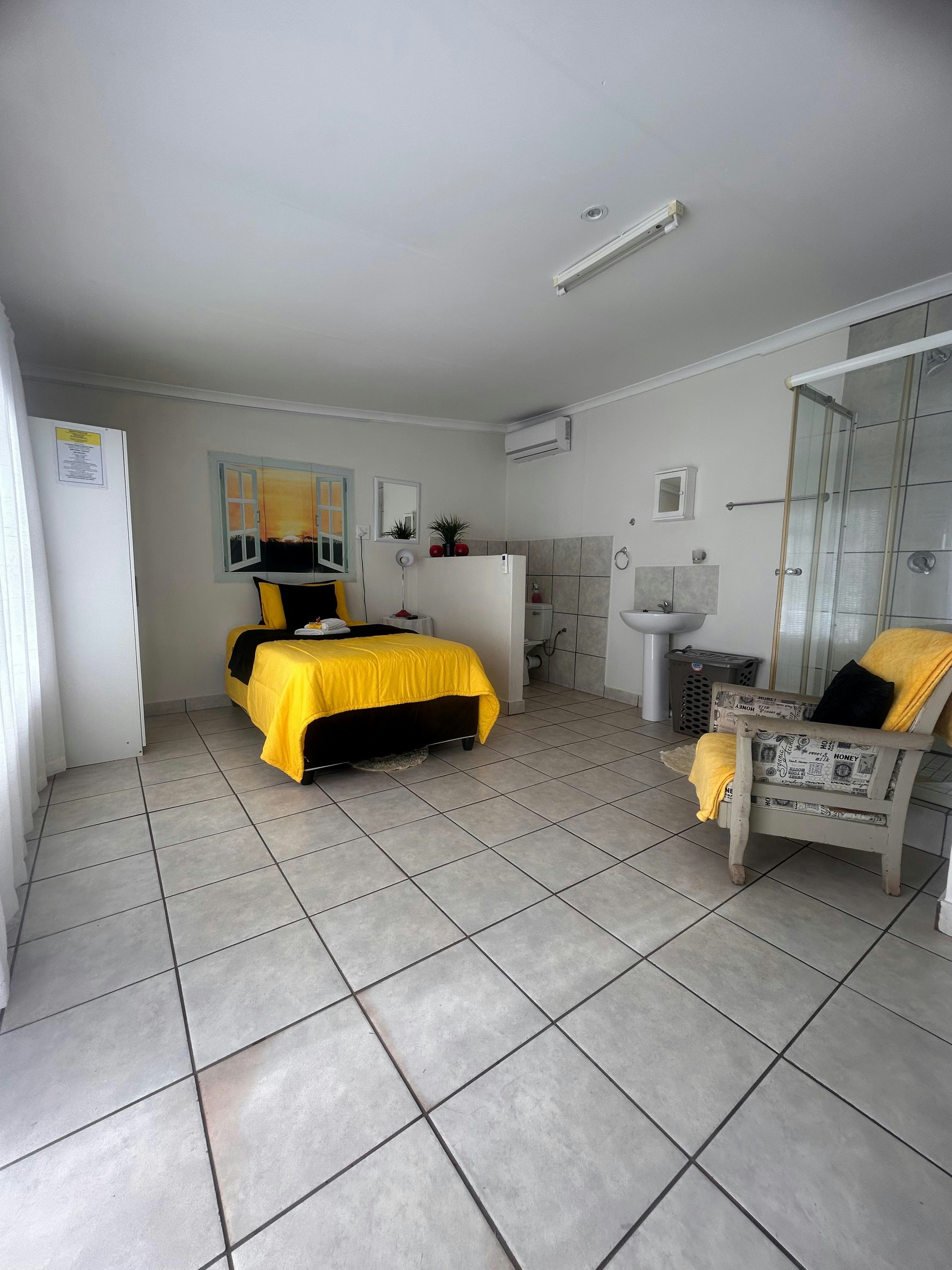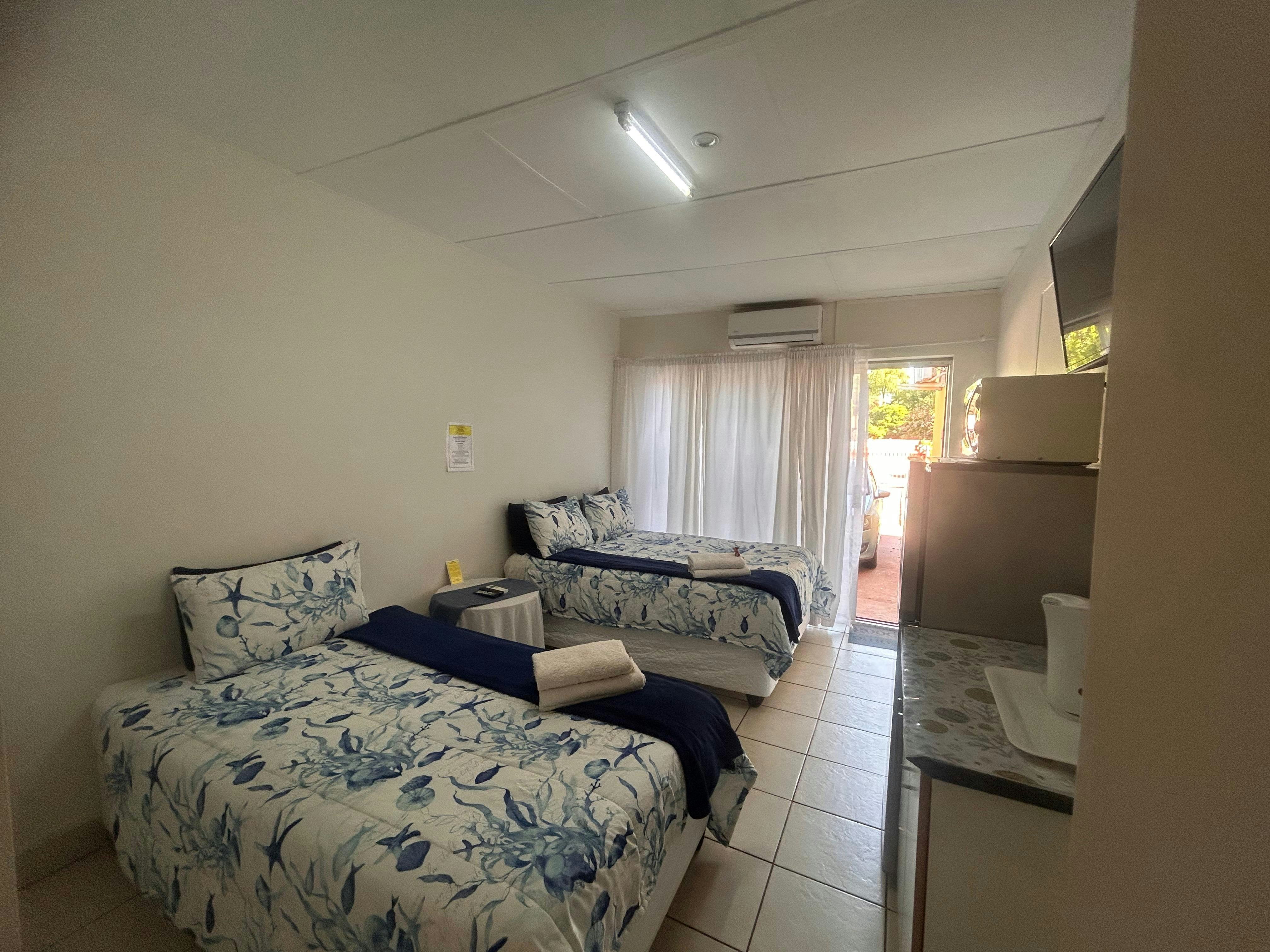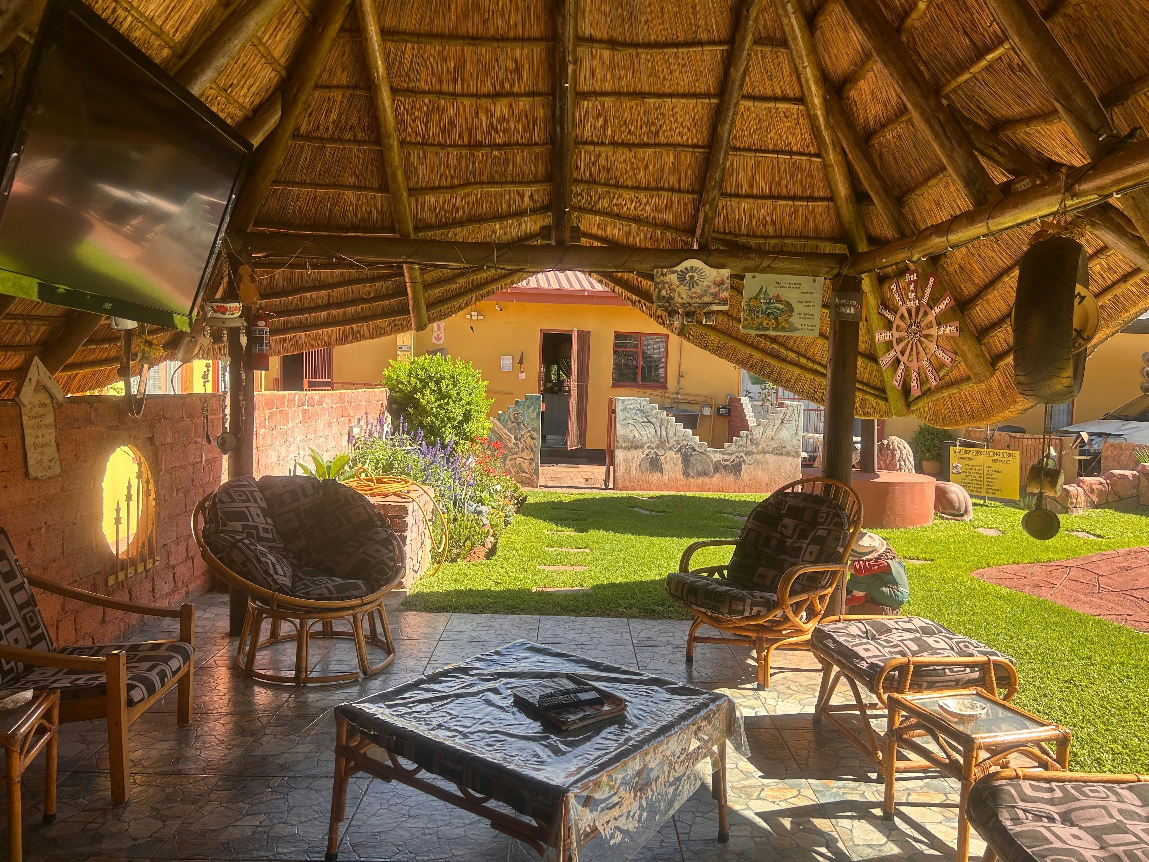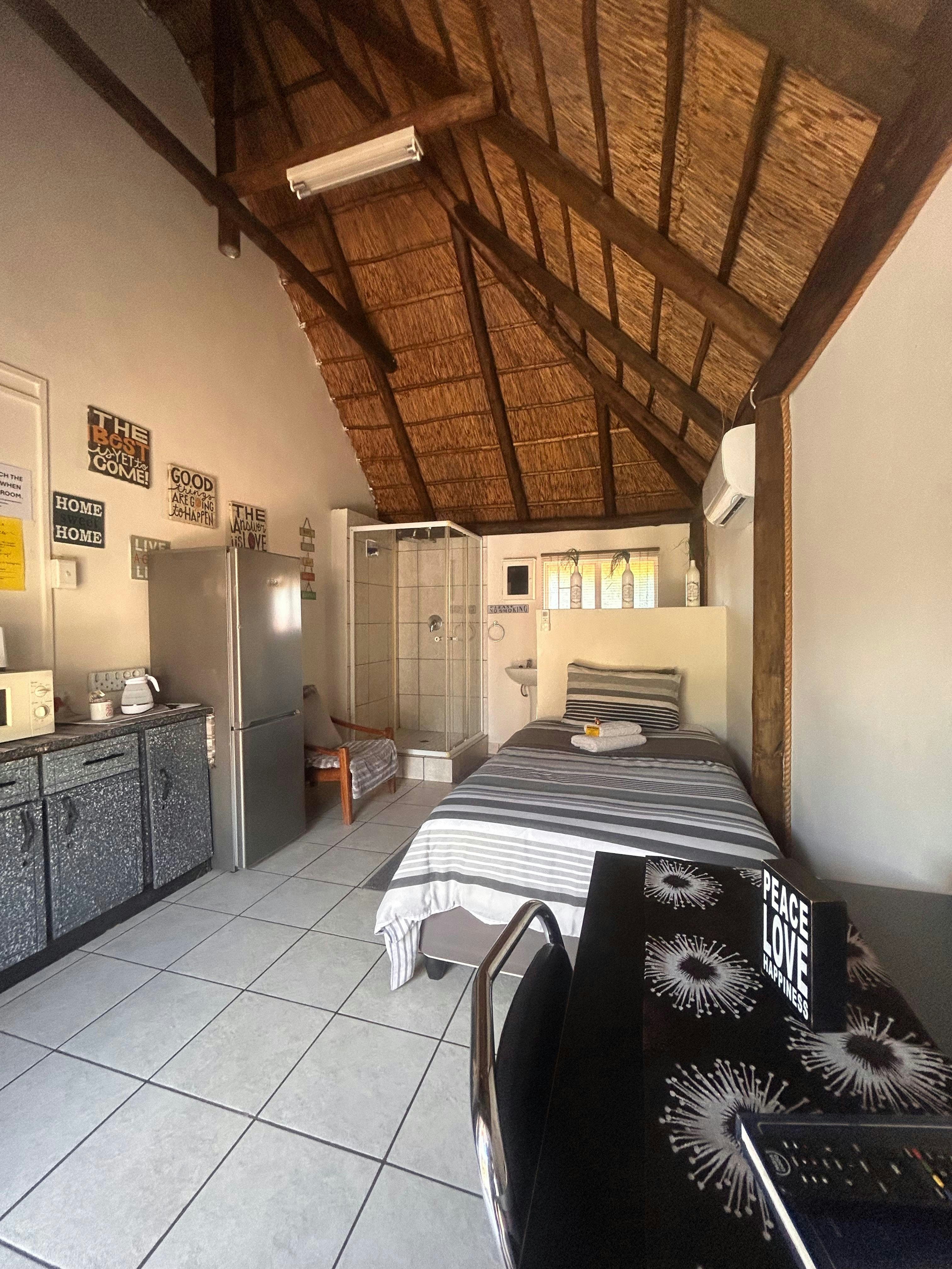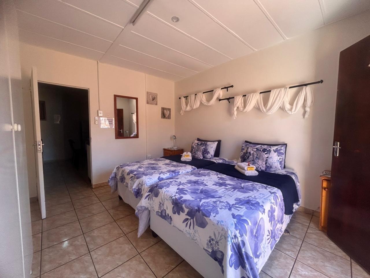 We were very warmly received and taken to the neat room. Very nice garden and facilities. The room we were allocated had only two inconveniences: The stairs to the door are a bit high for older guests with mobility challenges. The room is a bit small for a double bed, not enough space. She showed us a nice spacious room with two single beds. However, we kept the double bed room. We drove a motorcycle and the parking lot's loose gravel stones are not very motorcycle friendly. Something to look at. Furthermore, we had a great stay in Kathu!