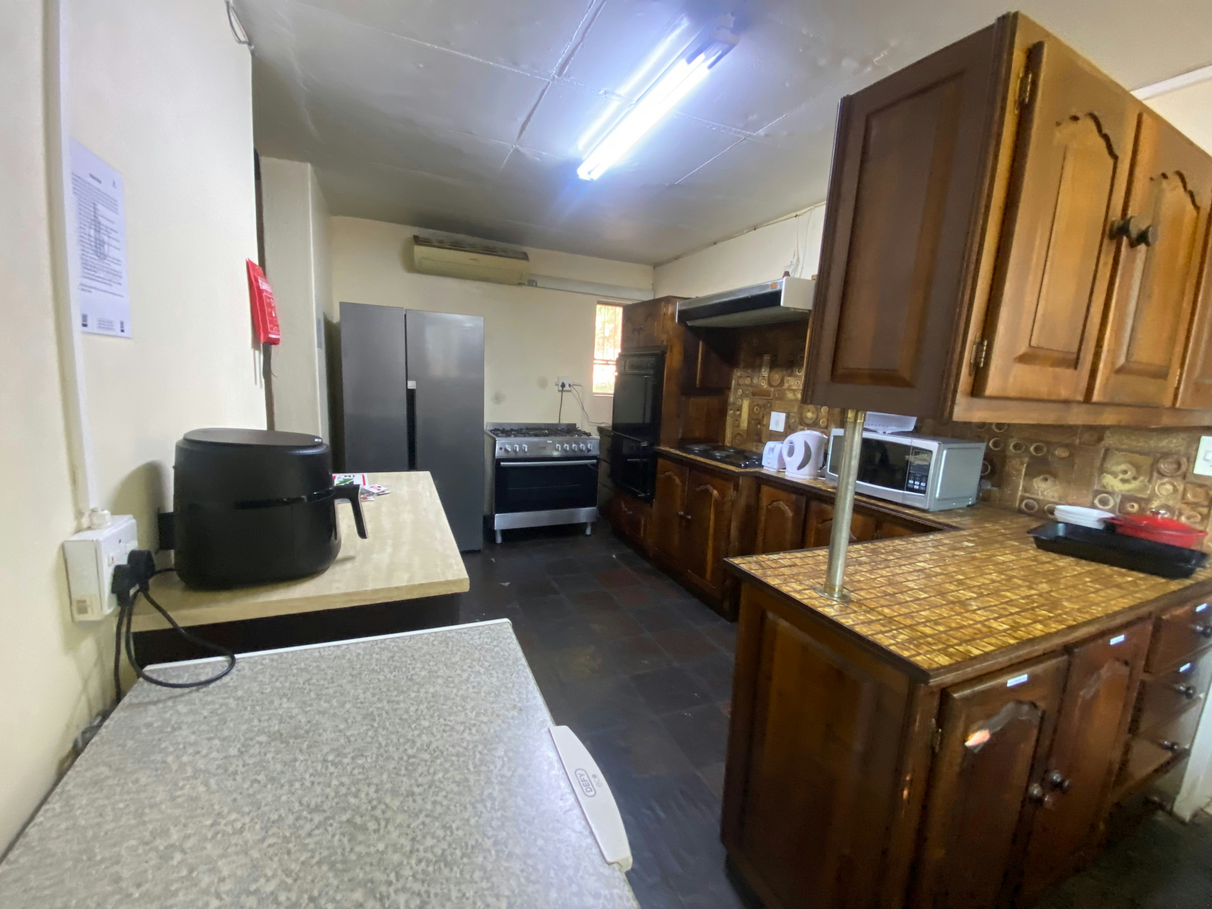 The living area features a fully equipped communal kitchen, including a stove, oven, microwave, double-door fridge-freezer, cutlery, and crockery. The shared lounge is furnished with comfortable seating and a TV, along with complimentary Wi-Fi facilities.