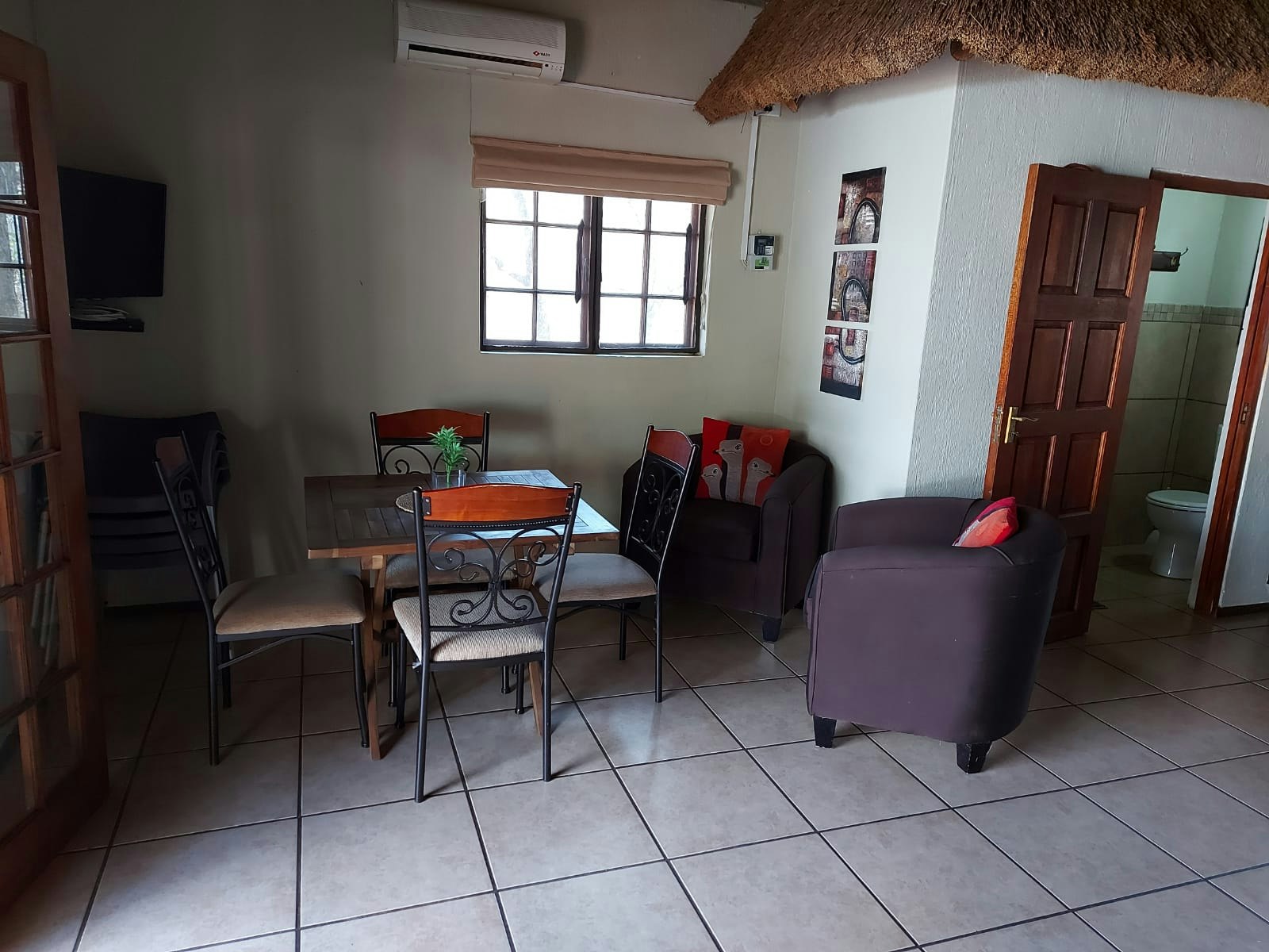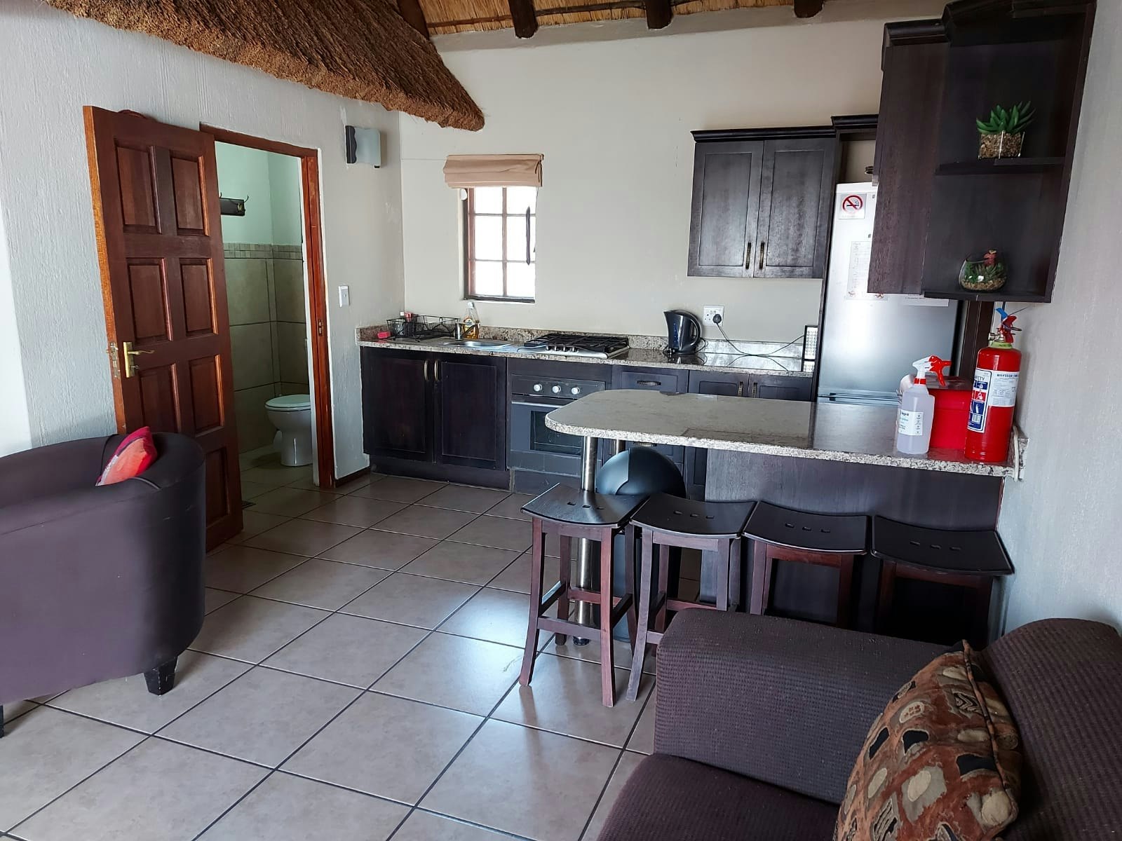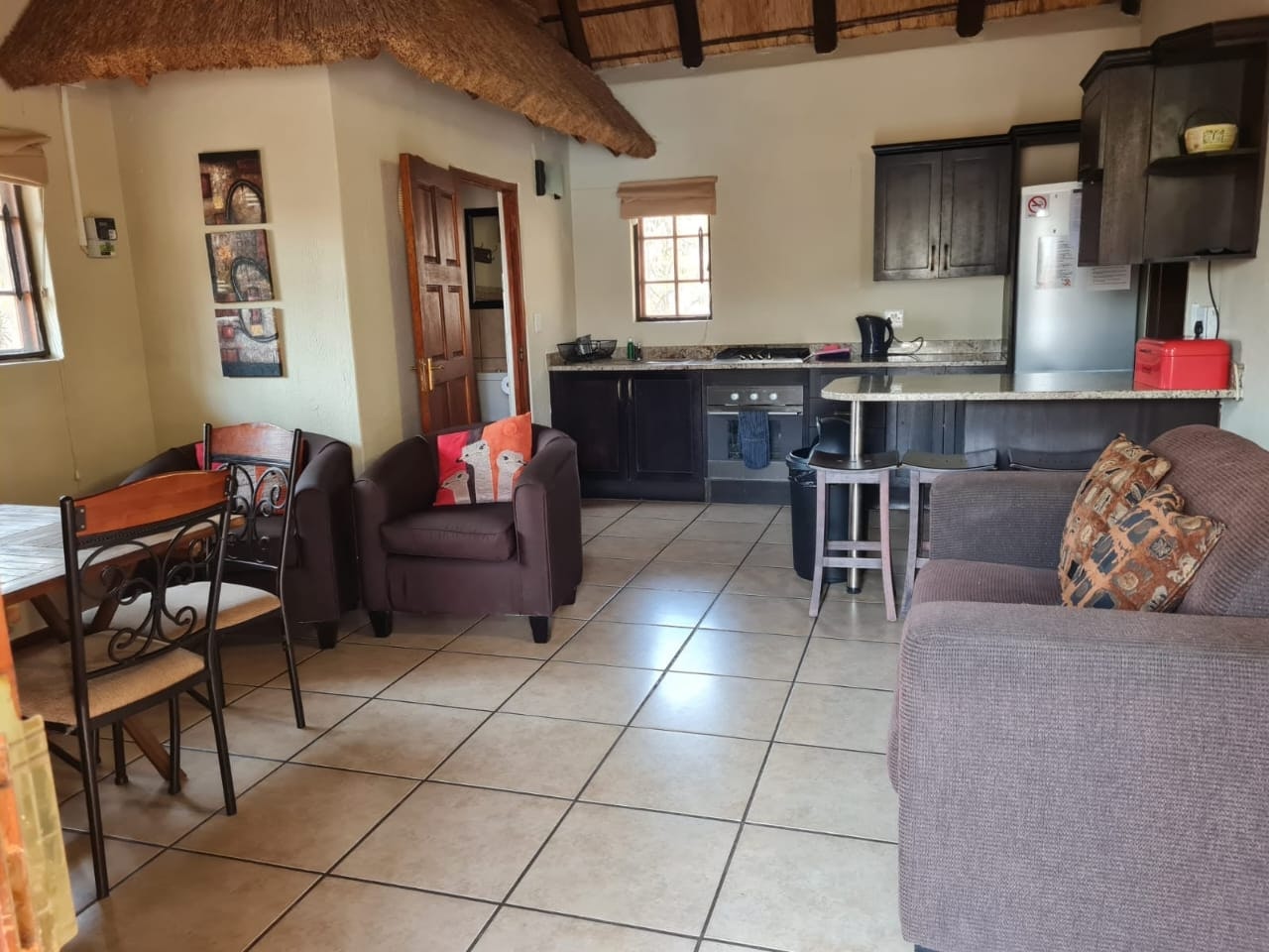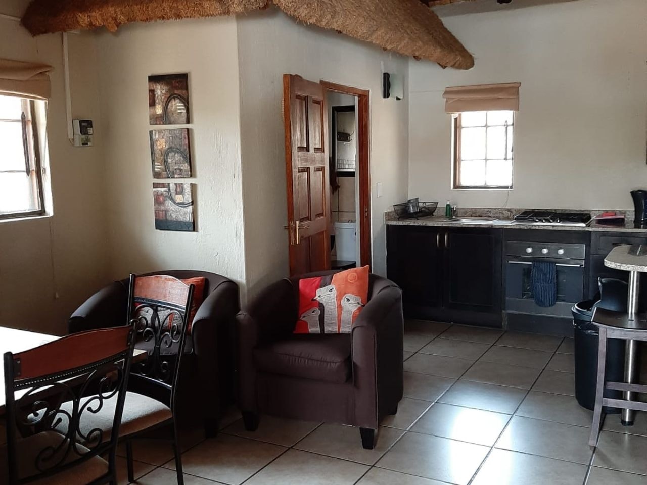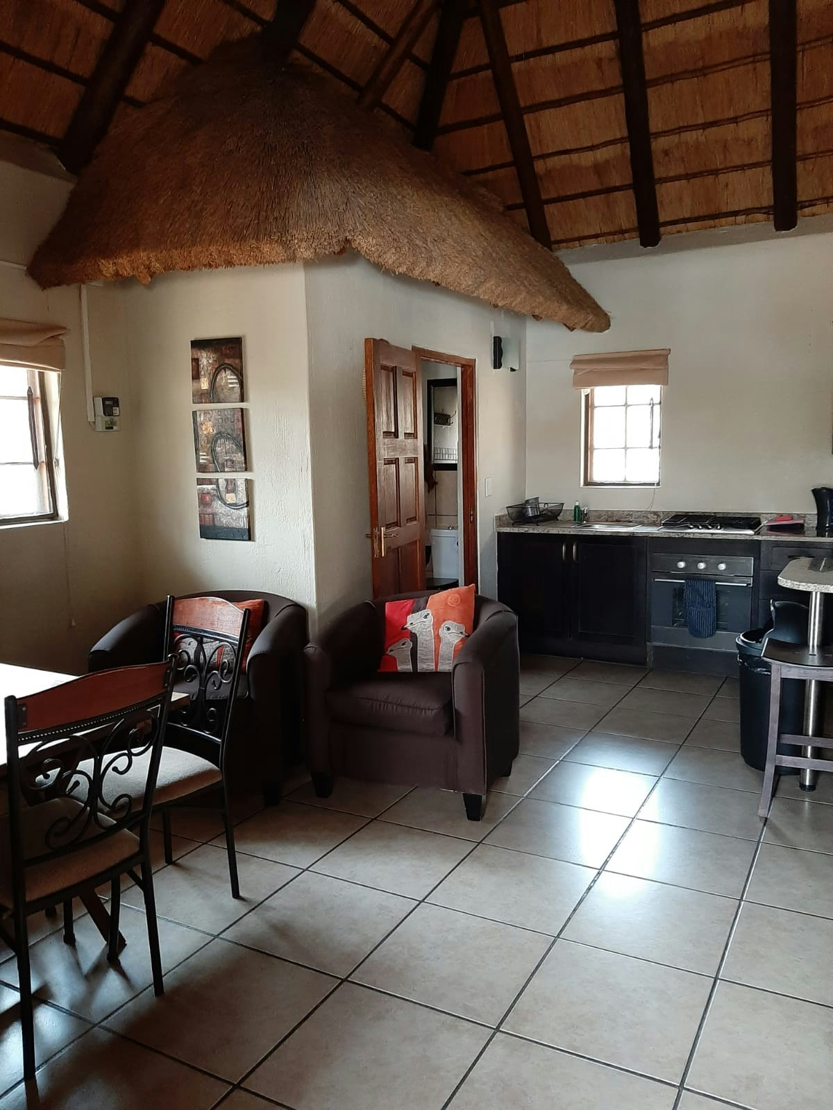 Both units have open-plan kitchens equipped with a fridge-freezer, gas hob, oven, microwave, cutlery and crockery, as well as tea- and coffee-making facilities. There’s a dining table with chairs where guests can enjoy their meals together and the living area has a lounge suite with a flat-screen TV. Guests can cool down in the shared splash pool or enjoy a braai in the boma. Secure parking is available on the premises.