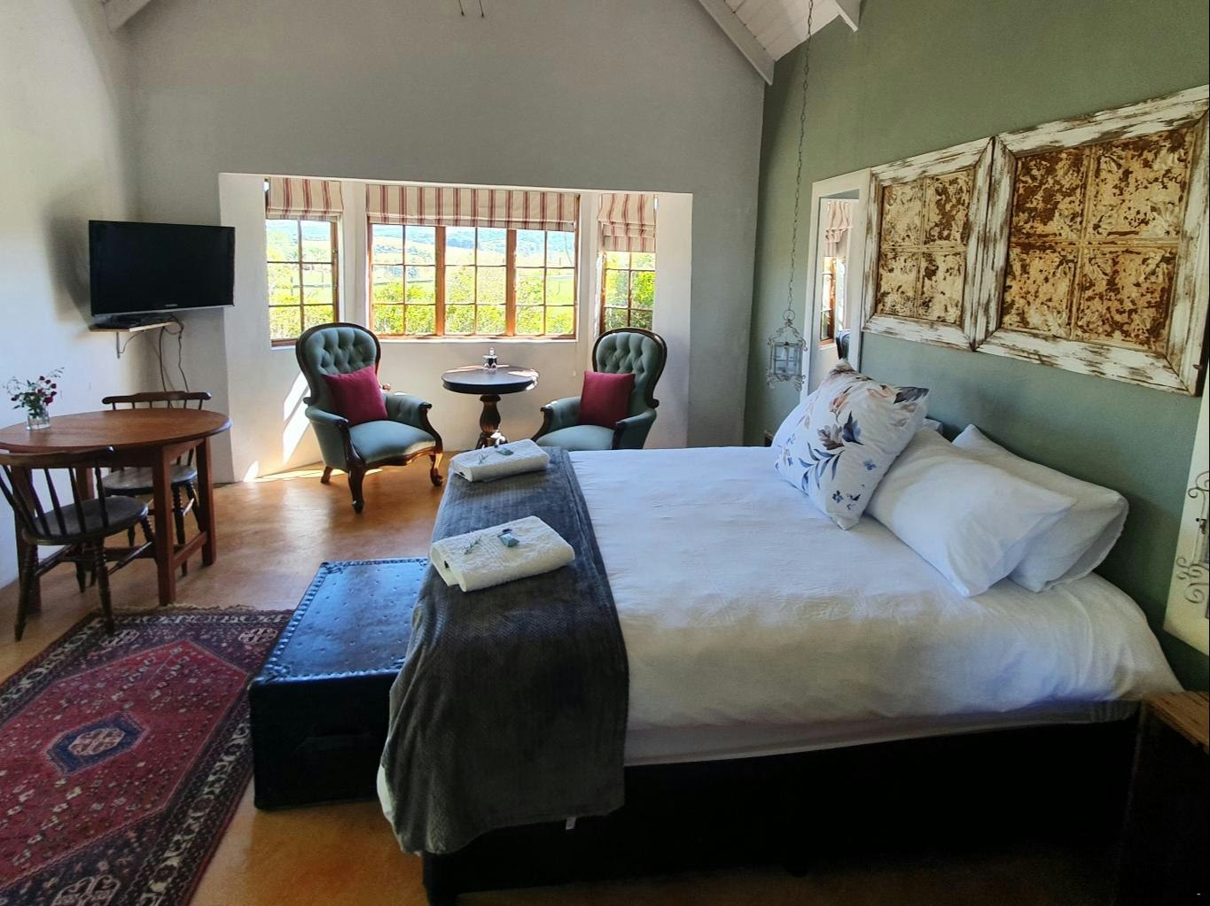 The farm offers guests a choice of 6 beautifully appointed self-catering cottages, each with its own private garden entrance. The cottages feature open-plan living spaces with a kitchen or kitchenette, creating a comfortable and inviting atmosphere. The bedrooms are furnished with either queen-size, king-size, or double beds, while the bathrooms are fitted with either a bath or a shower. Crisp linen and towels are provided for guest comfort.