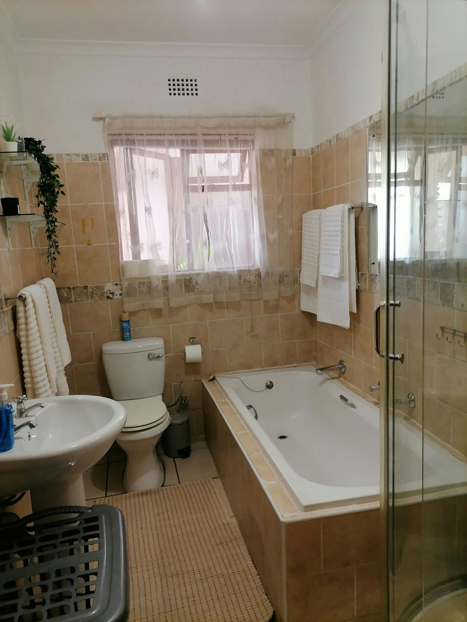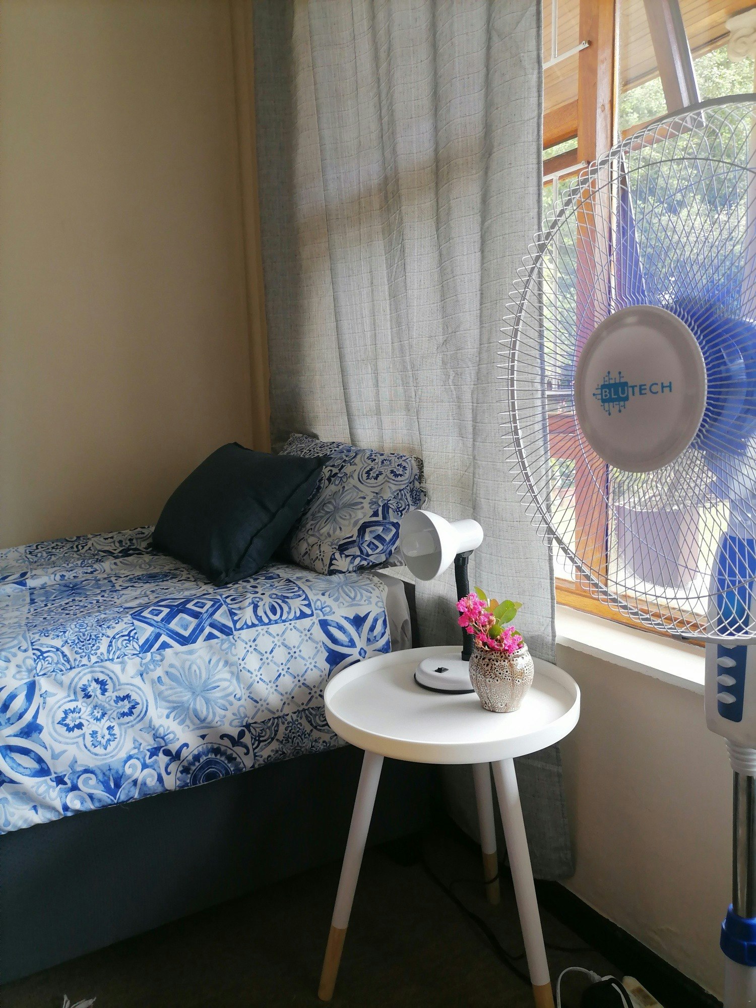 Kleiner kamer met 2 enkelbeddens, ingeboude kaste met waaier. Deel gemeenskaplike kombuis, braaikamer en sitkamer met TV met Netflix en DSTV stroomdienste. Vinnige wifi. n Volledige badkamer word gedeel met maksimum 2 ander persone.