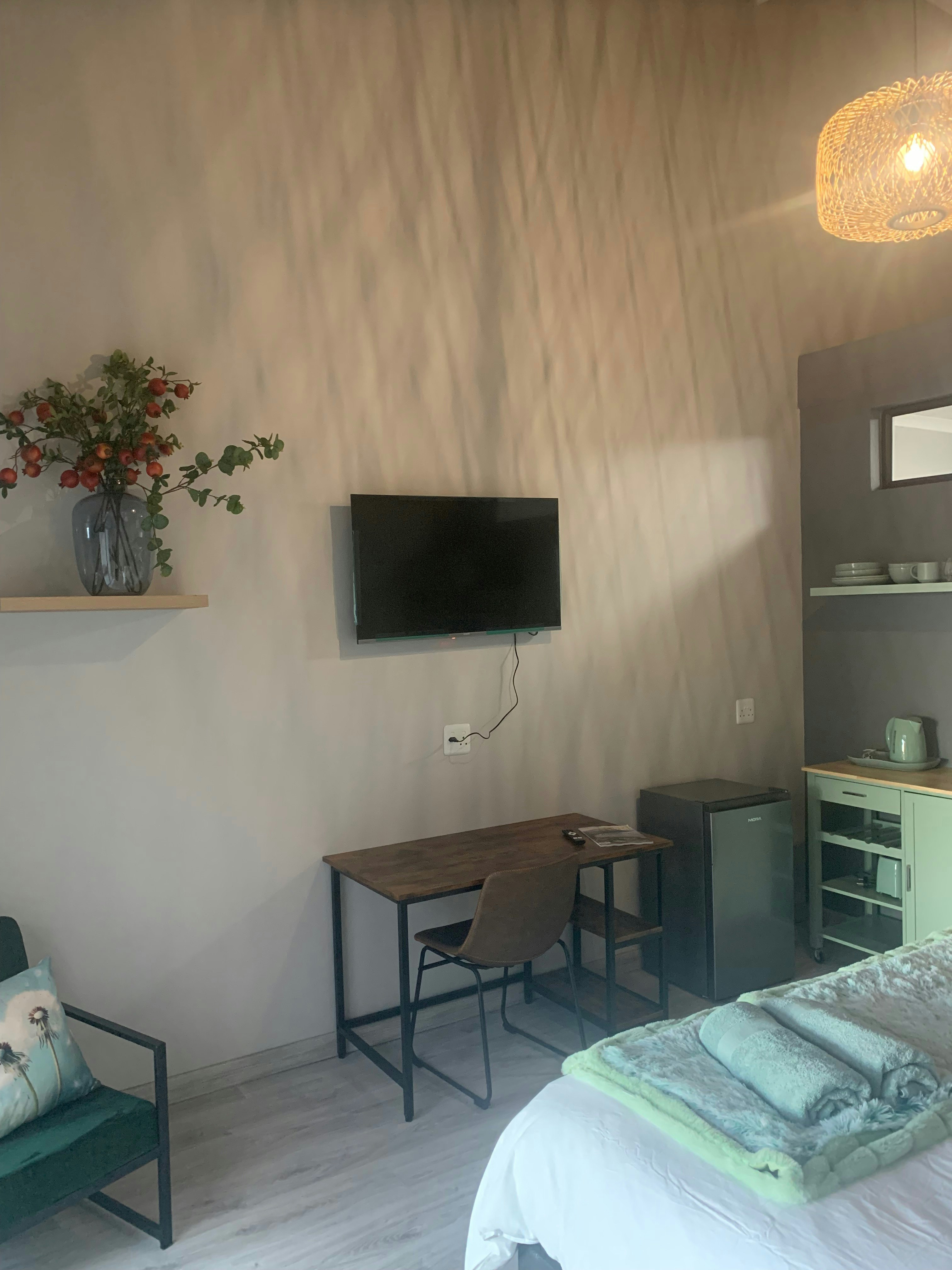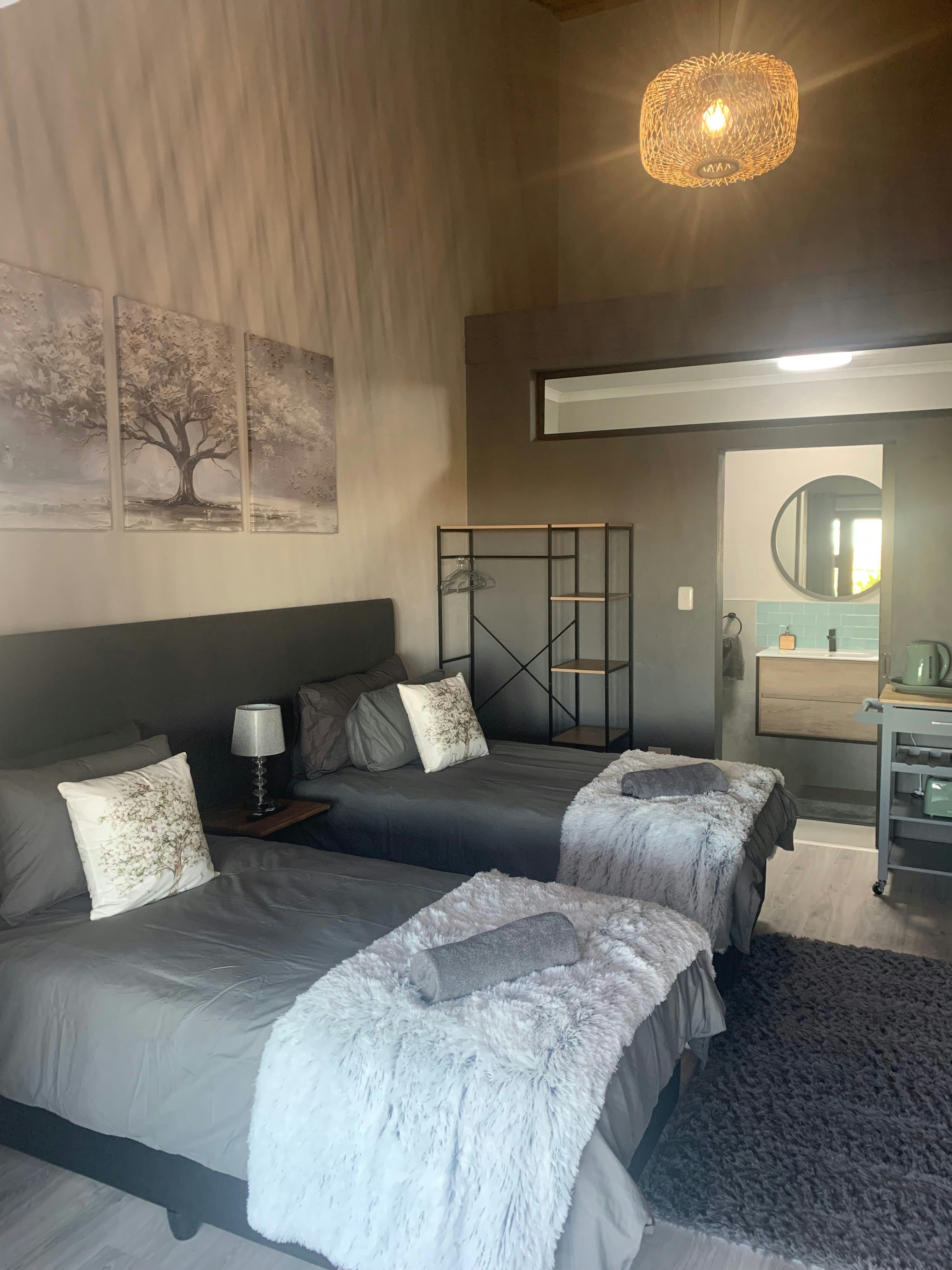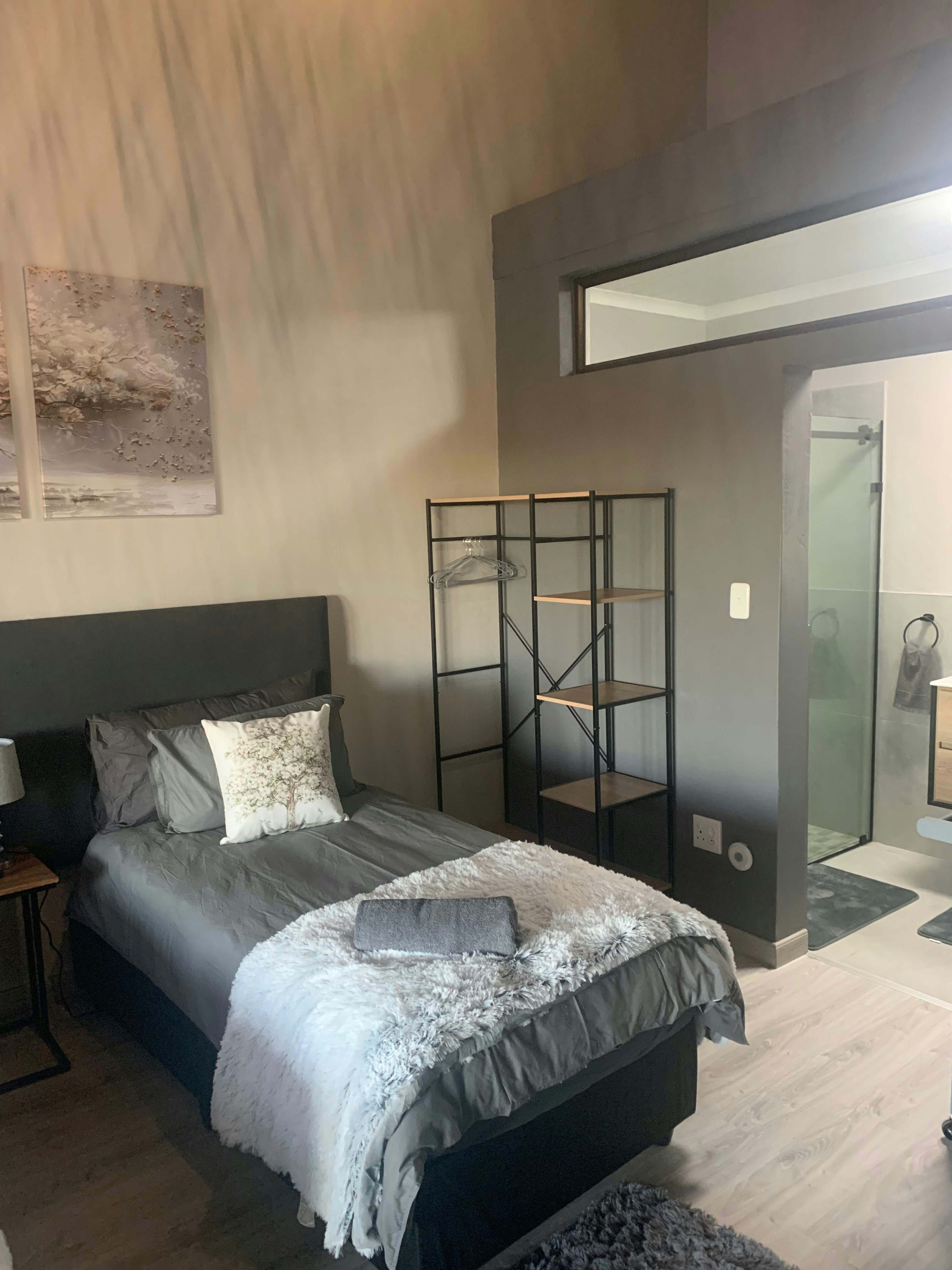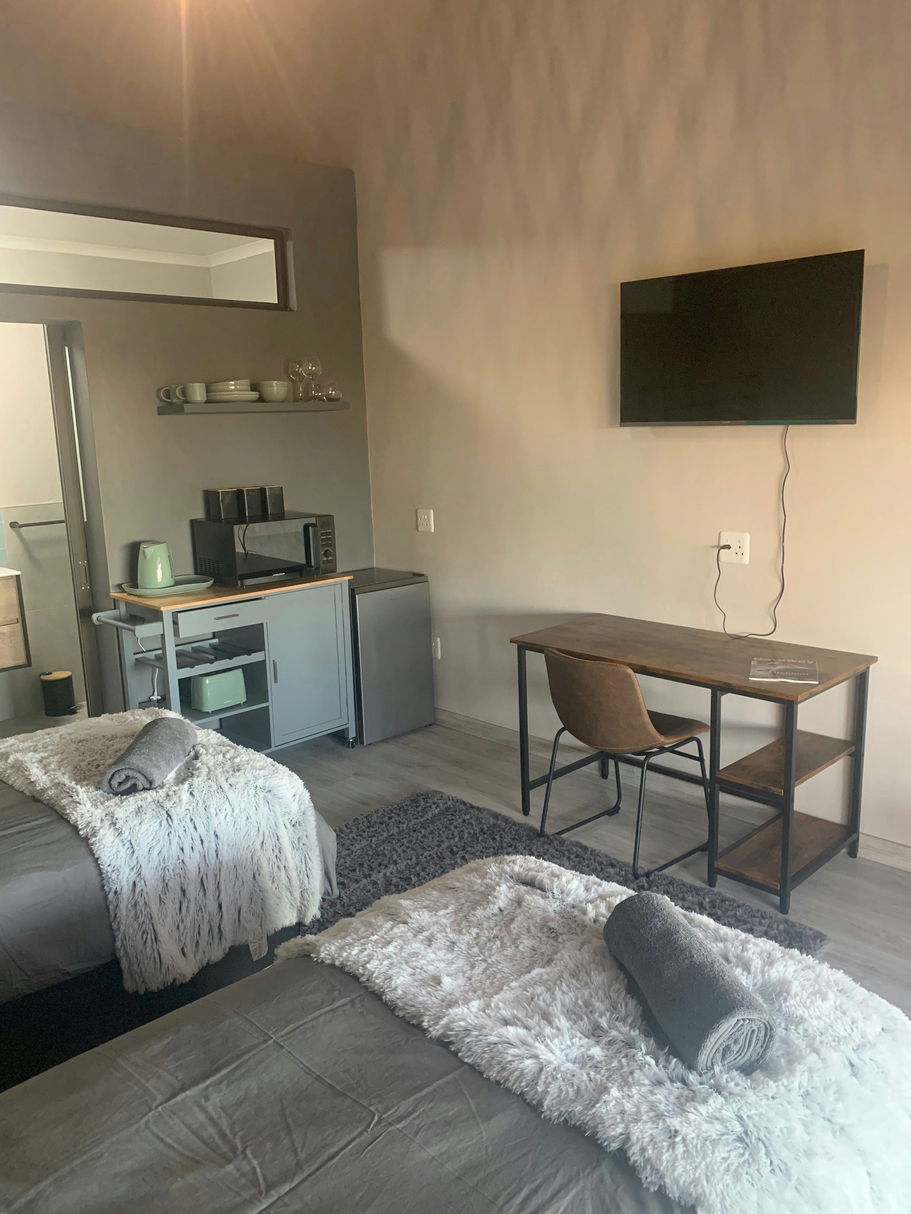This unit can accommodate up to 2 guests and is furnished with 2 single beds and has an en-suite bathroom that is fitted with a shower, washbasin and toilet. Linen and bath towels are provided. The room also features a work desk and a TV with DStv and streaming services. The kitchenette is equipped with a bar fridge, microwave, toaster, necessary cutlery and crockery and tea- and coffee-making facilities. Access to Wi-Fi is available. Guests can enjoy an undercover patio with seating, a shared swimming pool, 2 braai areas and a lush garden. Secure parking is available on the premises.