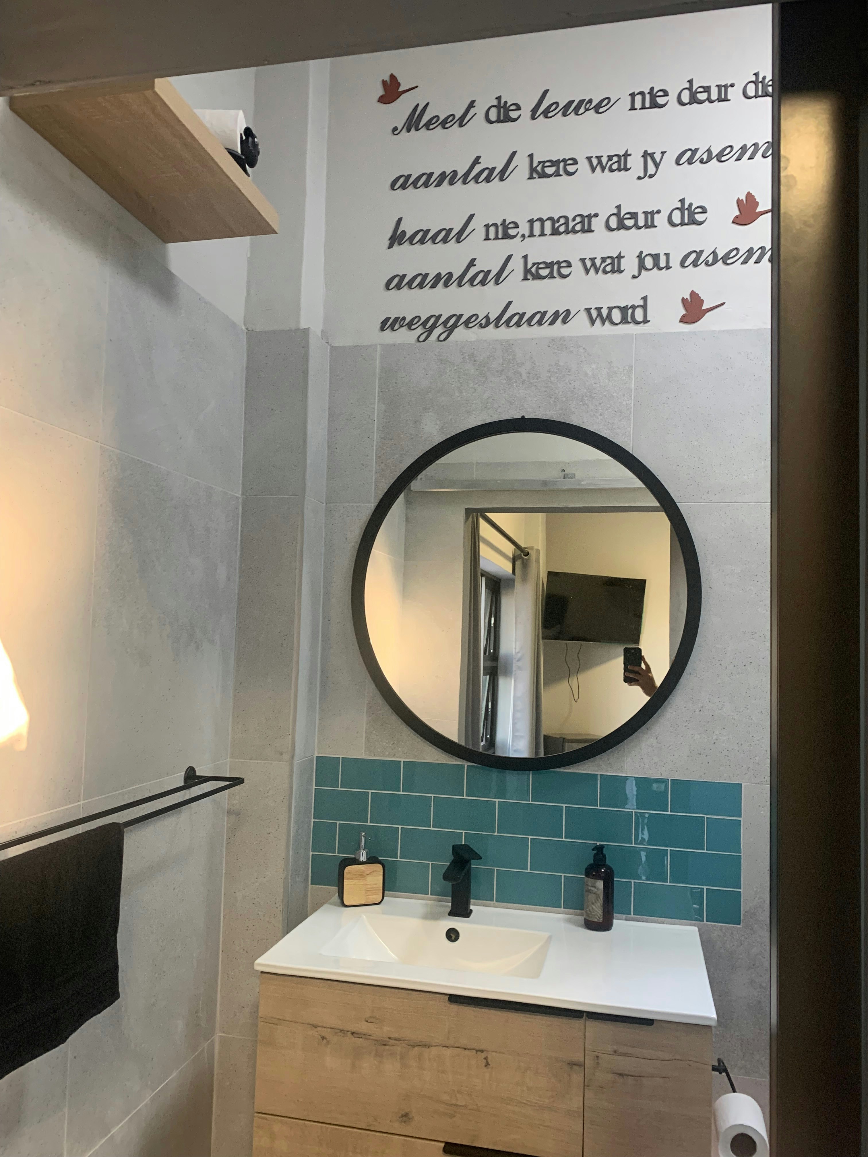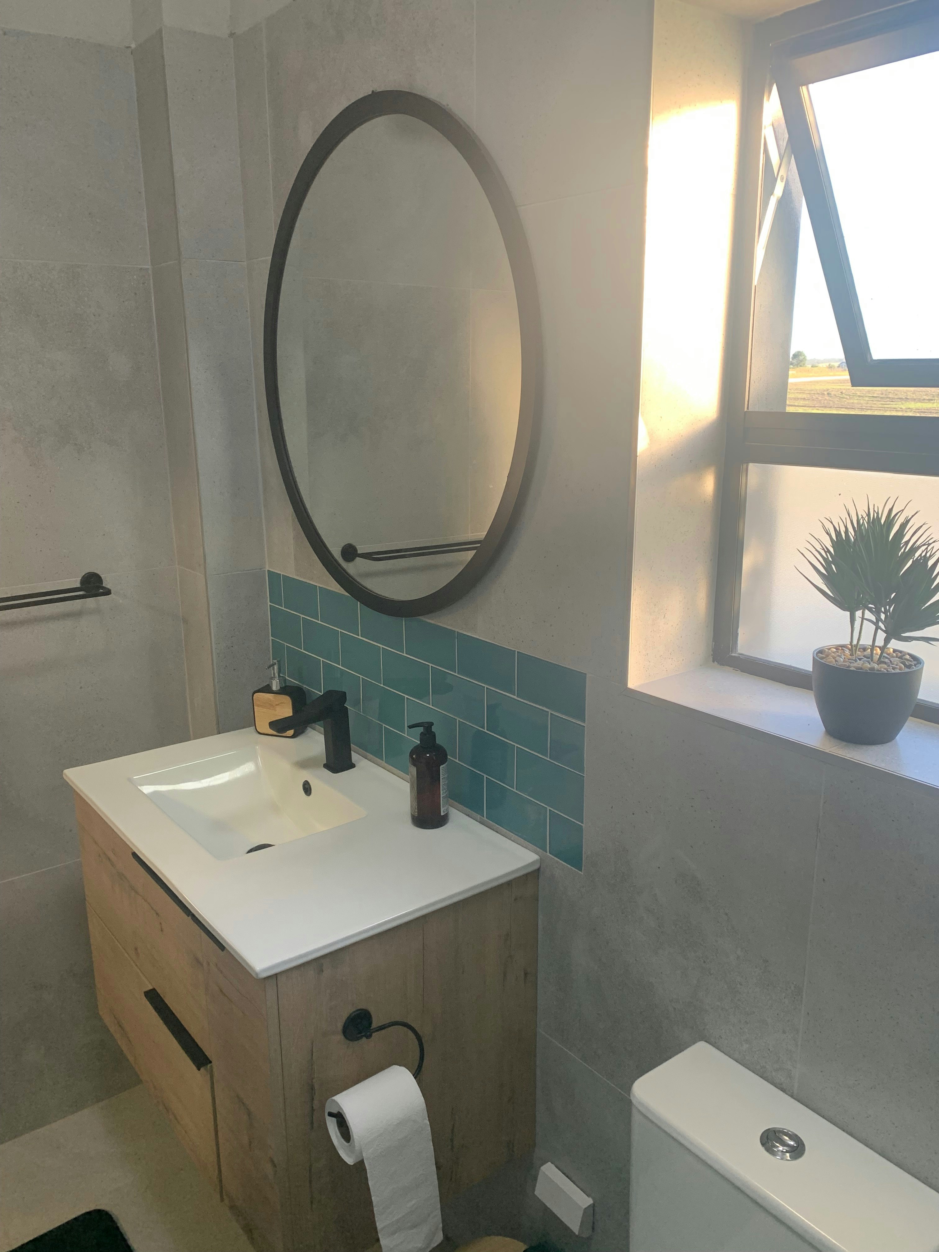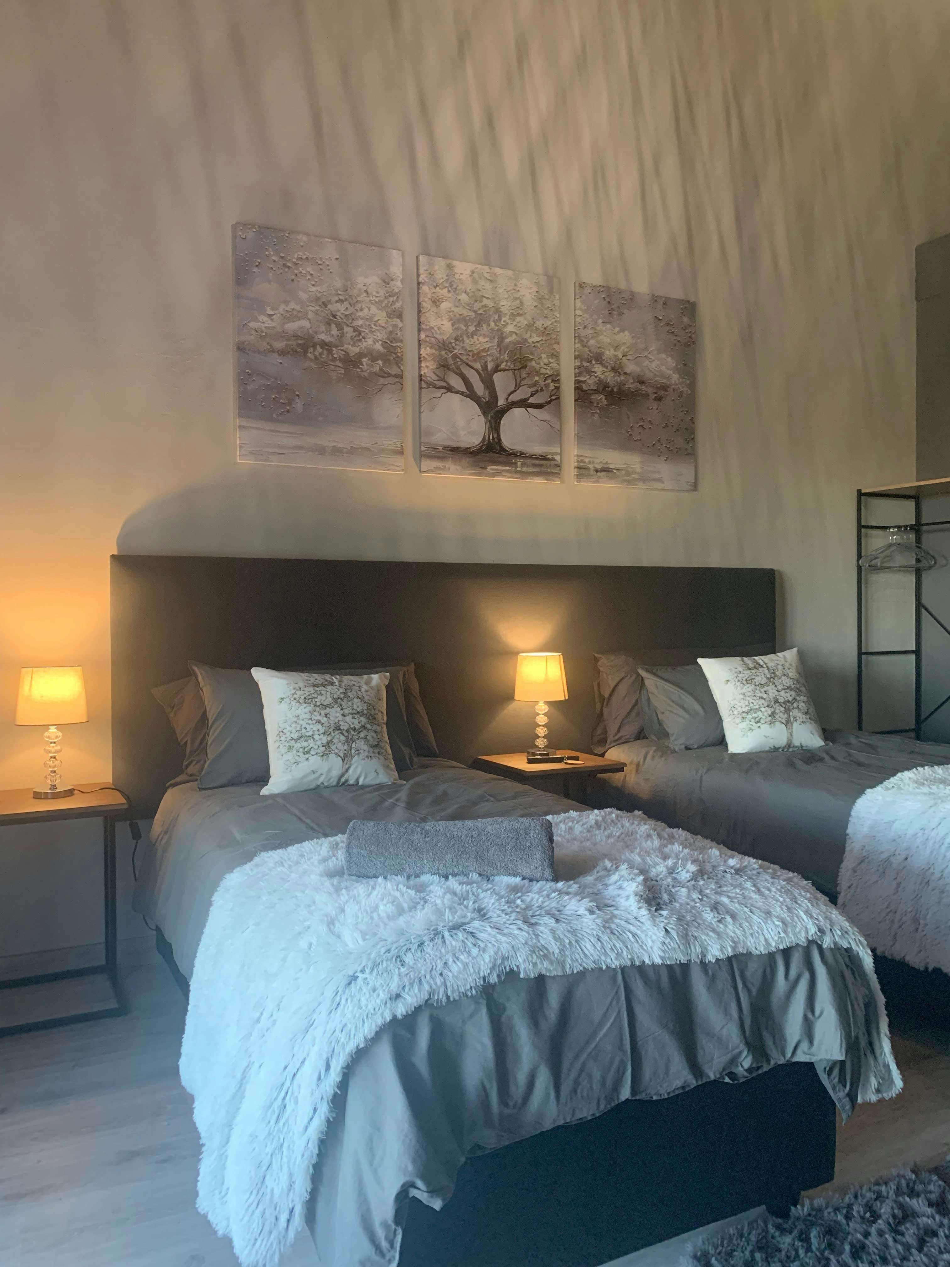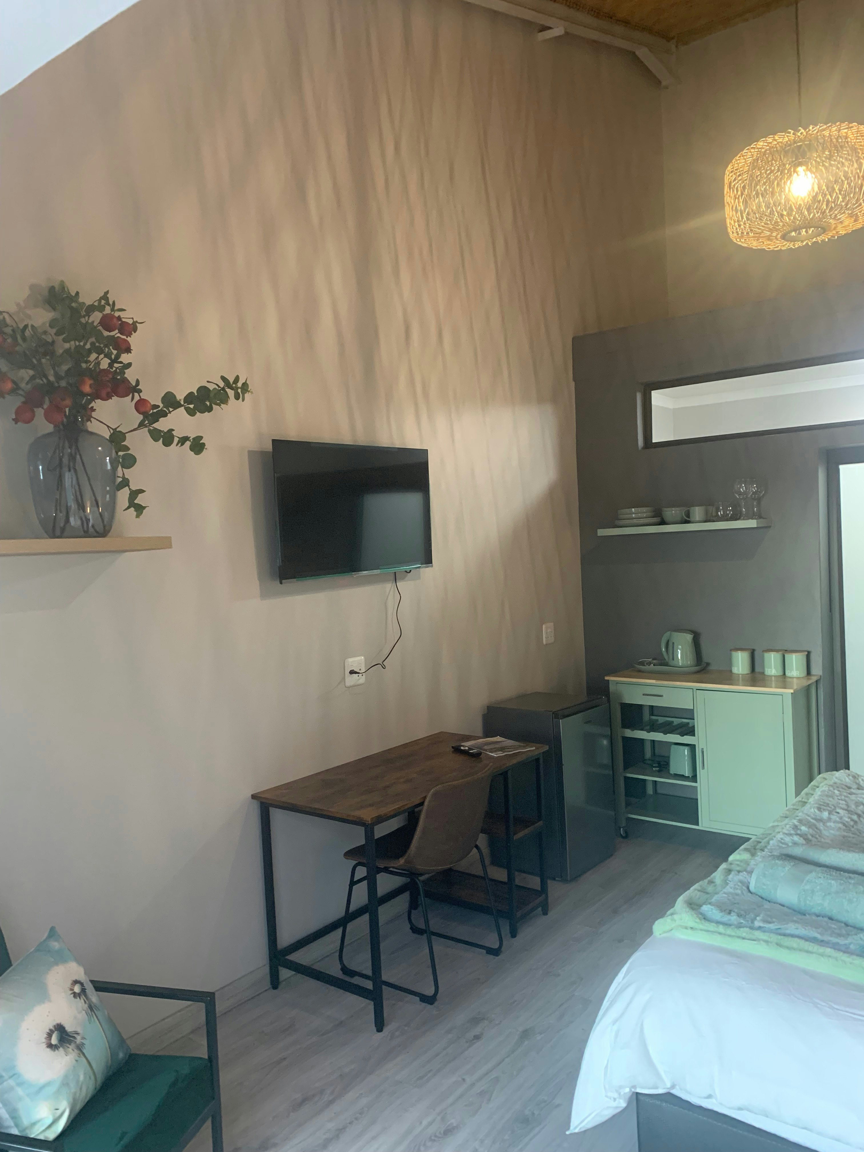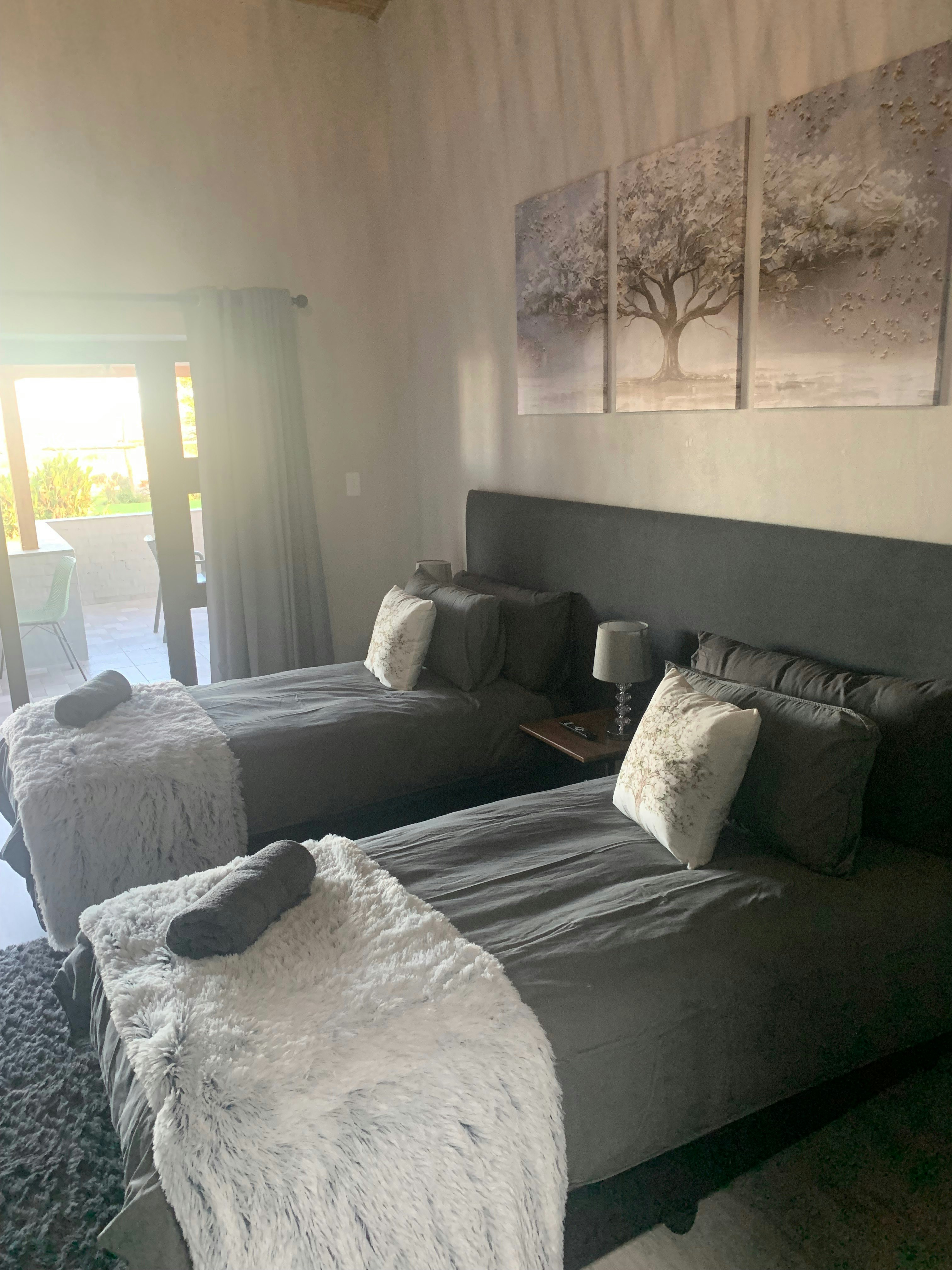 This unit can accommodate up to 2 guests and is furnished with 2 single beds and has an en-suite bathroom that is fitted with a shower, washbasin and toilet. Linen and bath towels are provided. The room also features a work desk and a TV with DStv and streaming services. The kitchenette is equipped with a bar fridge, microwave, toaster, necessary cutlery and crockery and tea- and coffee-making facilities. Access to Wi-Fi is available. Guests can enjoy an undercover patio with seating, a shared swimming pool, 2 braai areas and a lush garden. Secure parking is available on the premises.