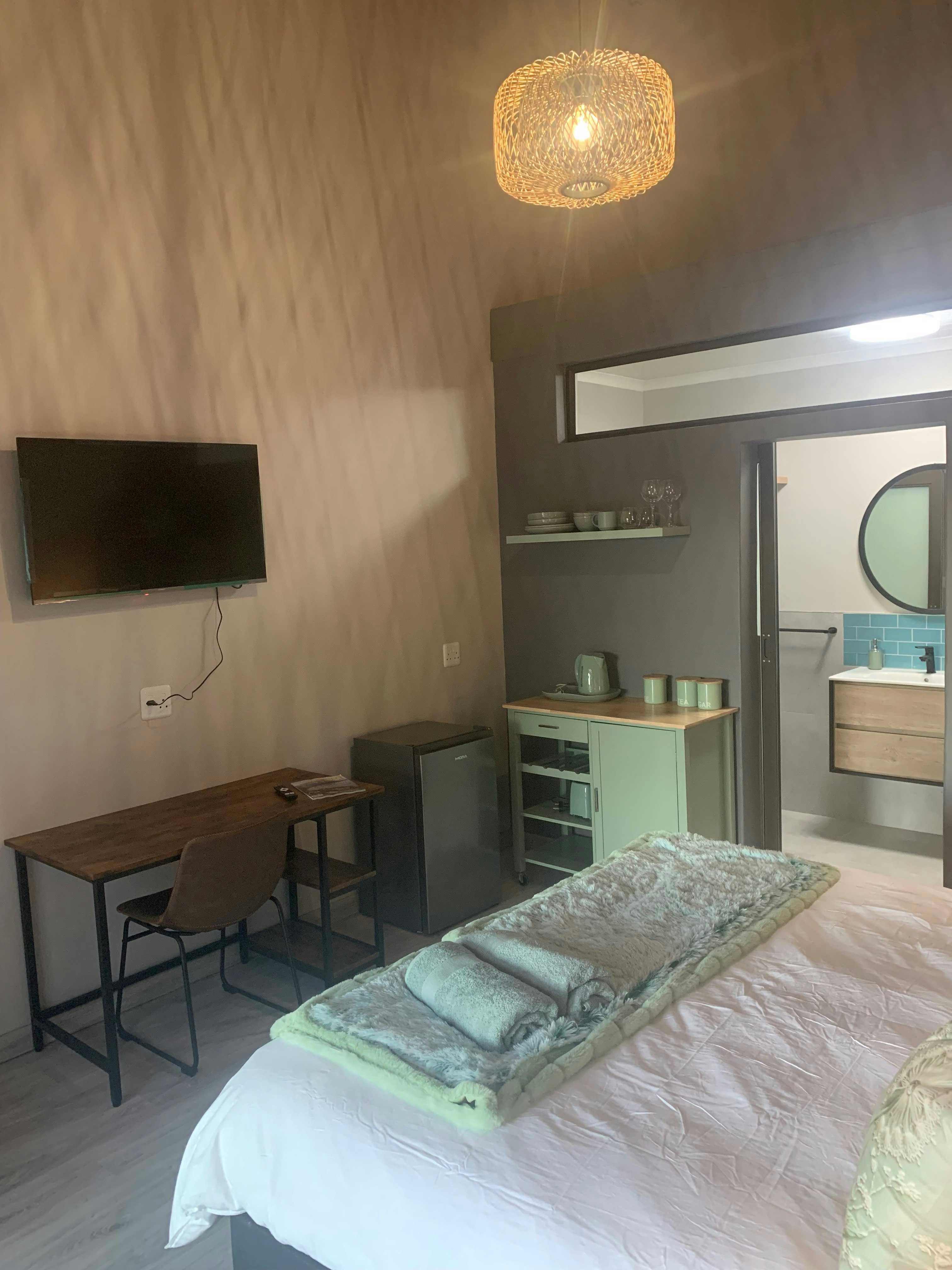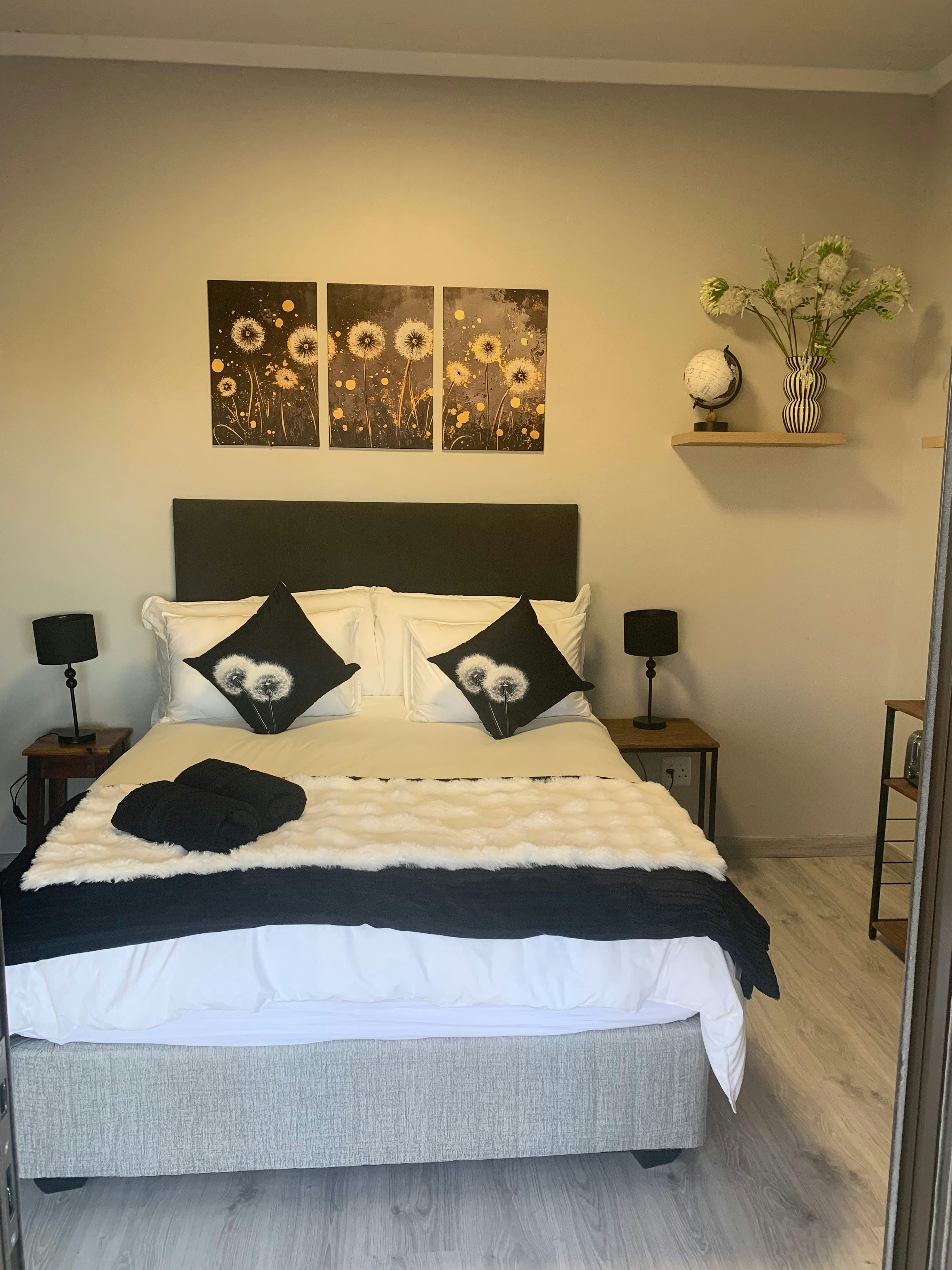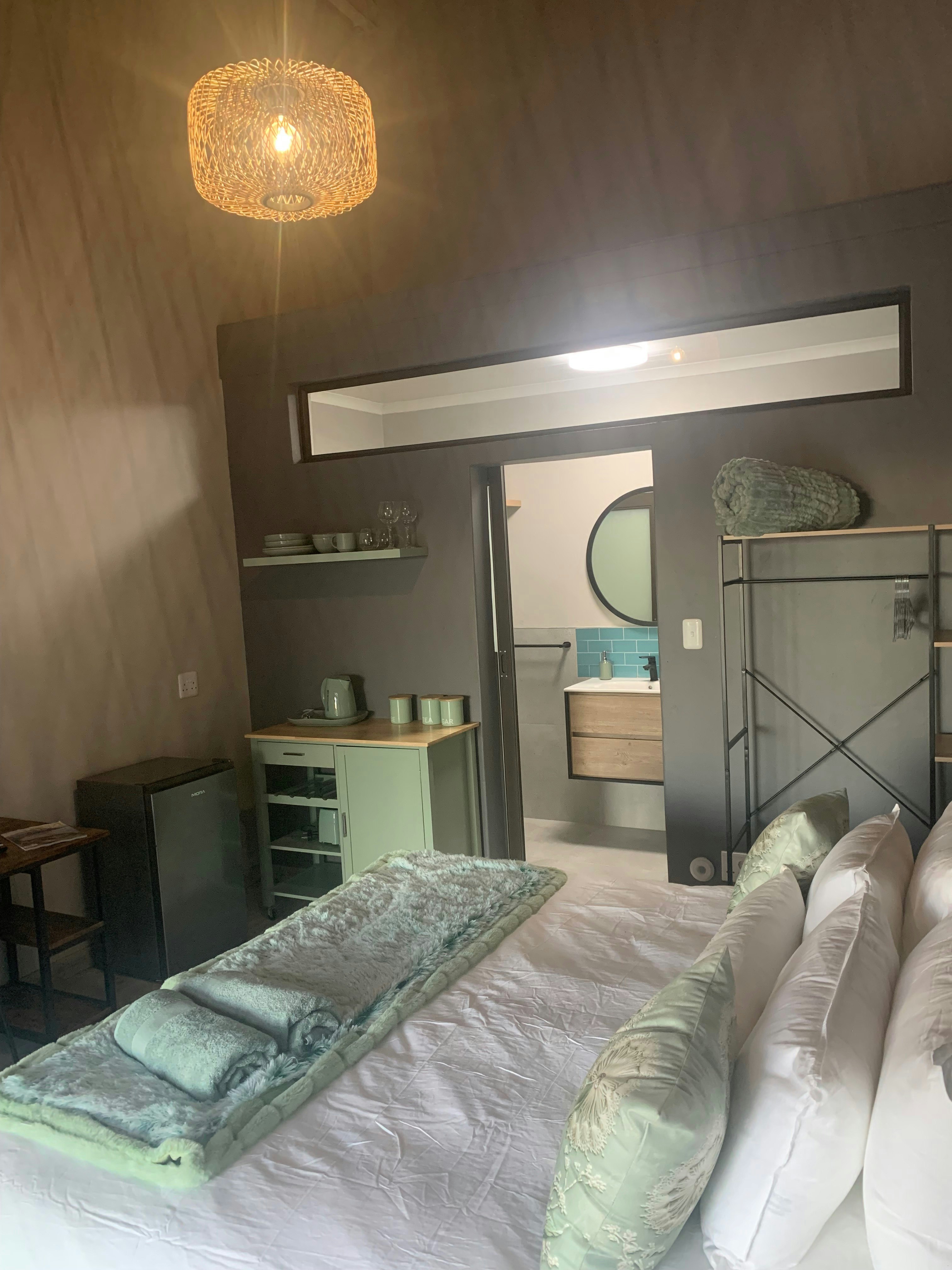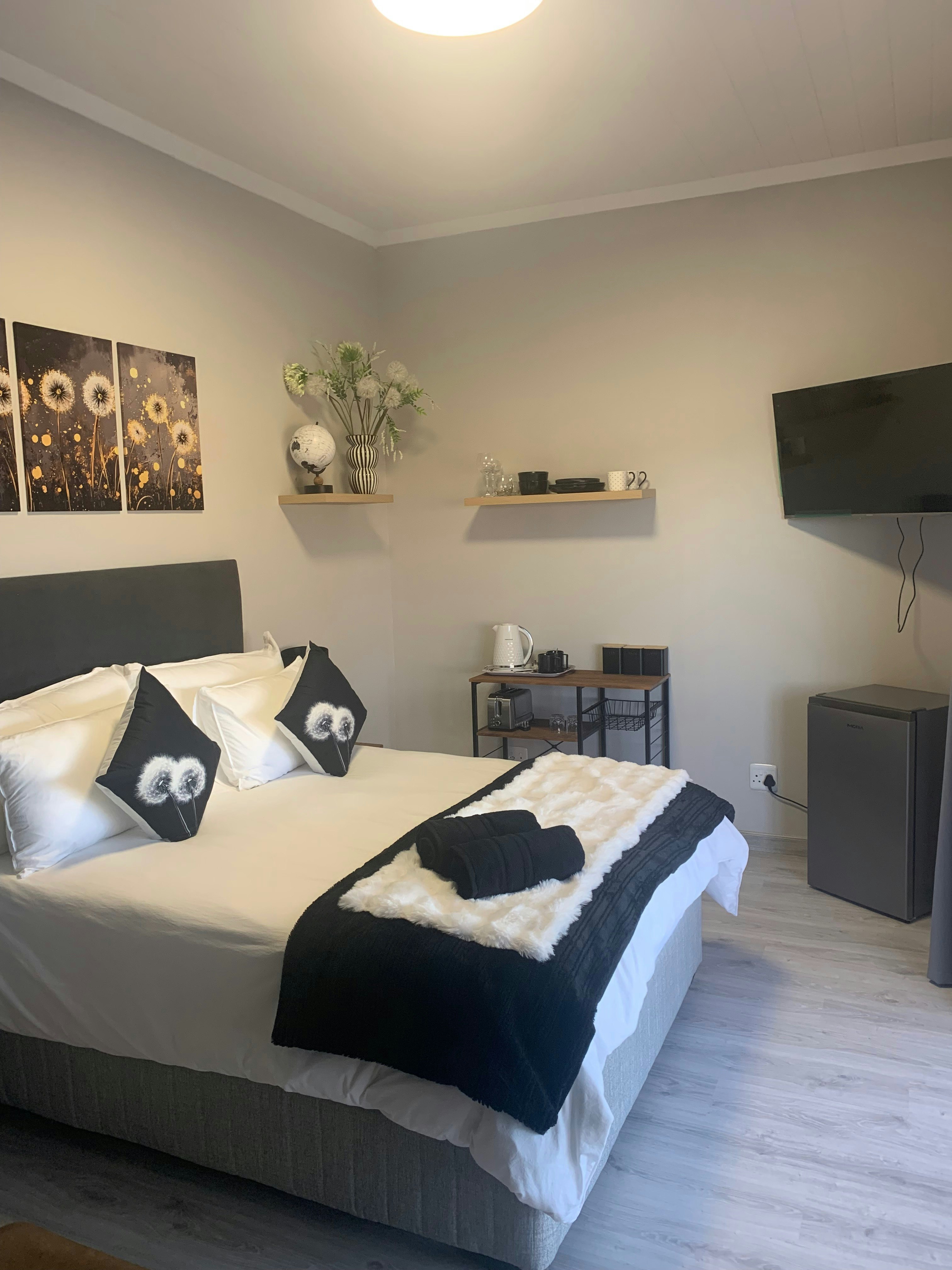 This unit can accommodate up to 2 guests and is furnished with a king-size bed and has an en-suite bathroom that is fitted with a shower, washbasin and toilet. Linen and bath towels are provided. The room also features a work desk and a TV with DStv and streaming services. The kitchenette is equipped with a bar fridge, microwave, toaster, necessary cutlery and crockery and tea- and coffee-making facilities. Access to Wi-Fi is available. Guests can enjoy an undercover patio with seating, a shared swimming pool, 2 braai areas and a lush garden. Secure parking is available on the premises.