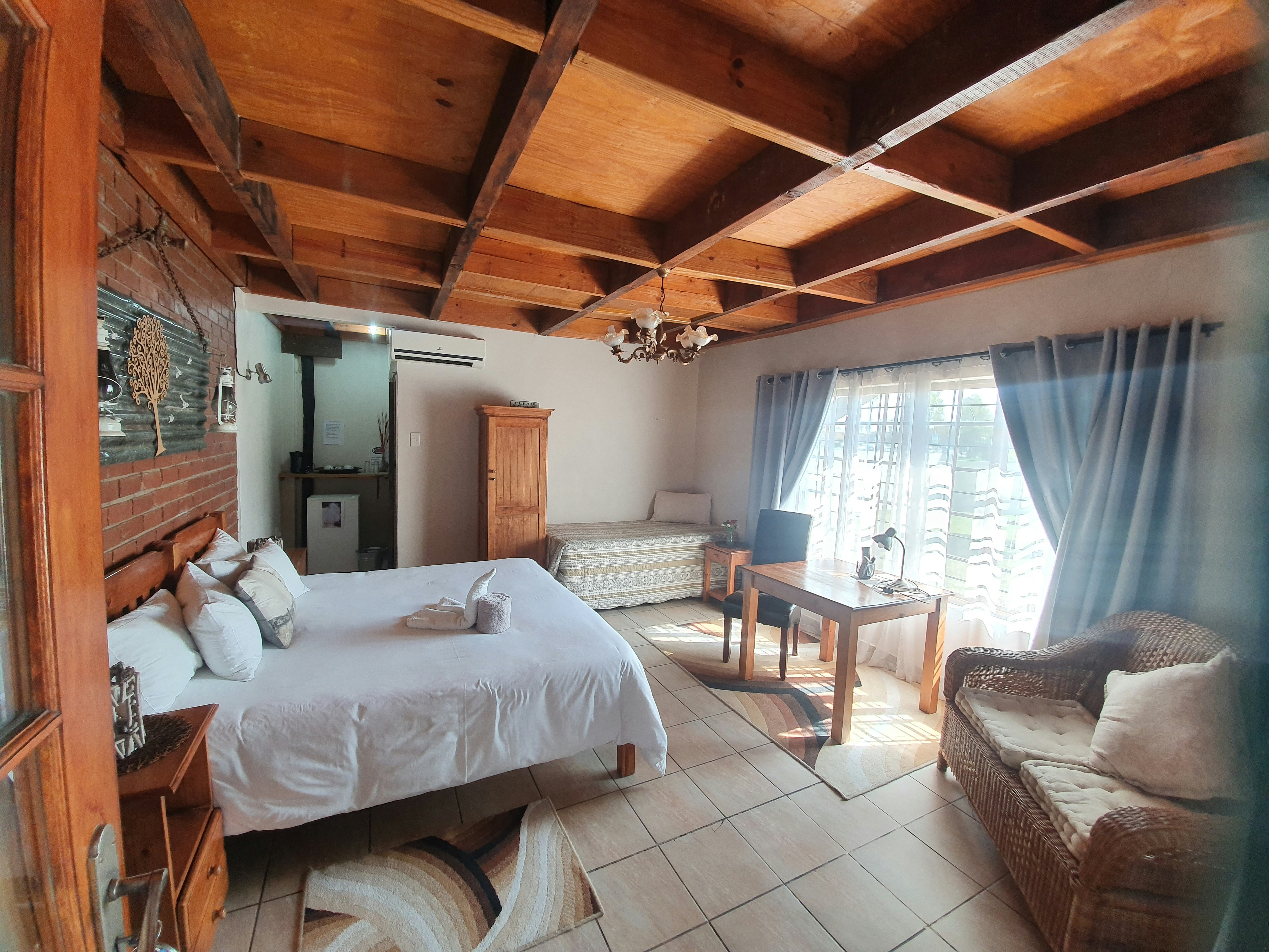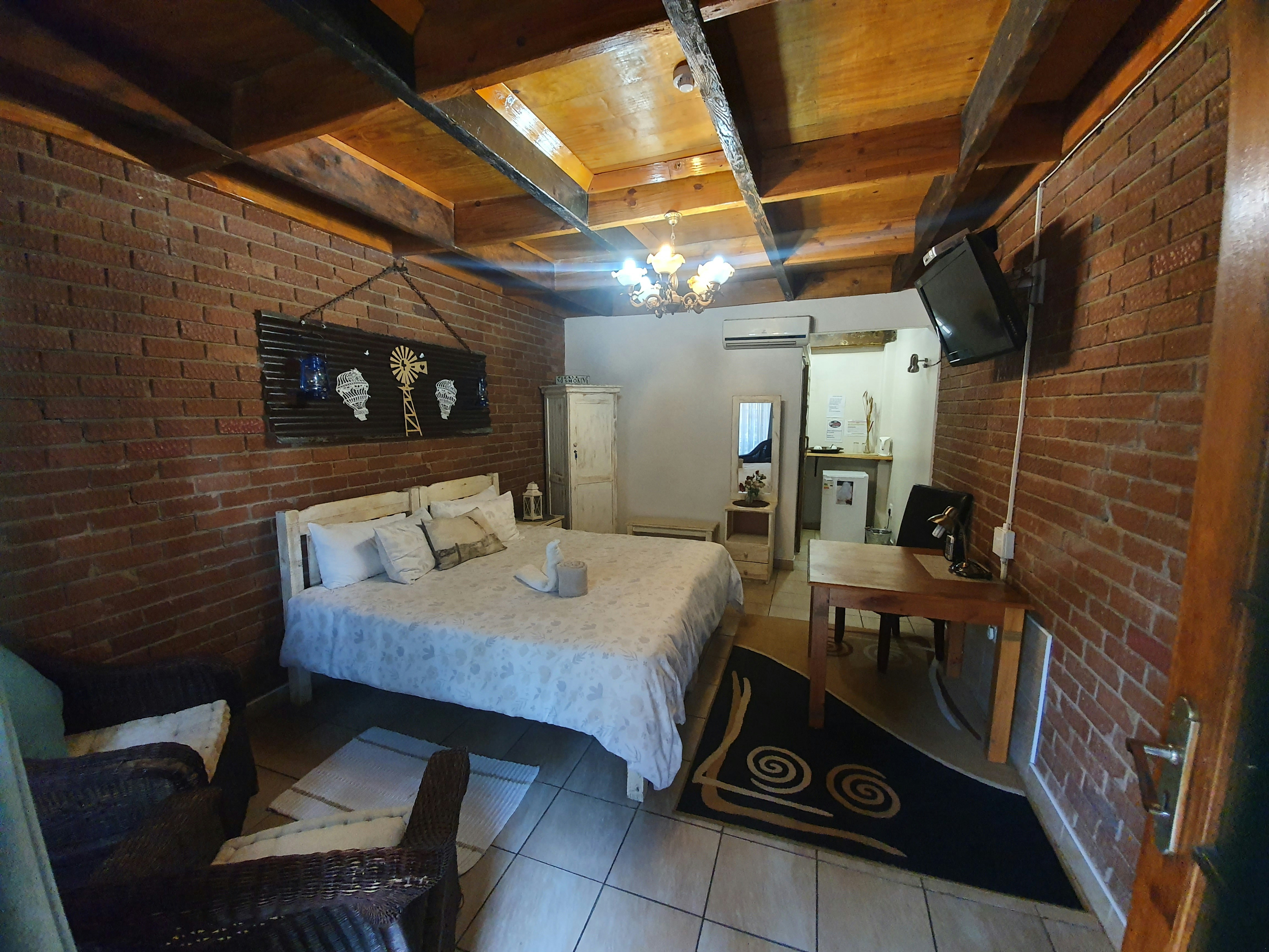 The double-storey guesthouse comprises 10 rooms; 5 of the rooms are located on the ground floor, and the others on the first floor. The rooms can accommodate between 1 and 2 people, and they are furnished with three-quarter, twin beds or king-size beds. Each of the rooms has an en-suite bathroom, for convenience bedding and 2 towels are provided. Air-conditioning, a small fridge, tea-and-coffee-making facilities, a TV with DStv, and Wi-Fi, is available in some of the rooms.