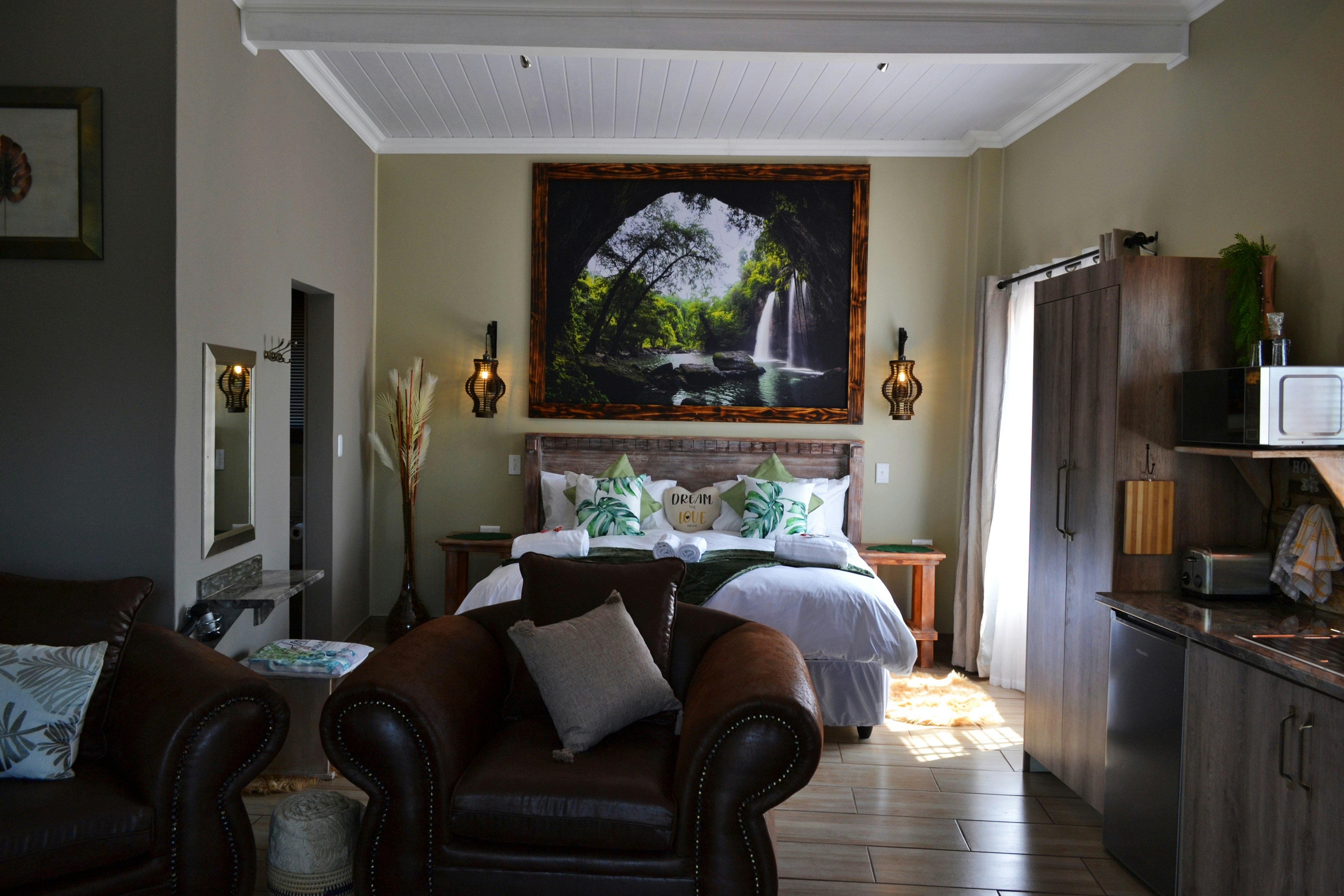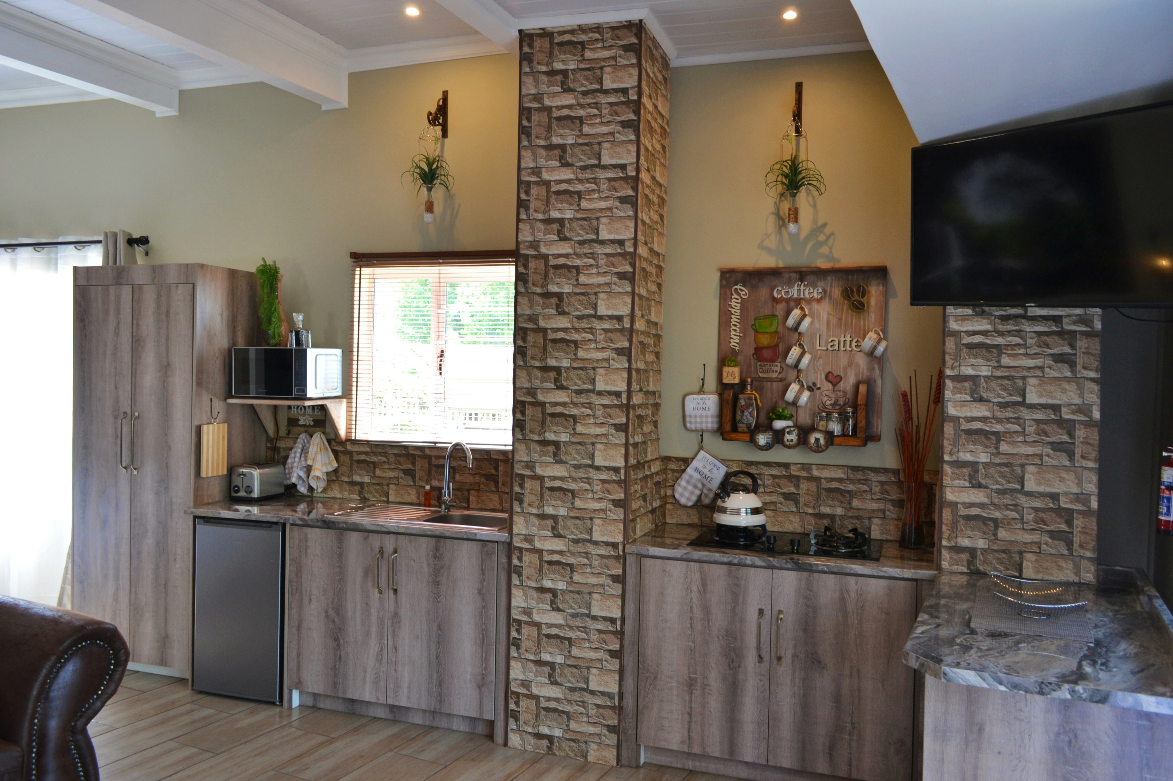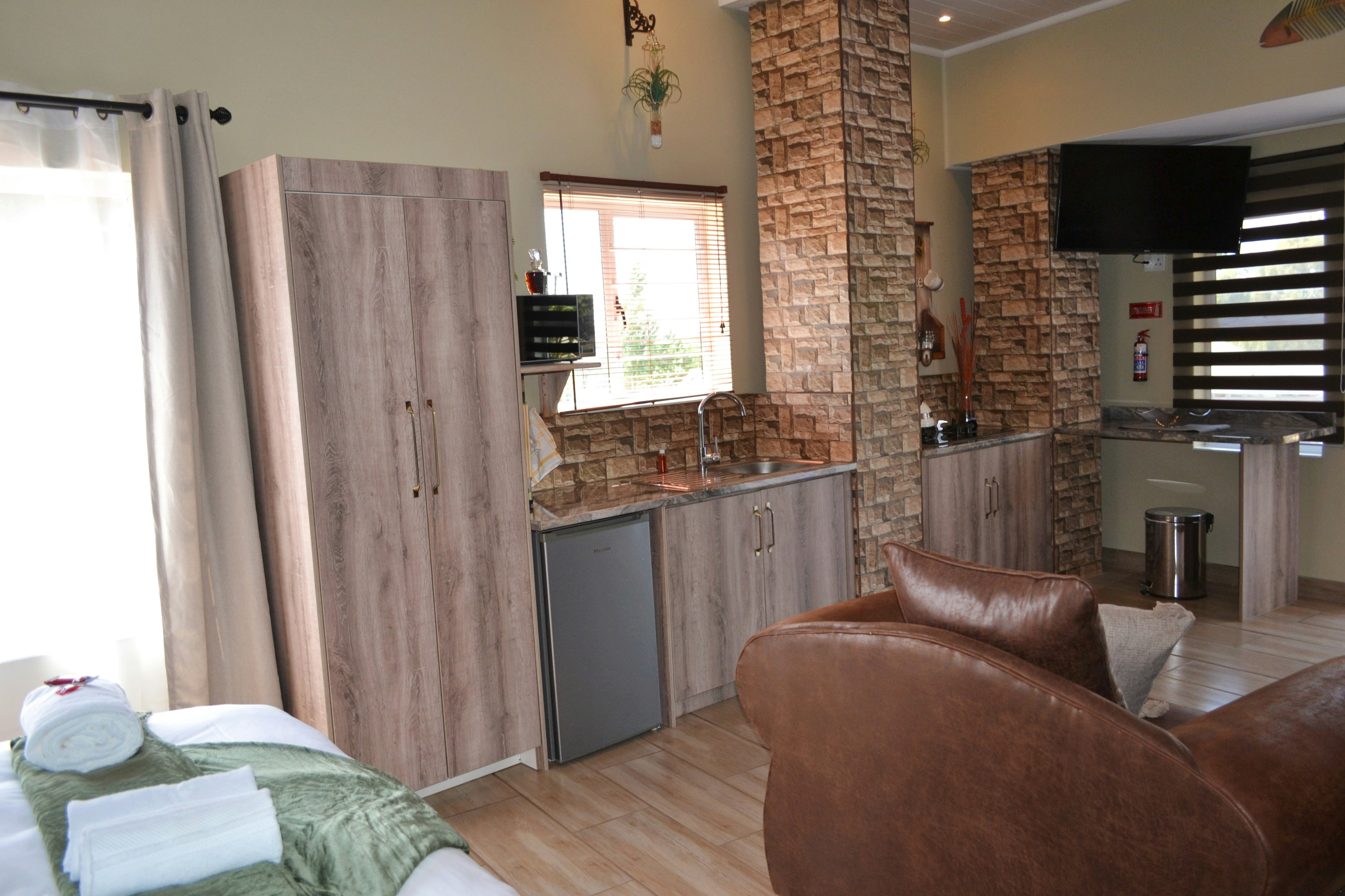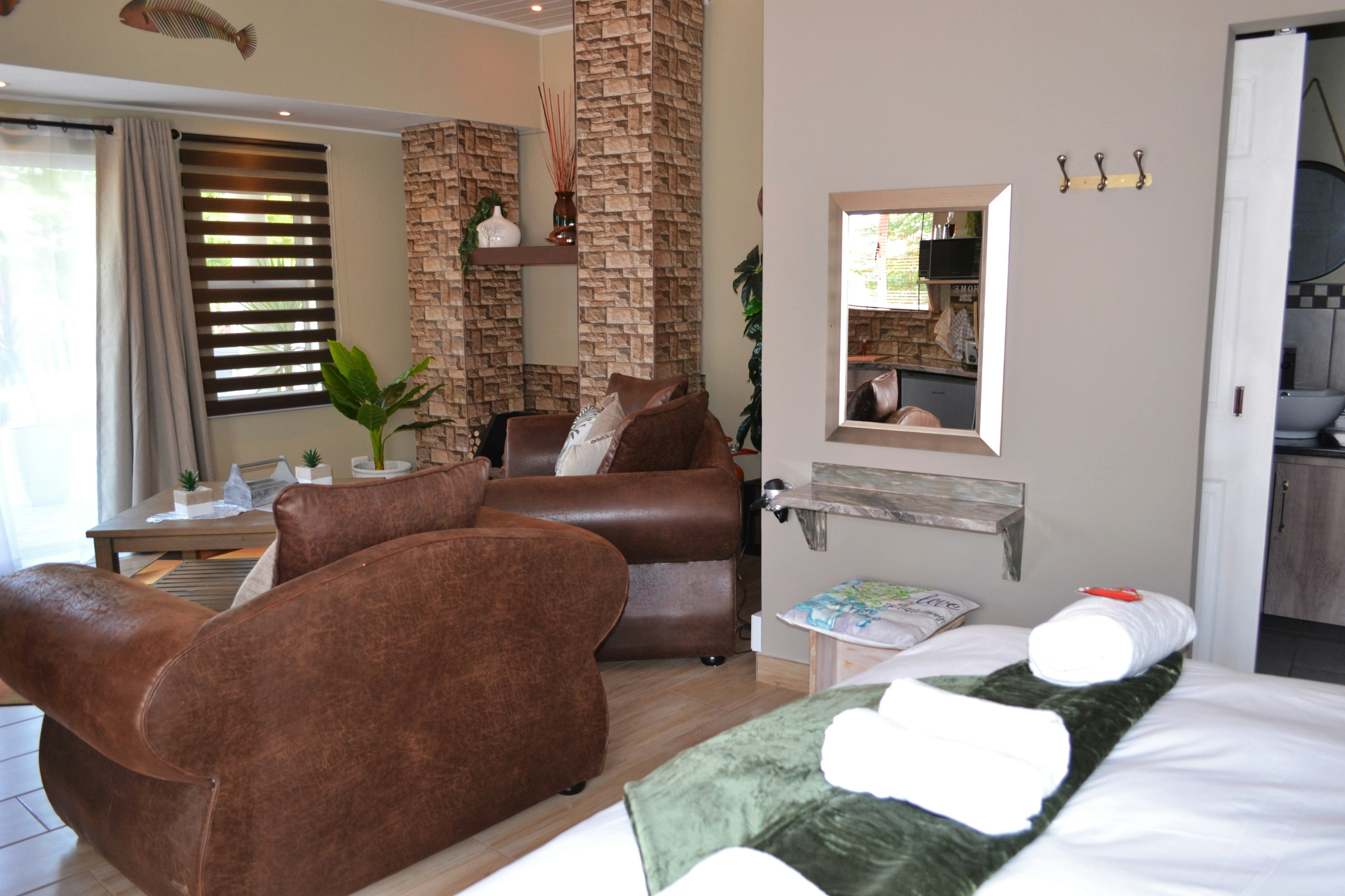 There are 3 exclusive self-catering studios on site. Unit 1 comprises an open-plan lounge with a gas fireplace and a smart kitchen with a 2-plate gas stove, microwave, fridge and toaster, coffee- and tea-making facilities, crockery, and cutlery. The bedroom has a king-size bed with extra blankets provided if required, and an en-suite bathroom fitted with a bath, shower, toilet, and basin. There is a TV with selected DStv channels.