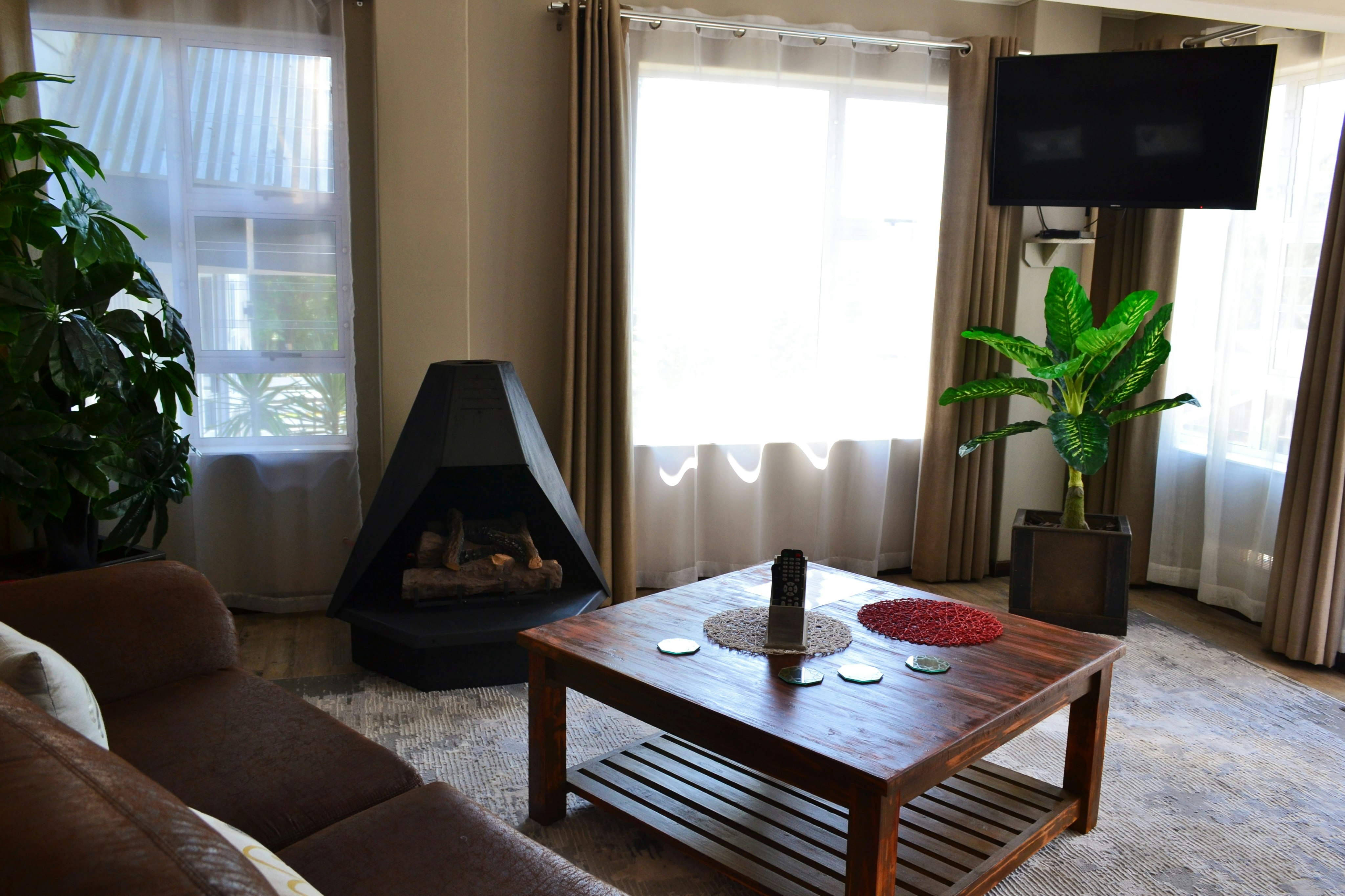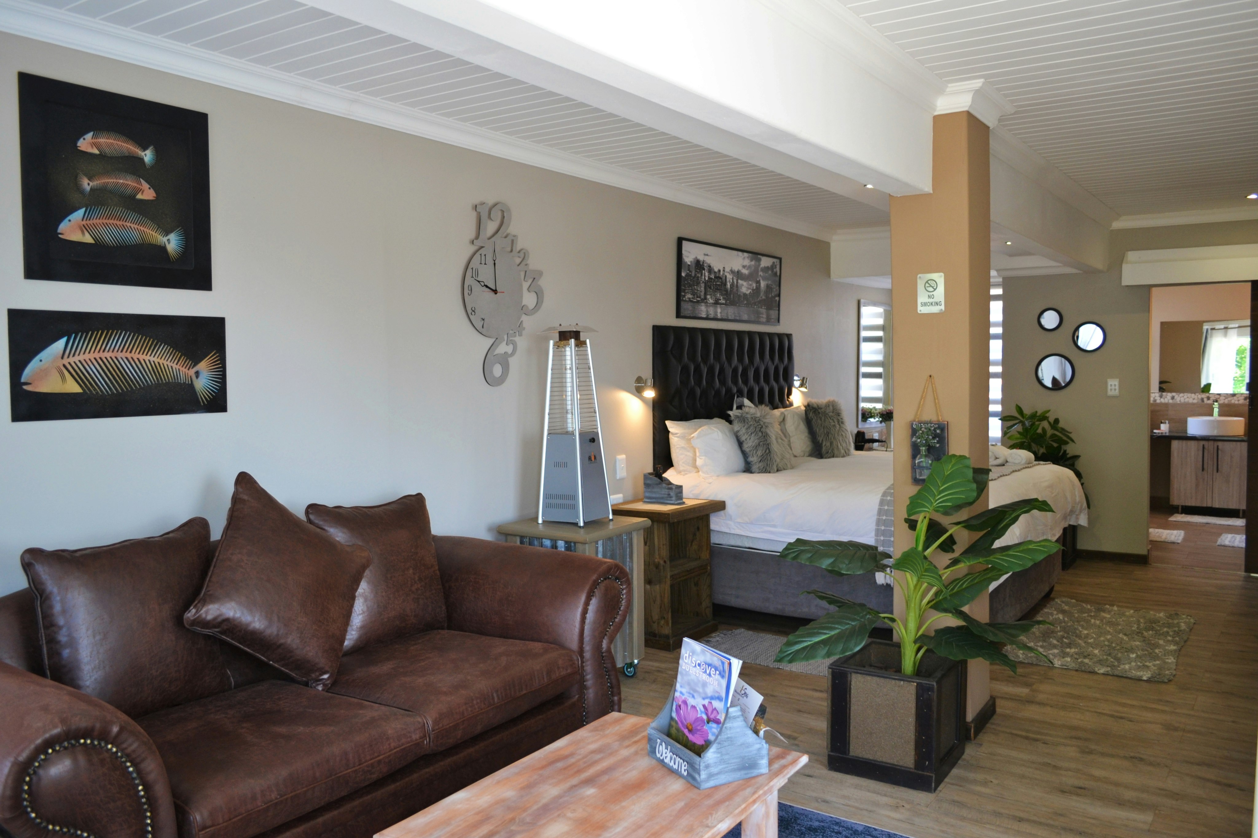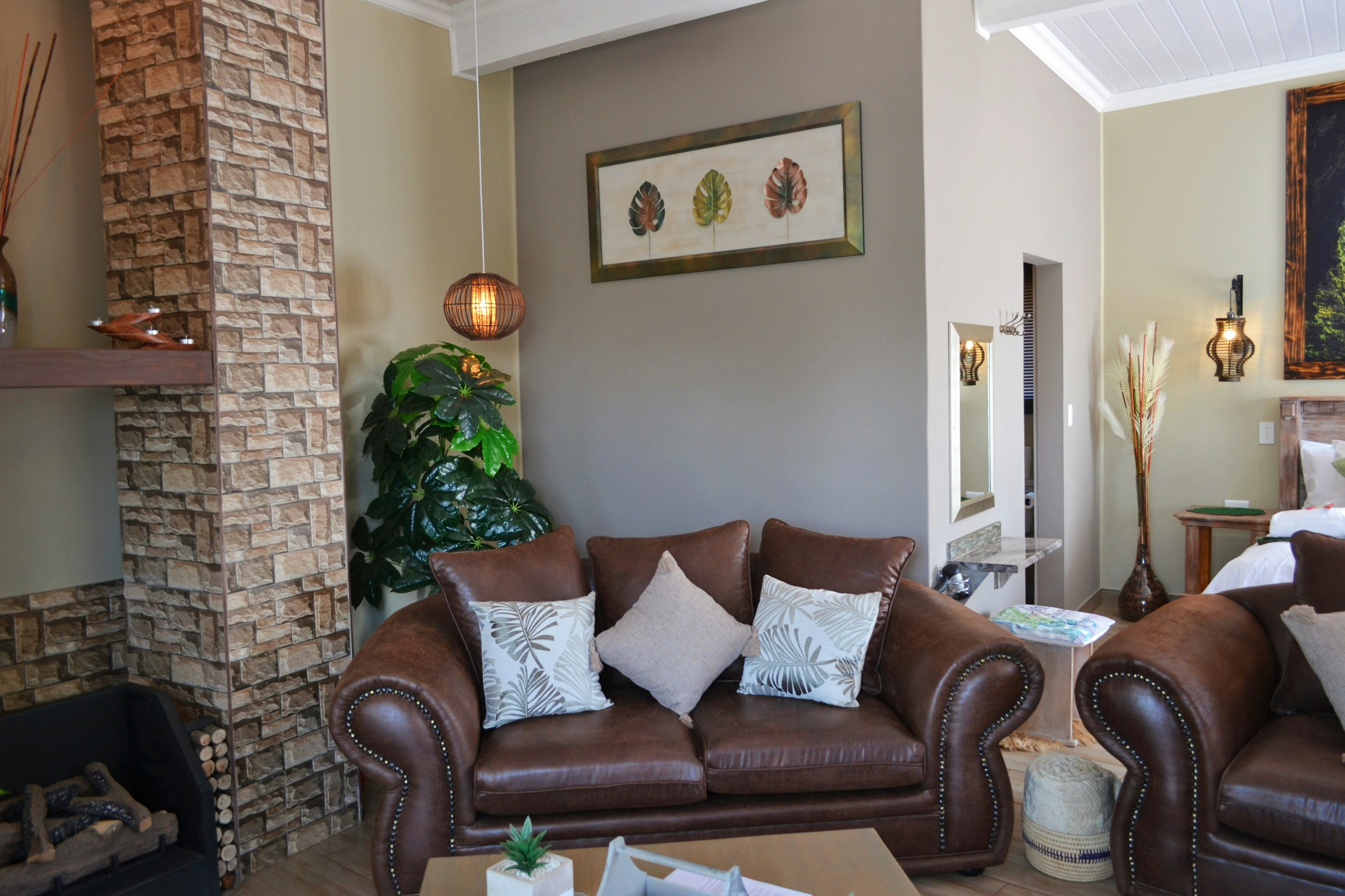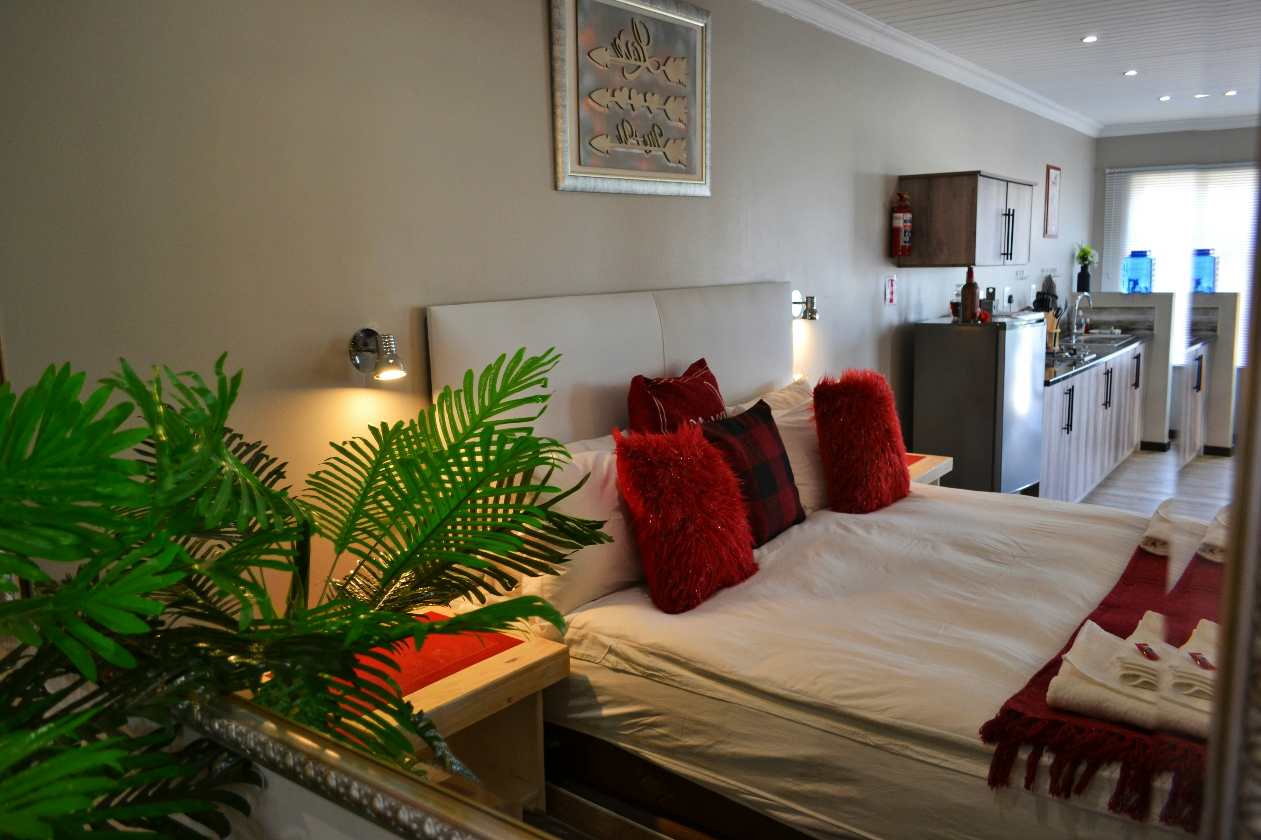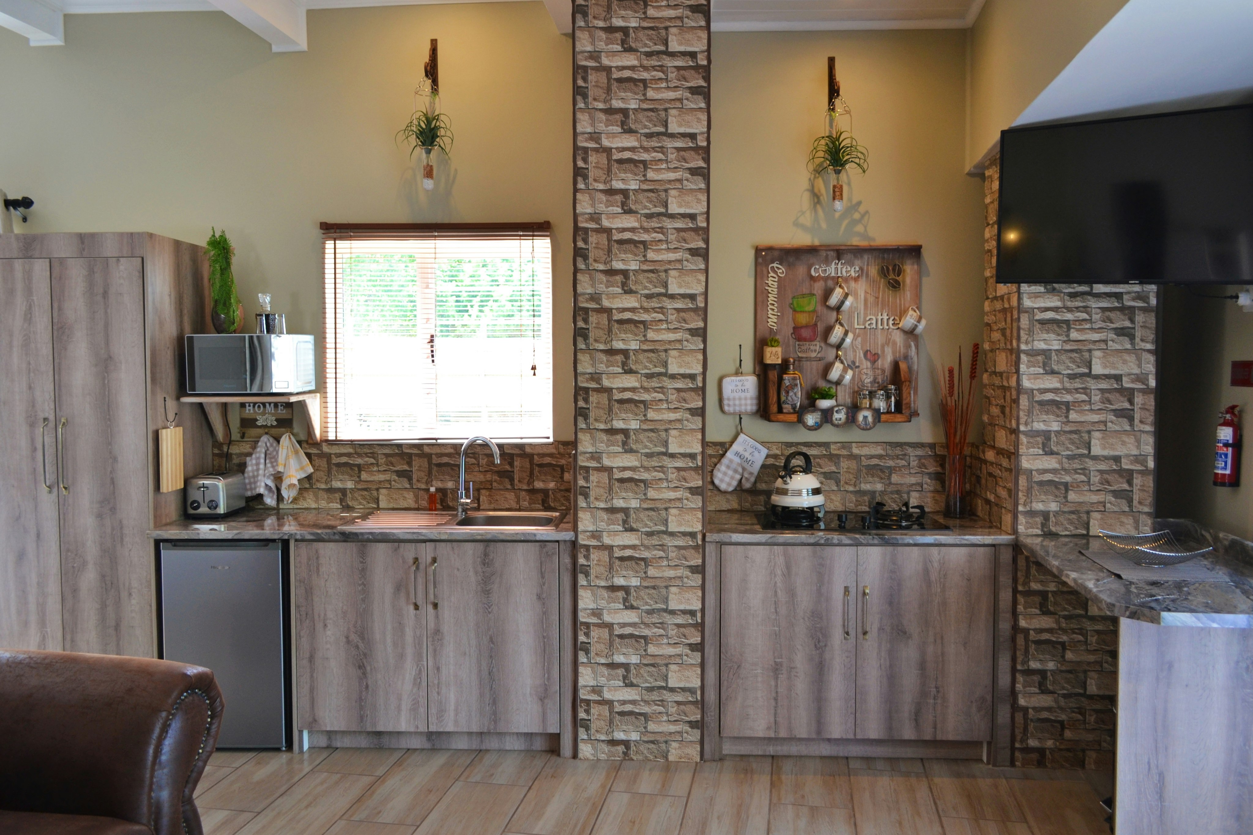 There are 3 exclusive self-catering studios on site. Unit 1 comprises an open-plan lounge with a gas fireplace and a smart kitchen with a 2-plate gas stove, microwave, fridge and toaster, coffee- and tea-making facilities, crockery, and cutlery. The bedroom has a king-size bed with extra blankets provided if required, and an en-suite bathroom fitted with a bath, shower, toilet, and basin. There is a TV with selected DStv channels.