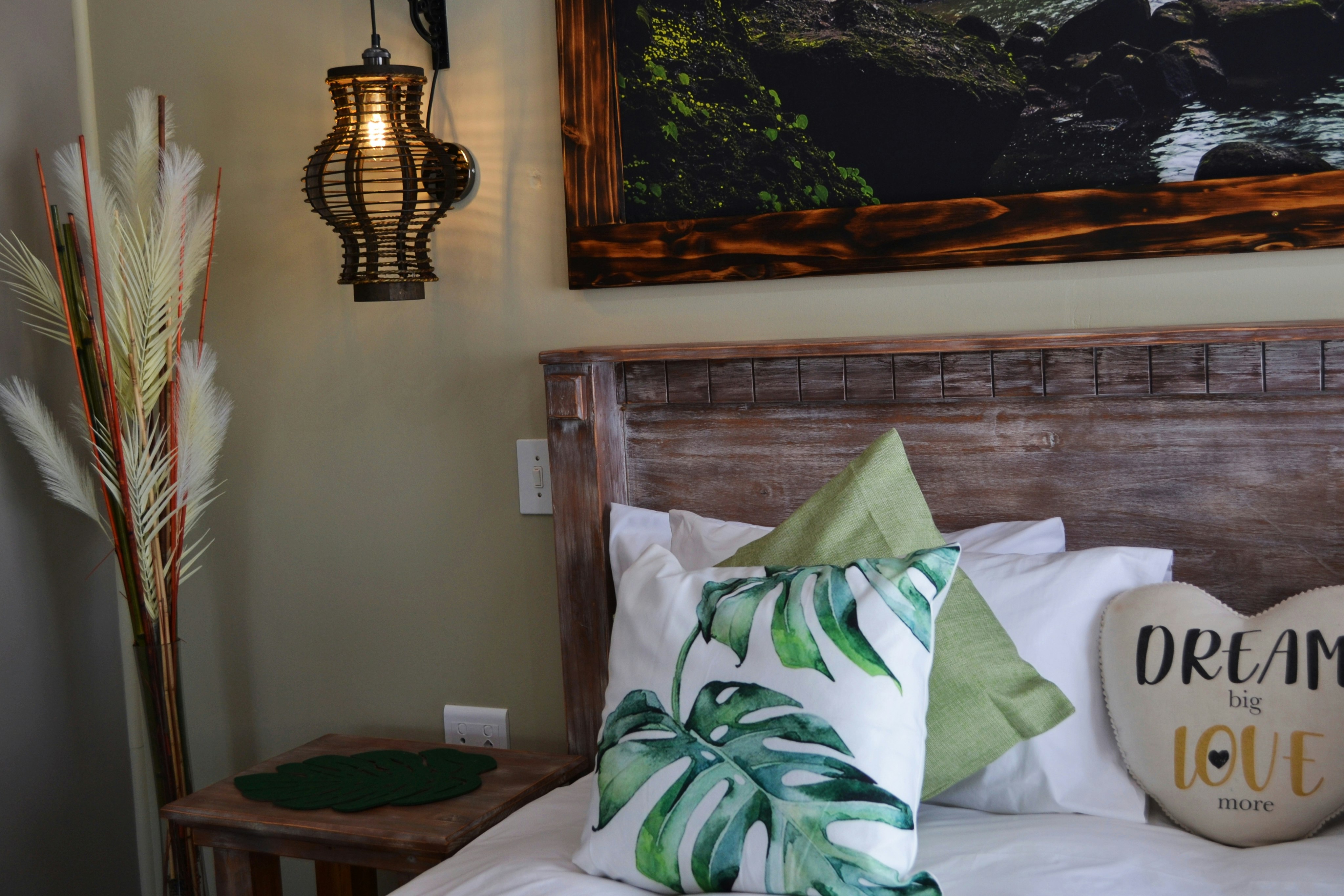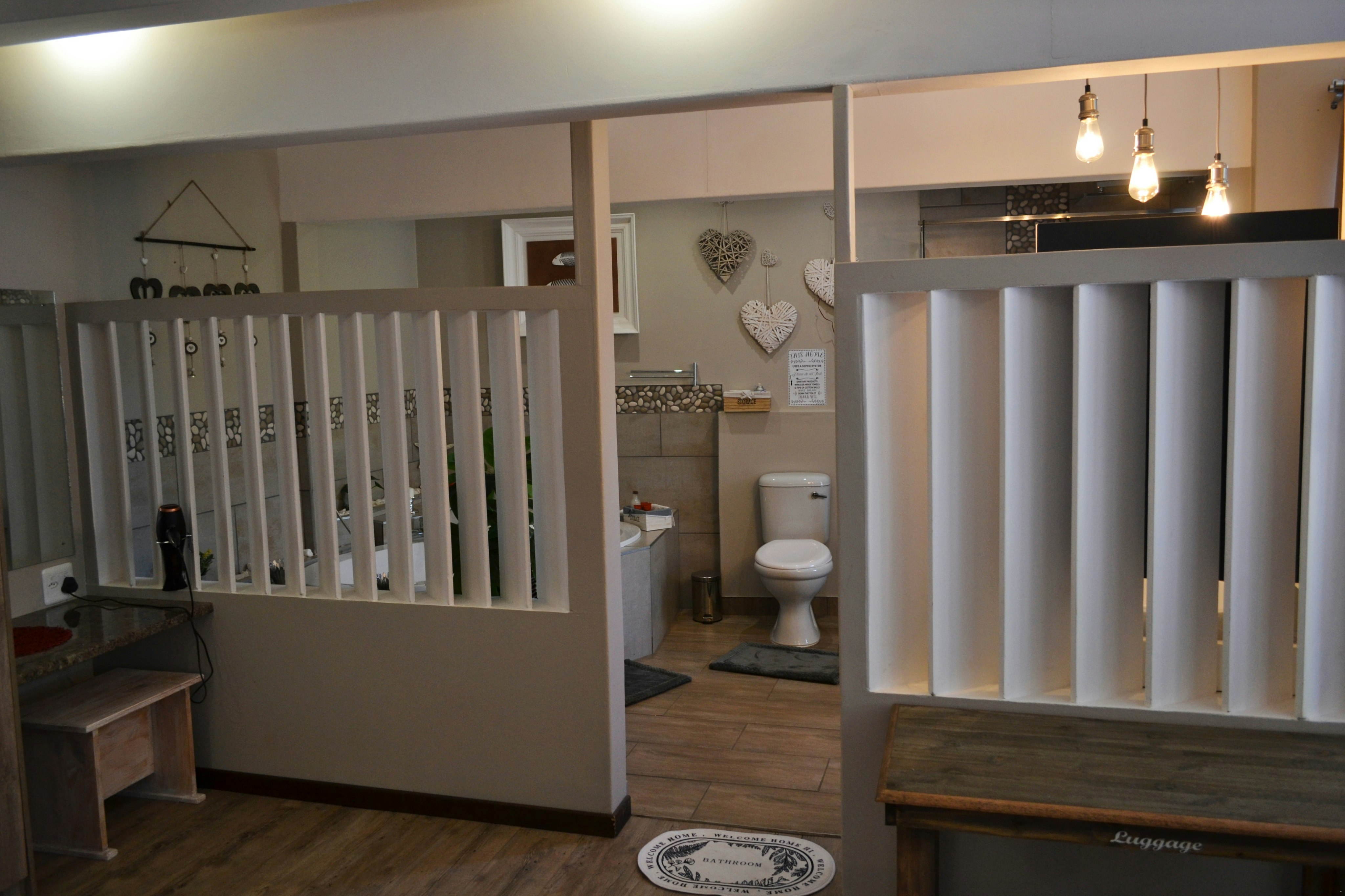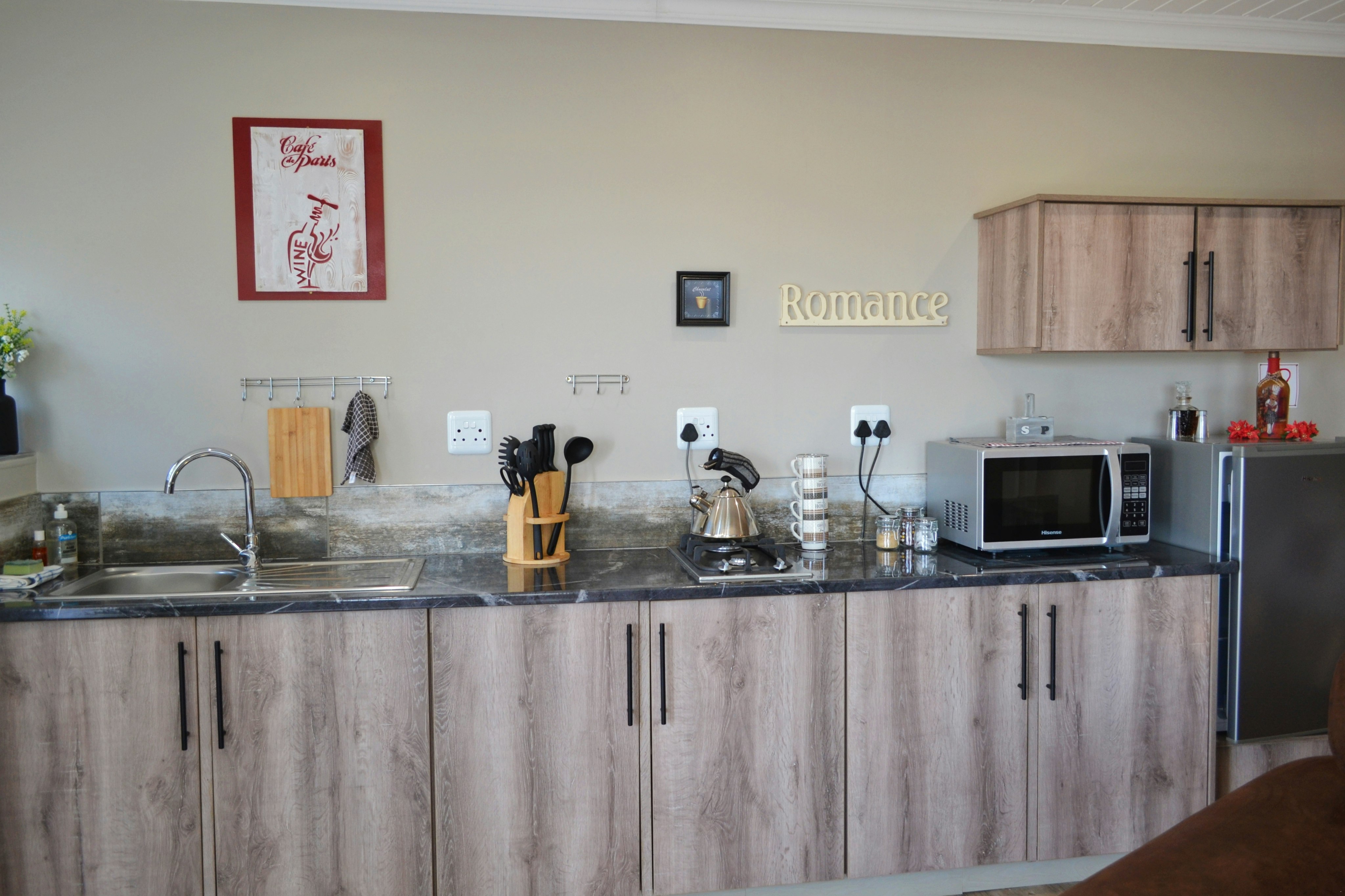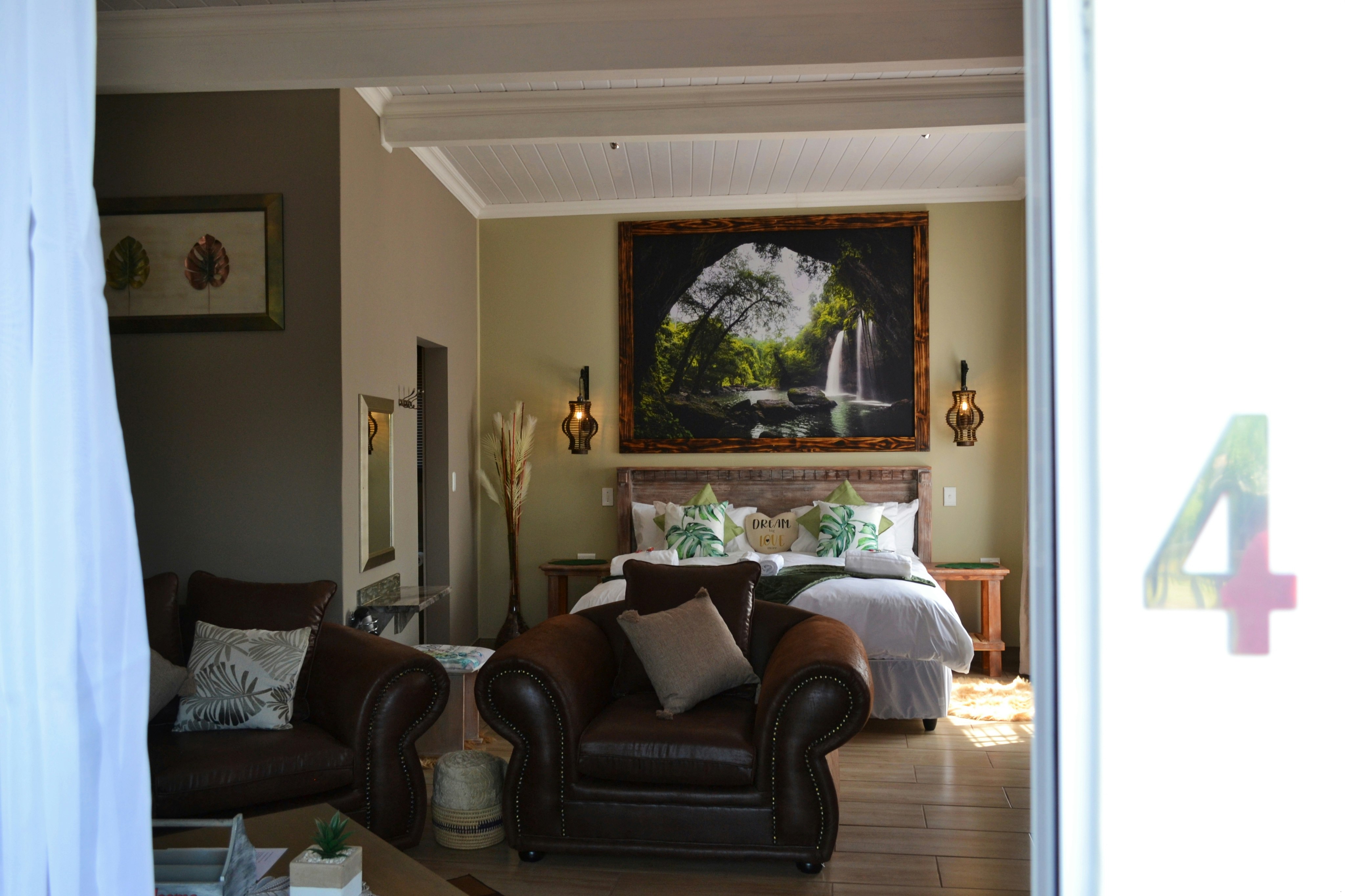 There are 3 exclusive self-catering studios on site. Unit 1 comprises an open-plan lounge with a gas fireplace and a smart kitchen with a 2-plate gas stove, microwave, fridge and toaster, coffee- and tea-making facilities, crockery, and cutlery. The bedroom has a king-size bed with extra blankets provided if required, and an en-suite bathroom fitted with a bath, shower, toilet, and basin. There is a TV with selected DStv channels.