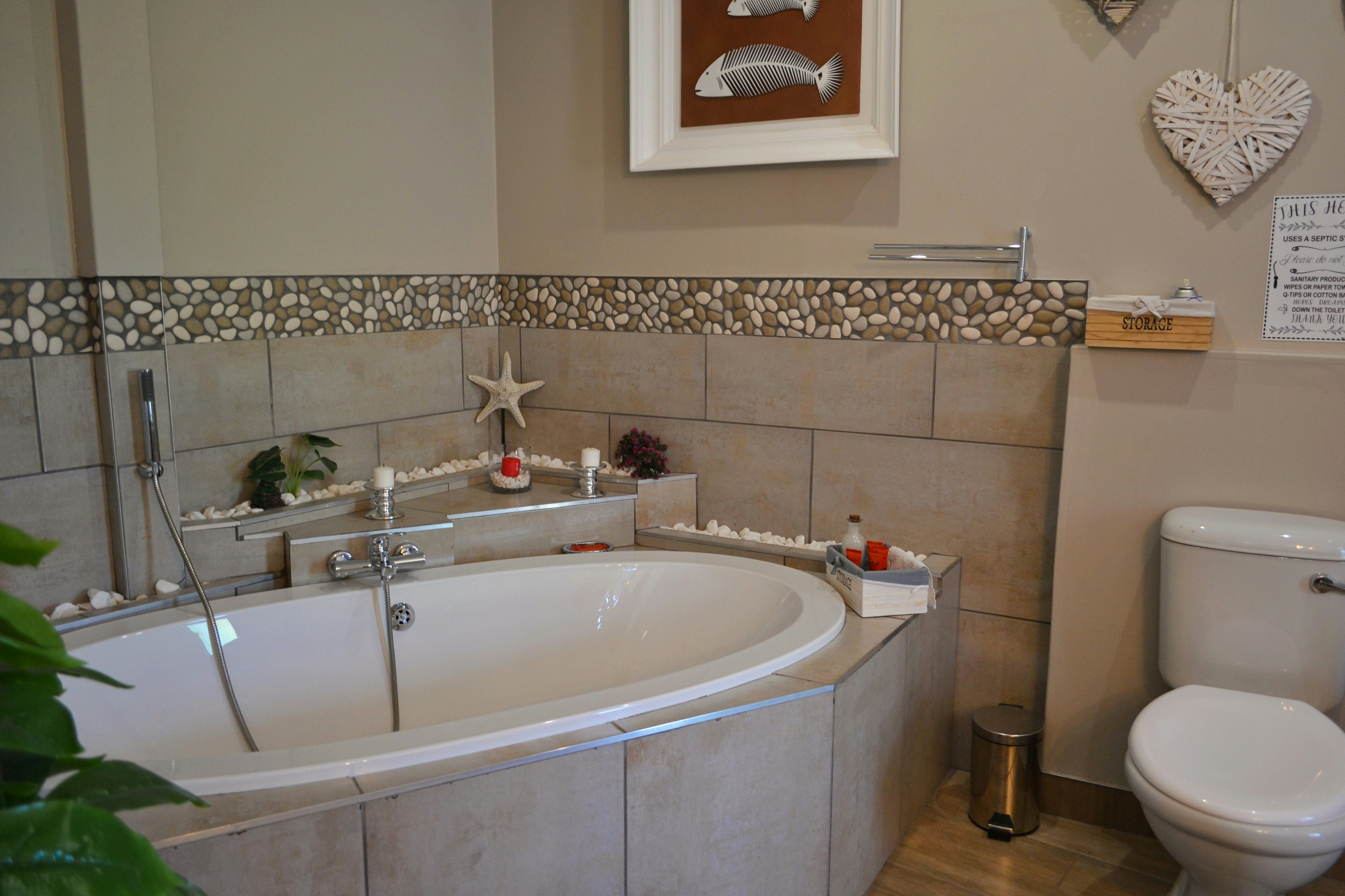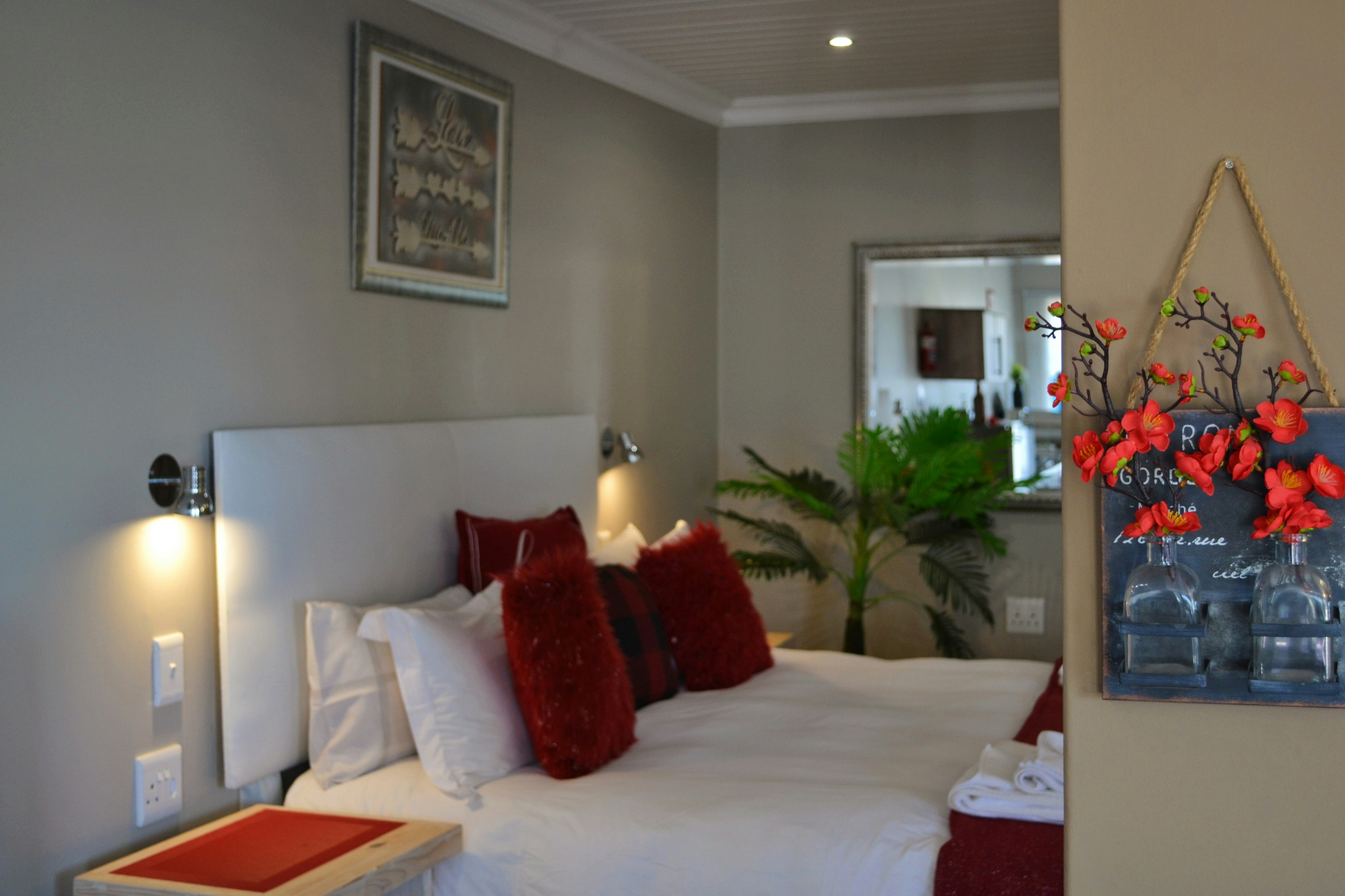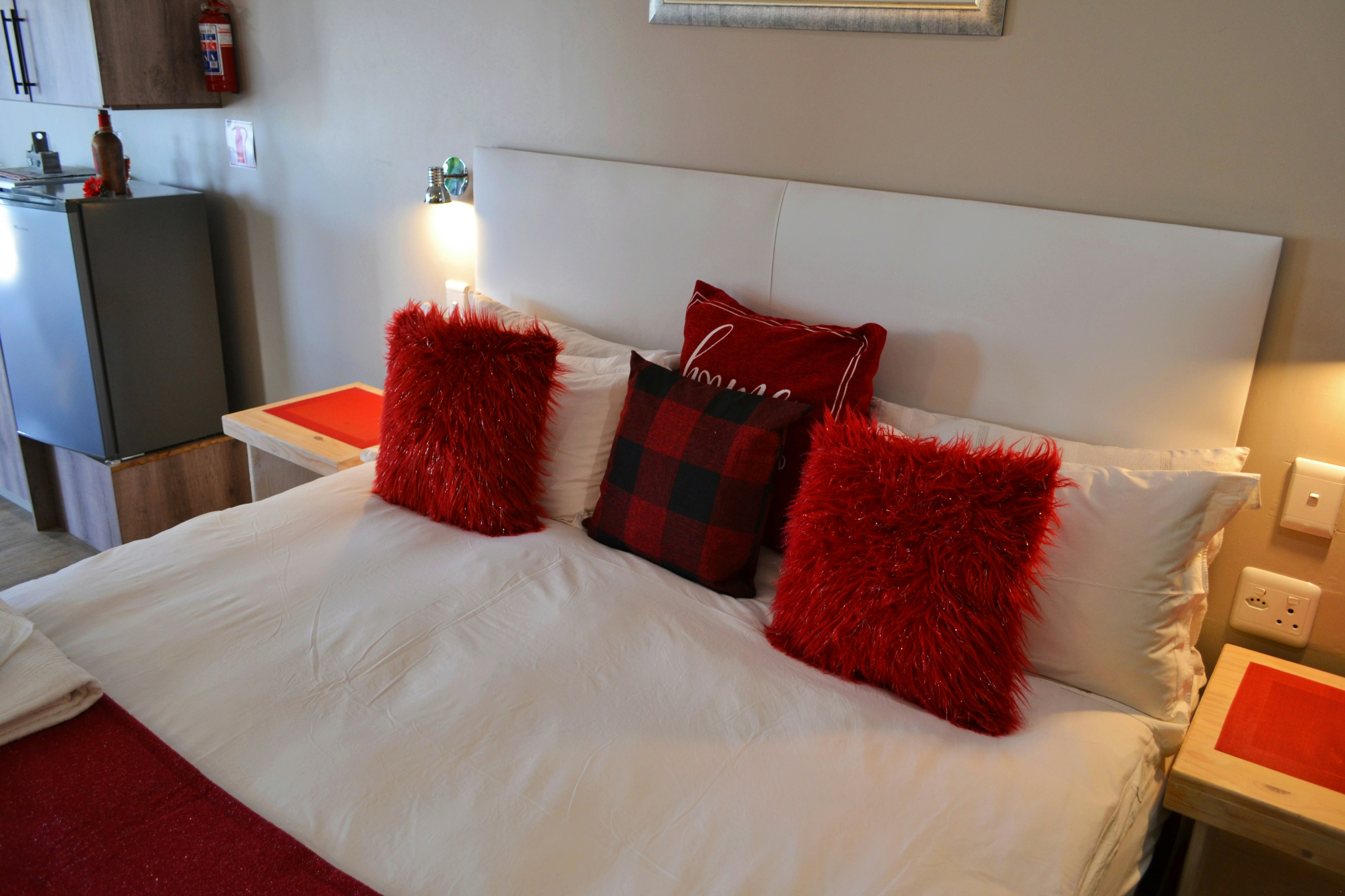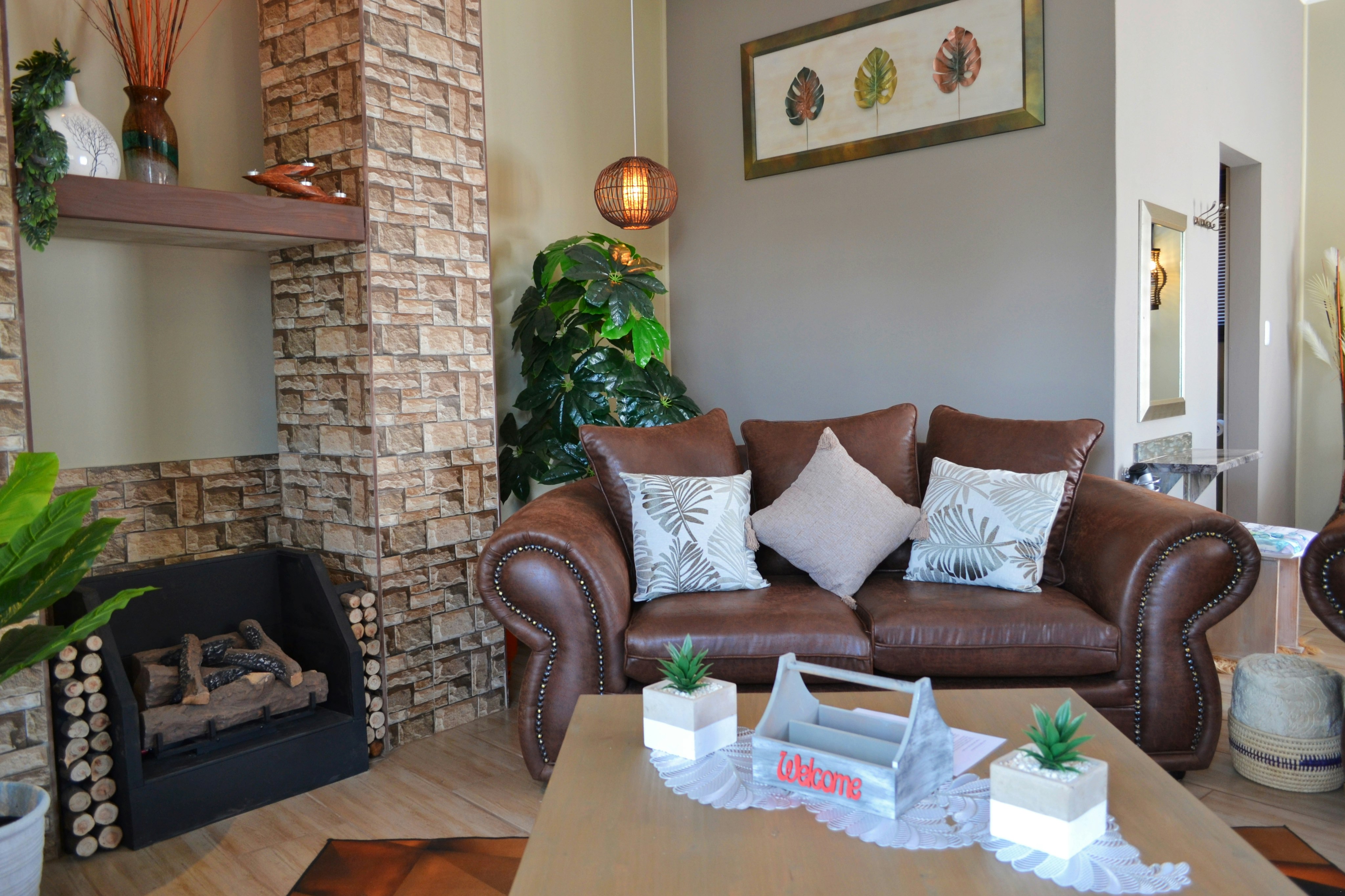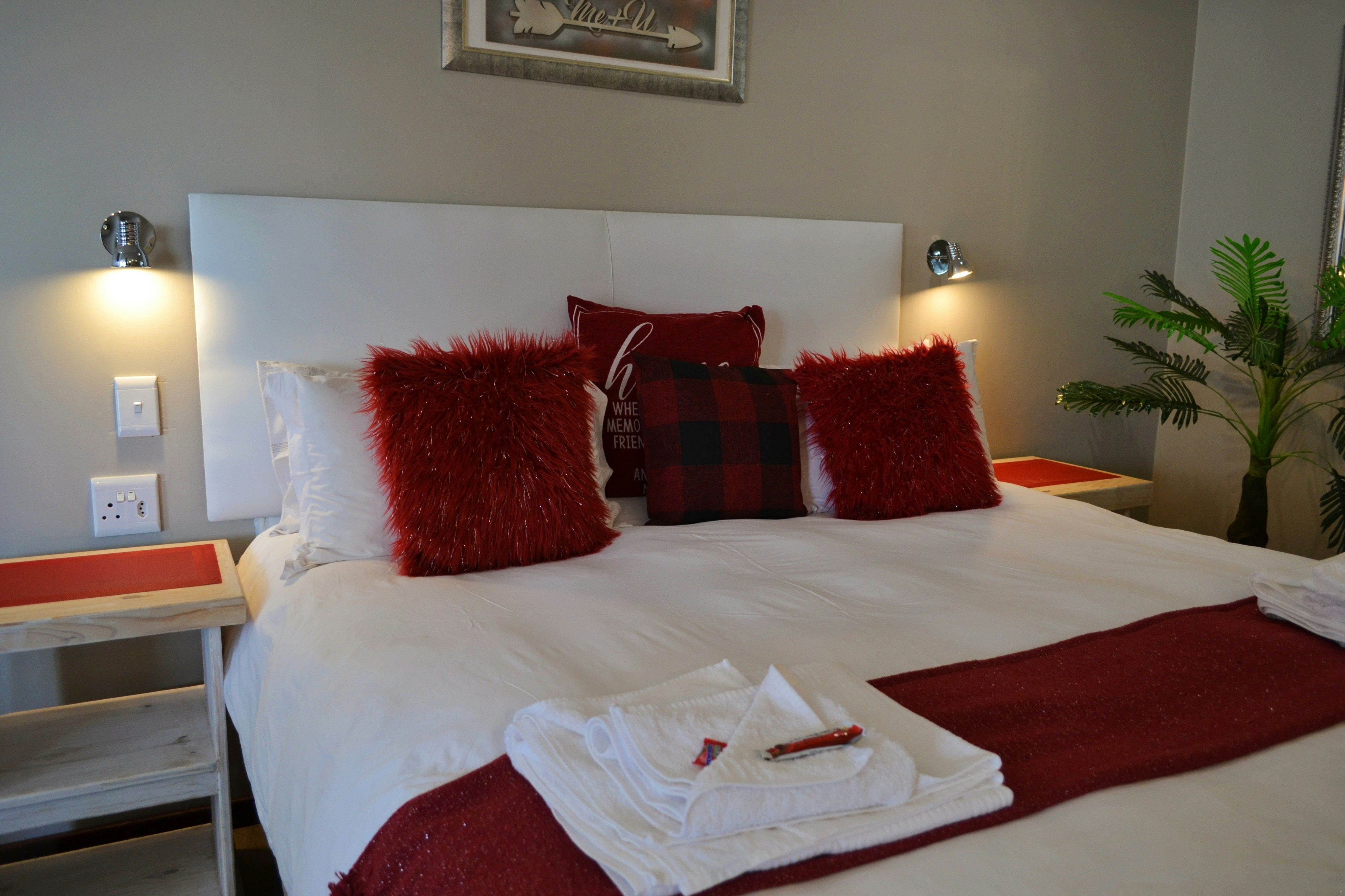 There are 3 exclusive self-catering studios on site. Unit 1 comprises an open-plan lounge with a gas fireplace and a smart kitchen with a 2-plate gas stove, microwave, fridge and toaster, coffee- and tea-making facilities, crockery, and cutlery. The bedroom has a king-size bed with extra blankets provided if required, and an en-suite bathroom fitted with a bath, shower, toilet, and basin. There is a TV with selected DStv channels.