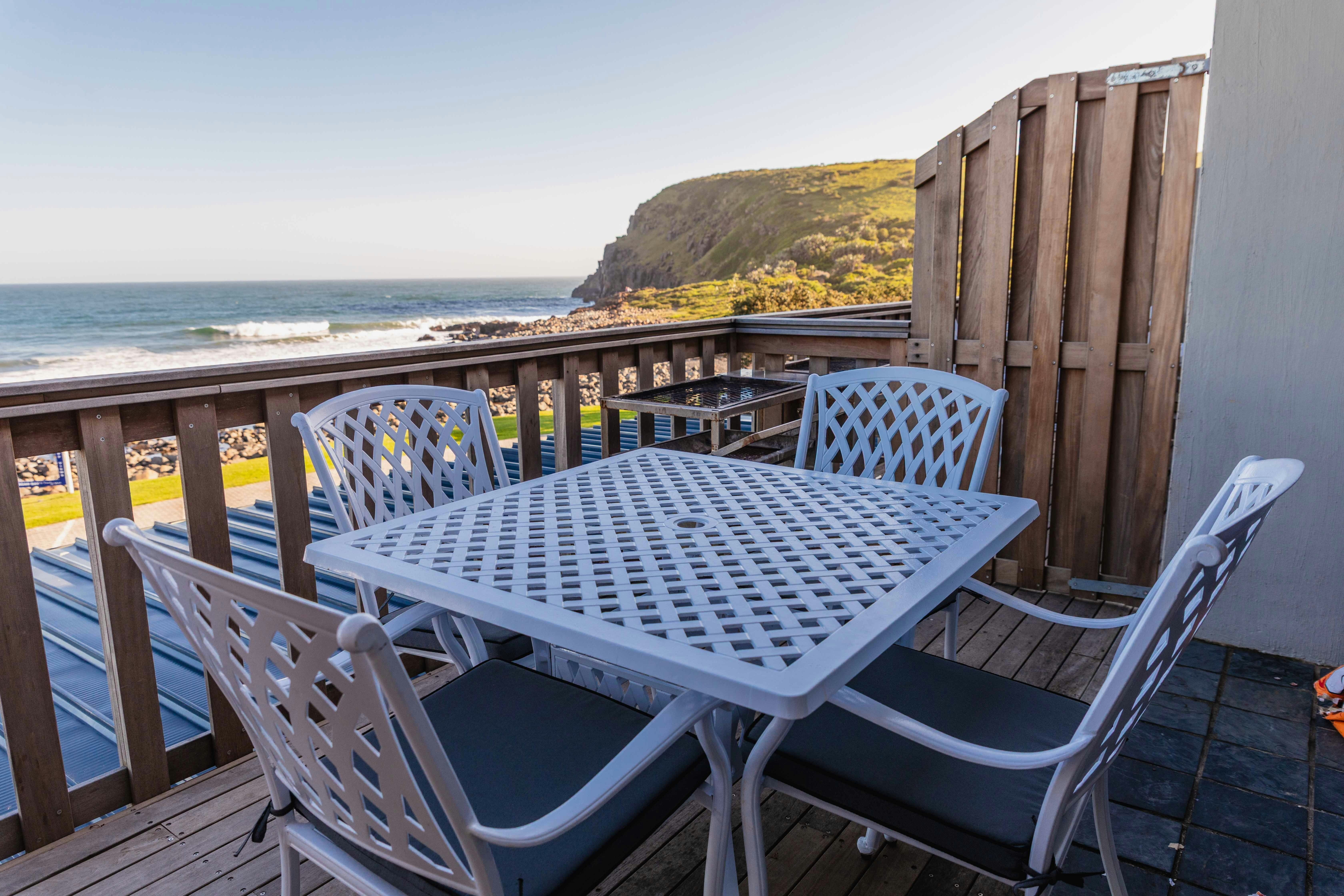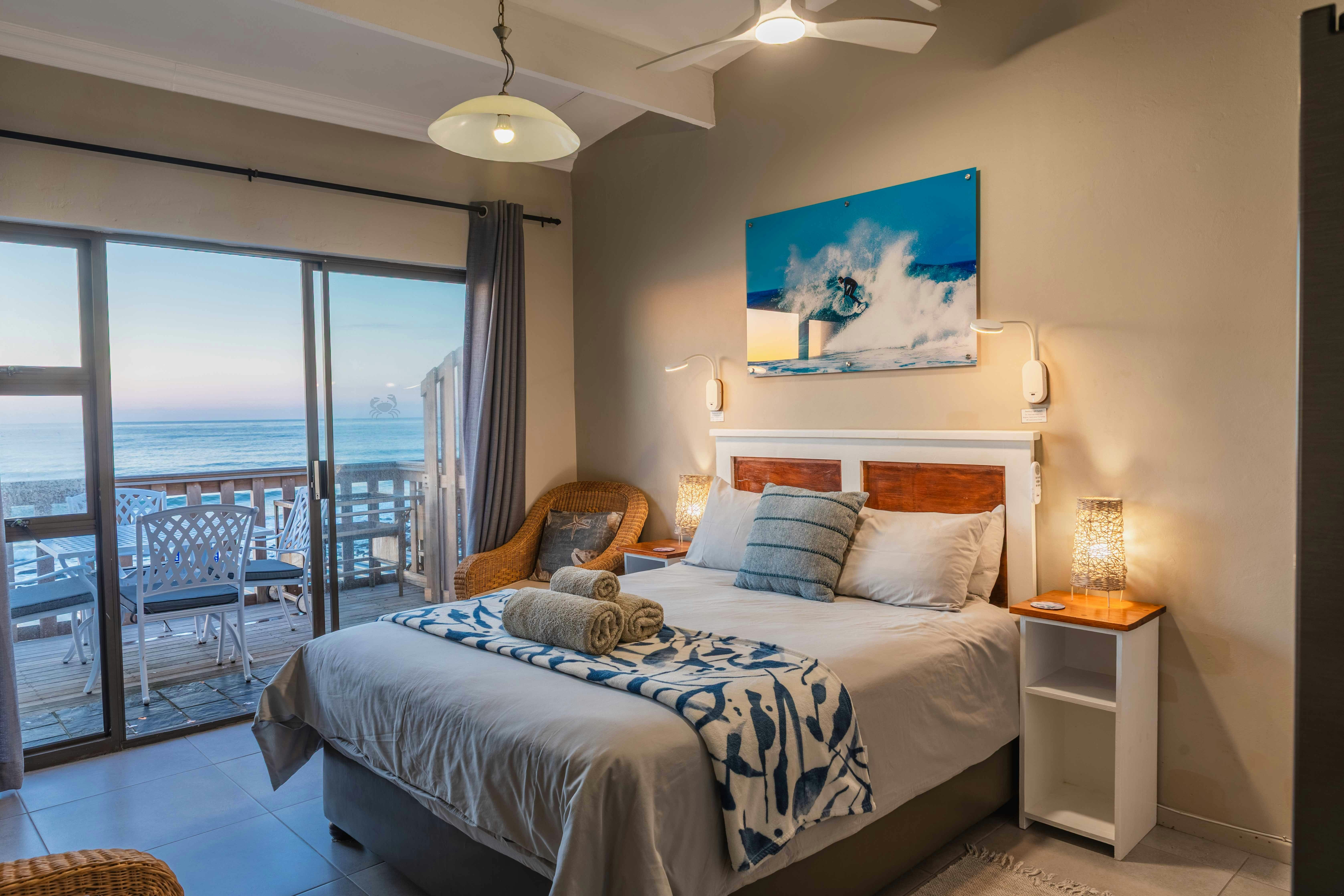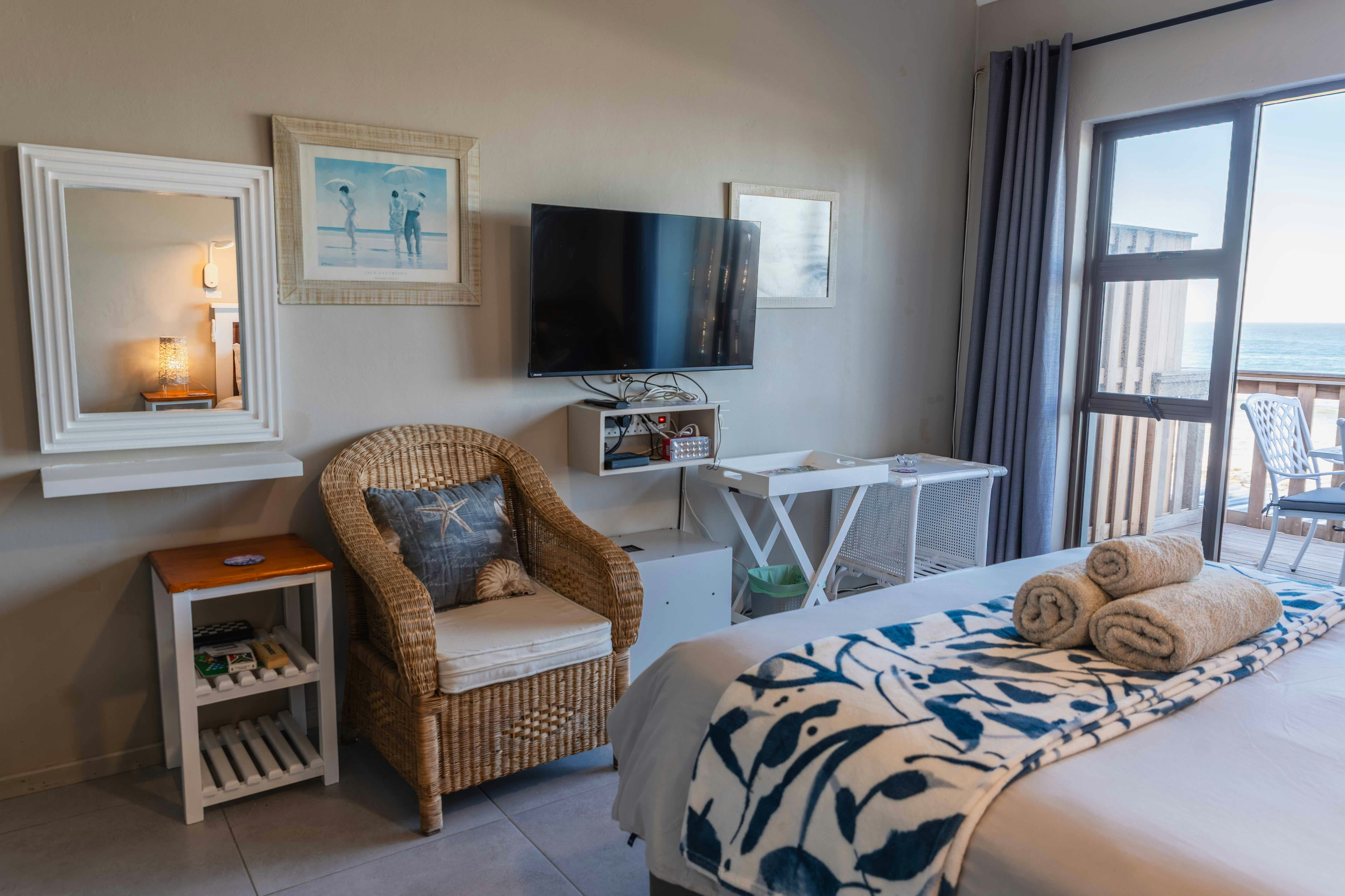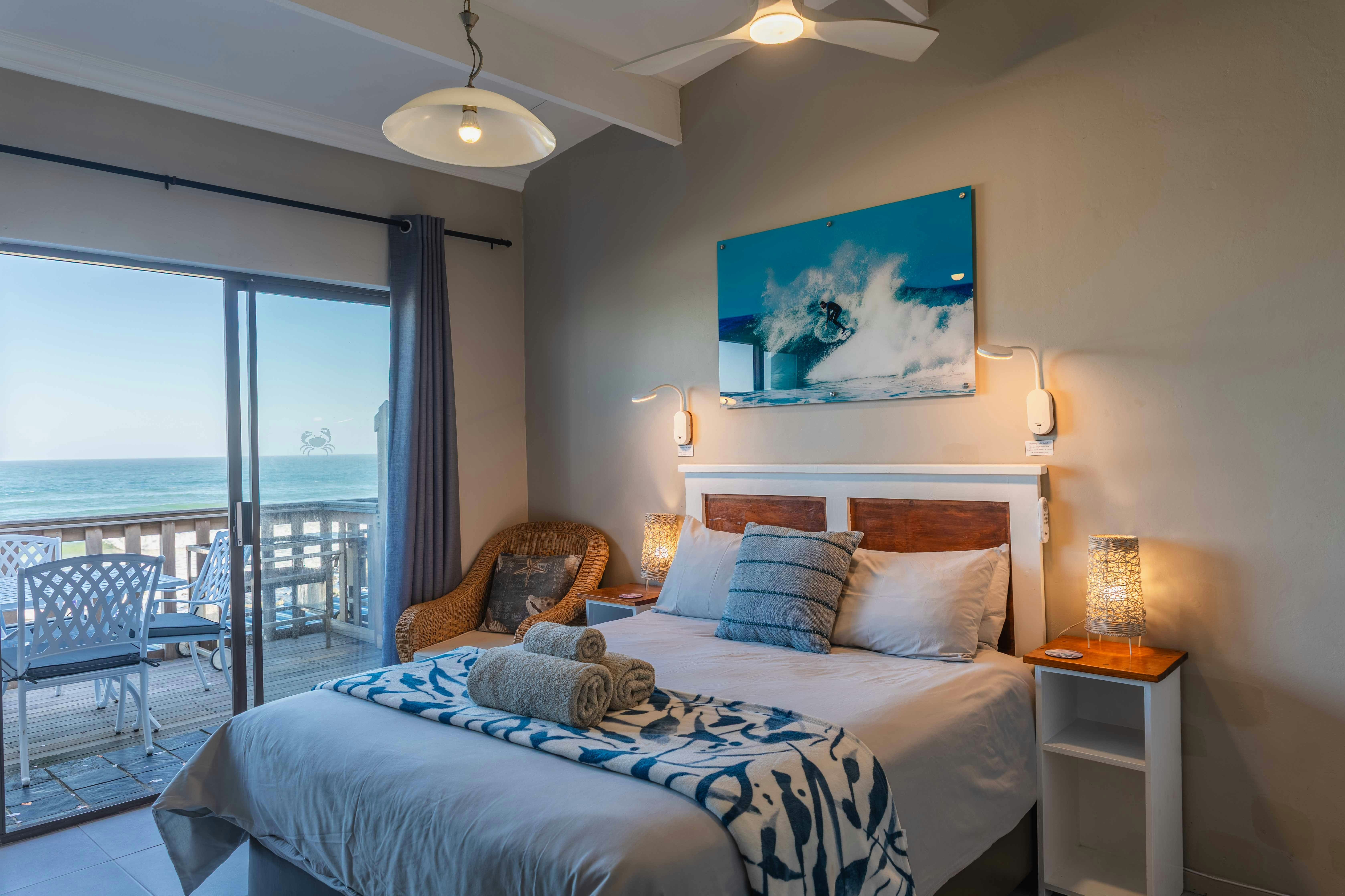 There are 2 comfy cane chairs and a TV with selected DStv channels in the bedroom. This unit also offers in-room facilities for tea and coffee, a microwave, air fryer, one-plate gas stove, refrigerator and a fan. Guests have access to a balcony that provides the perfect spot to relax and enjoy the sea breeze as well as a panoramic view of the Indian Ocean. There is a small charcoal braai on the balcony.